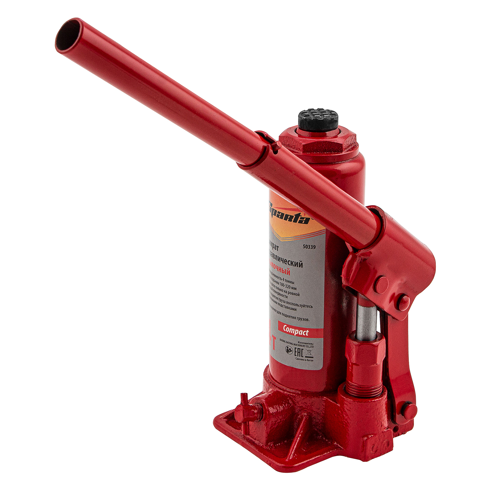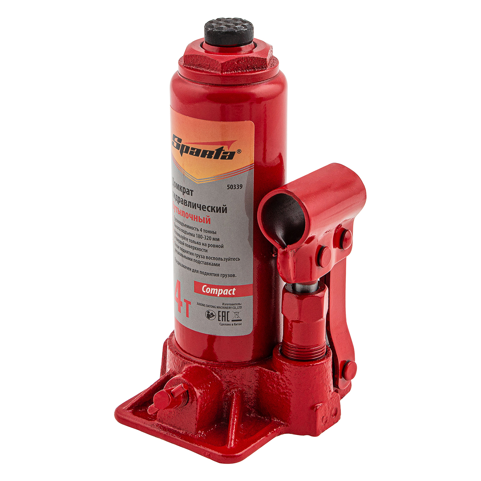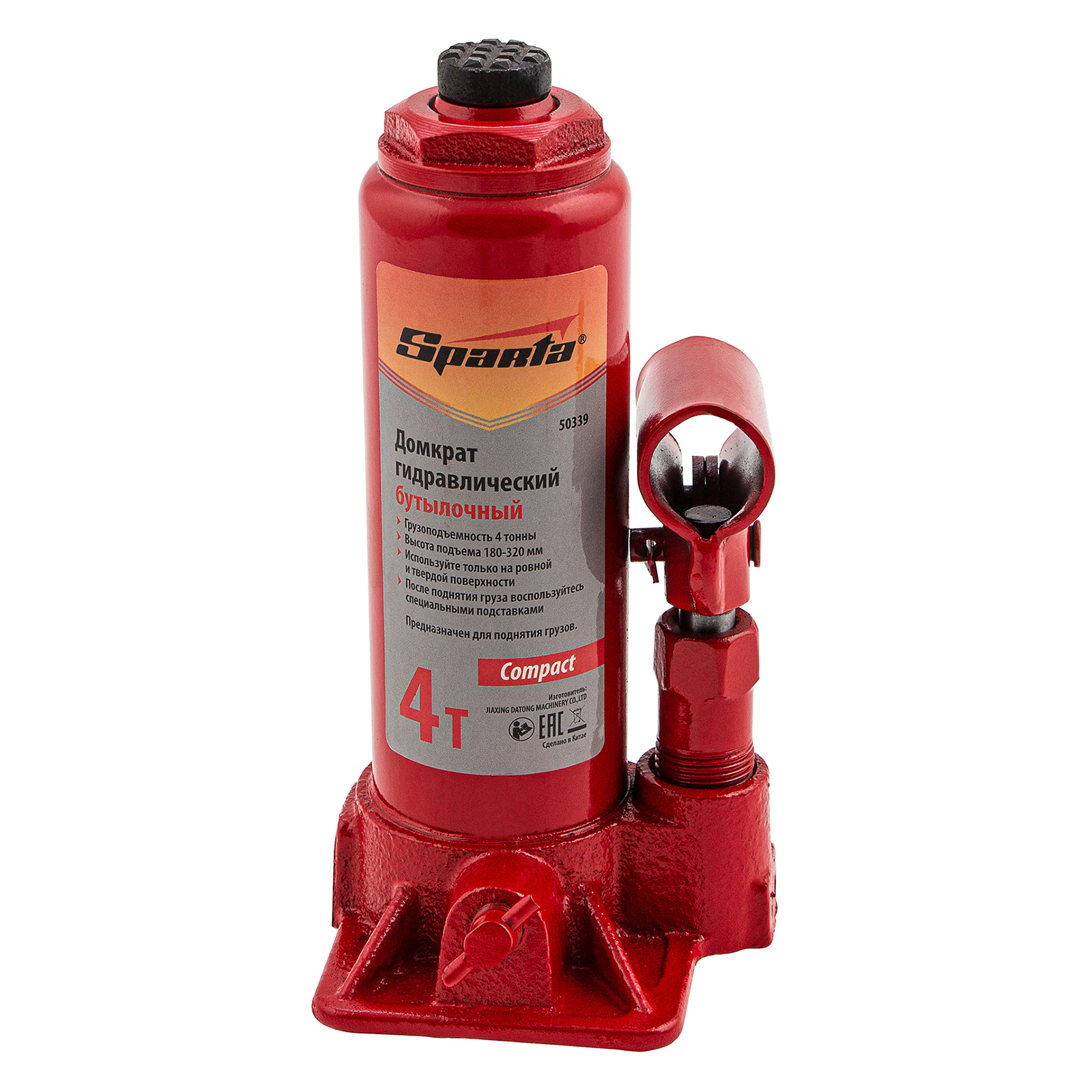 <p>Гидравлический бутылочный домкрат Sparta Compact 50339 предназначен для подъема грузов весом до 4 т на высоту от 180 до 320 мм. Не требует больших усилий от пользователя и значительно облегчает рабочий процесс. Домкрат будет полезен при техобслуживании машины в автосервисе или в гараже.</p><h2>Преимущества</h2><ul><li>Прочность и долговечность — корпус домкрата выполнен из стали, а основание — из чугуна.</li><li>Разборная конструкция — корпус крепится к станине при помощи резьбового соединения, поэтому его можно легко отремонтировать при необходимости.</li><li>Удобное хранение и транспортировка — домкрат весит всего 2,4 кг, а благодаря съемному рычагу не занимает много места.</li></ul>