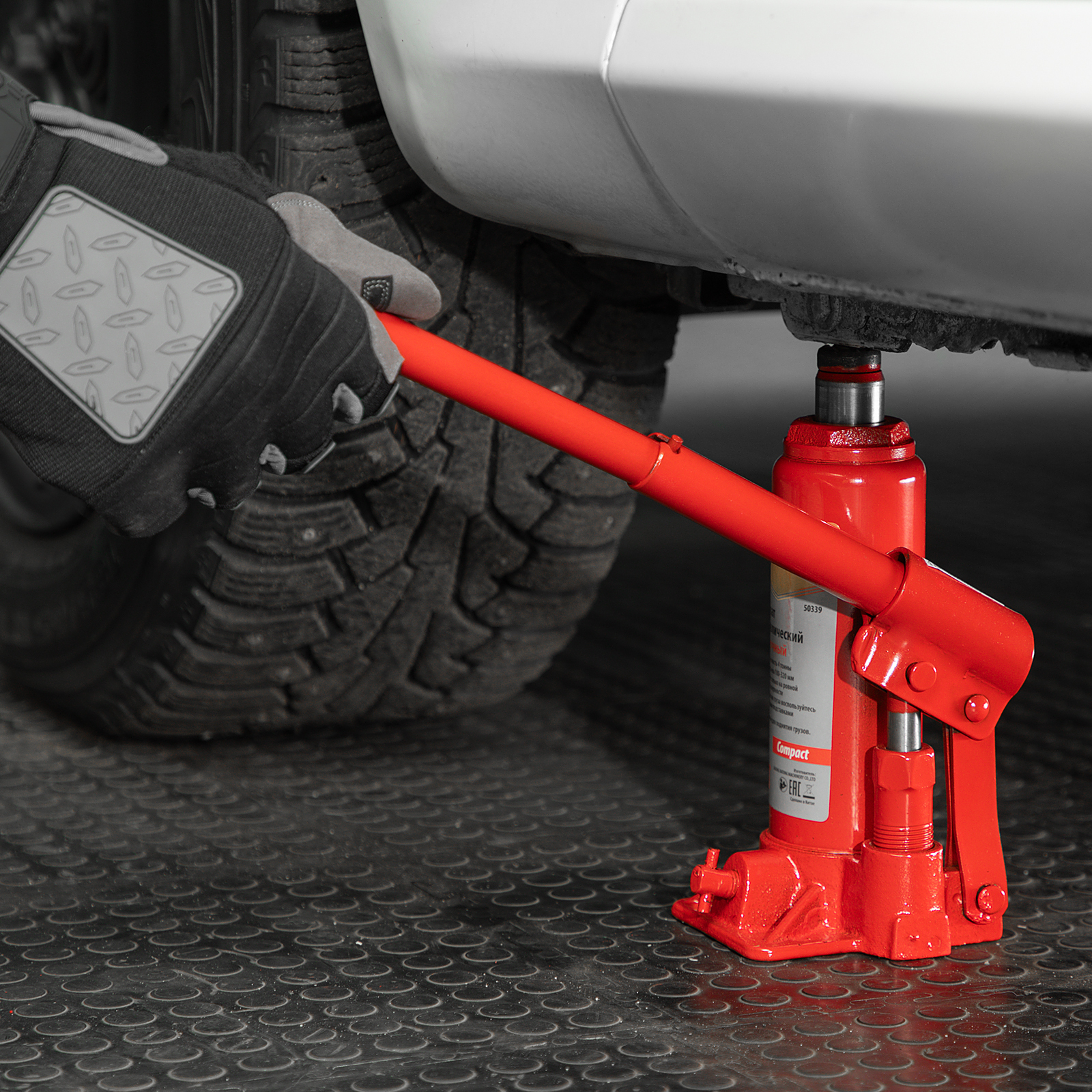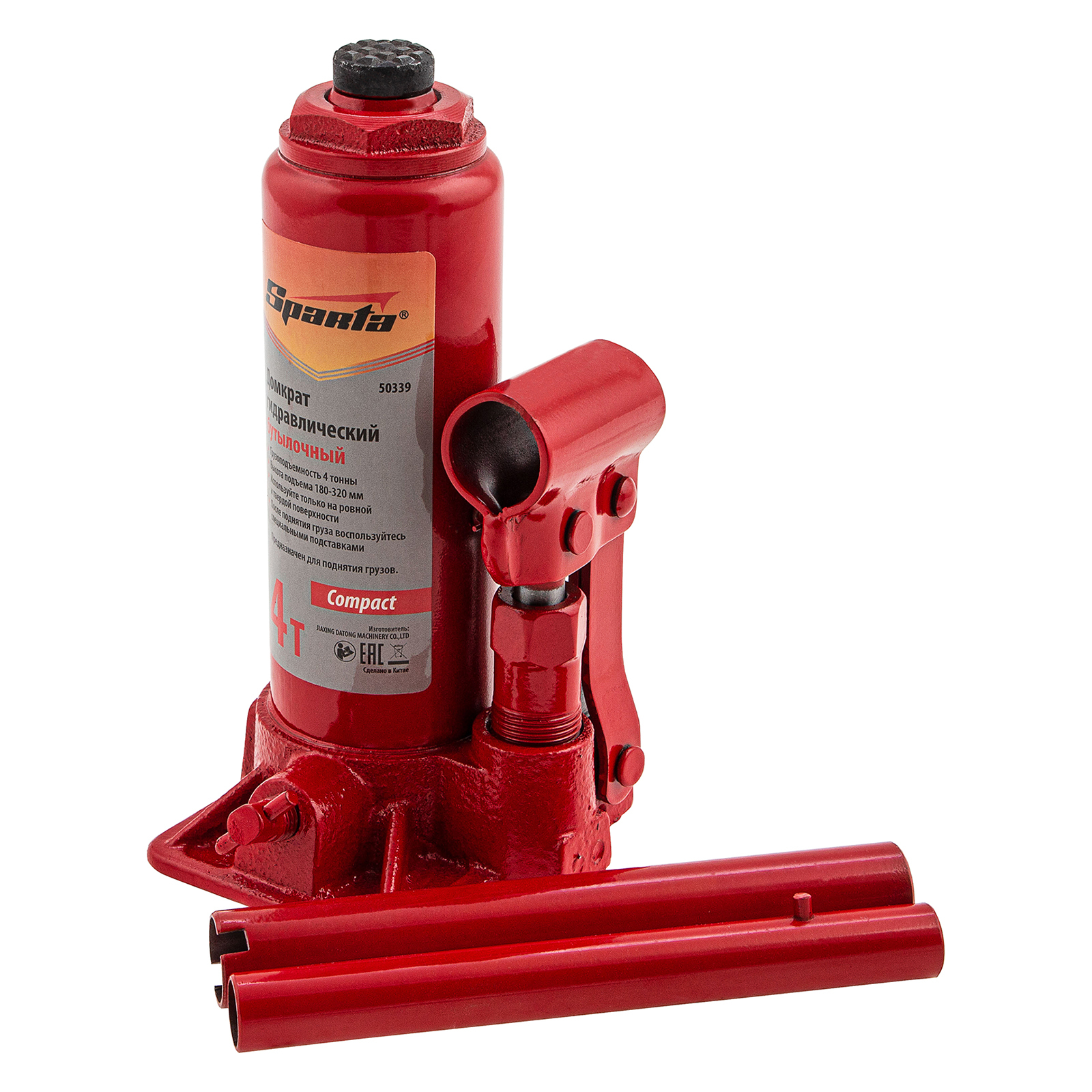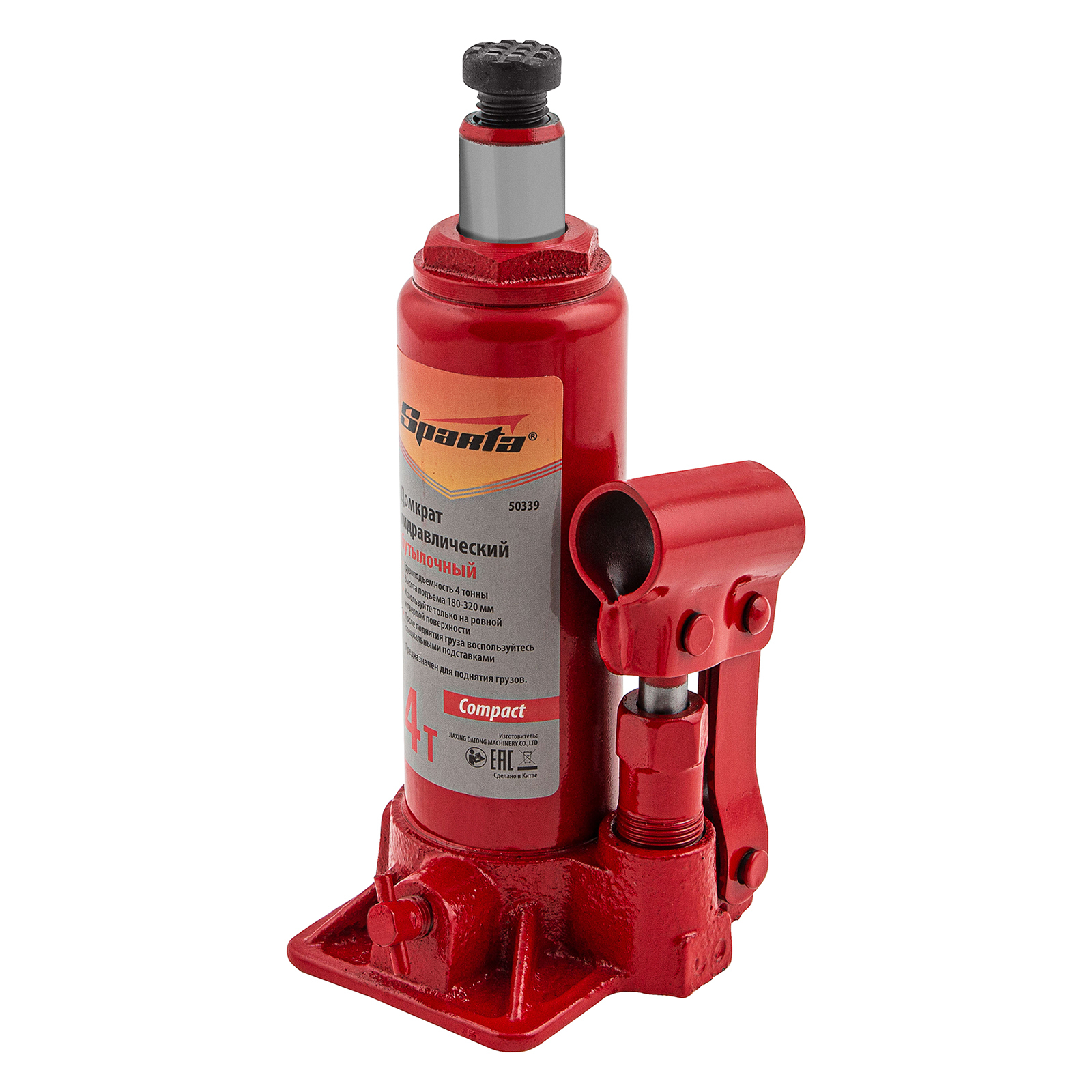 <p>Гидравлический бутылочный домкрат Sparta Compact 50339 предназначен для подъема грузов весом до 4 т на высоту от 180 до 320 мм. Не требует больших усилий от пользователя и значительно облегчает рабочий процесс. Домкрат будет полезен при техобслуживании машины в автосервисе или в гараже.</p><h2>Преимущества</h2><ul><li>Прочность и долговечность — корпус домкрата выполнен из стали, а основание — из чугуна.</li><li>Разборная конструкция — корпус крепится к станине при помощи резьбового соединения, поэтому его можно легко отремонтировать при необходимости.</li><li>Удобное хранение и транспортировка — домкрат весит всего 2,4 кг, а благодаря съемному рычагу не занимает много места.</li></ul>