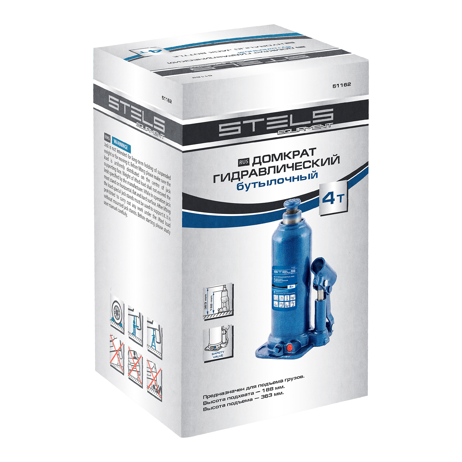 <p>Гидравлический бутылочный домкрат Stels 51162 применяется для быстрого поднятия грузов весом до 4 т на высоту 188-363 мм. Оптимален для автомобилей с большим клиренсом. Домкрат будет полезен автолюбителям и профессионалам для ремонта транспортного средства.</p><h2>Преимущества</h2><ul><li>Безопасная эксплуатация — благодаря предохранительному клапану домкрат не поднимает грузы тяжелее 4000 кг.</li><li>Прочность и долговечность — корпус выполнен из коррозионностойкой стали.</li><li>Надежная конструкция — домкрат не имеет резьбовых соединений, т.к. корпус приварен к станине.</li></ul>