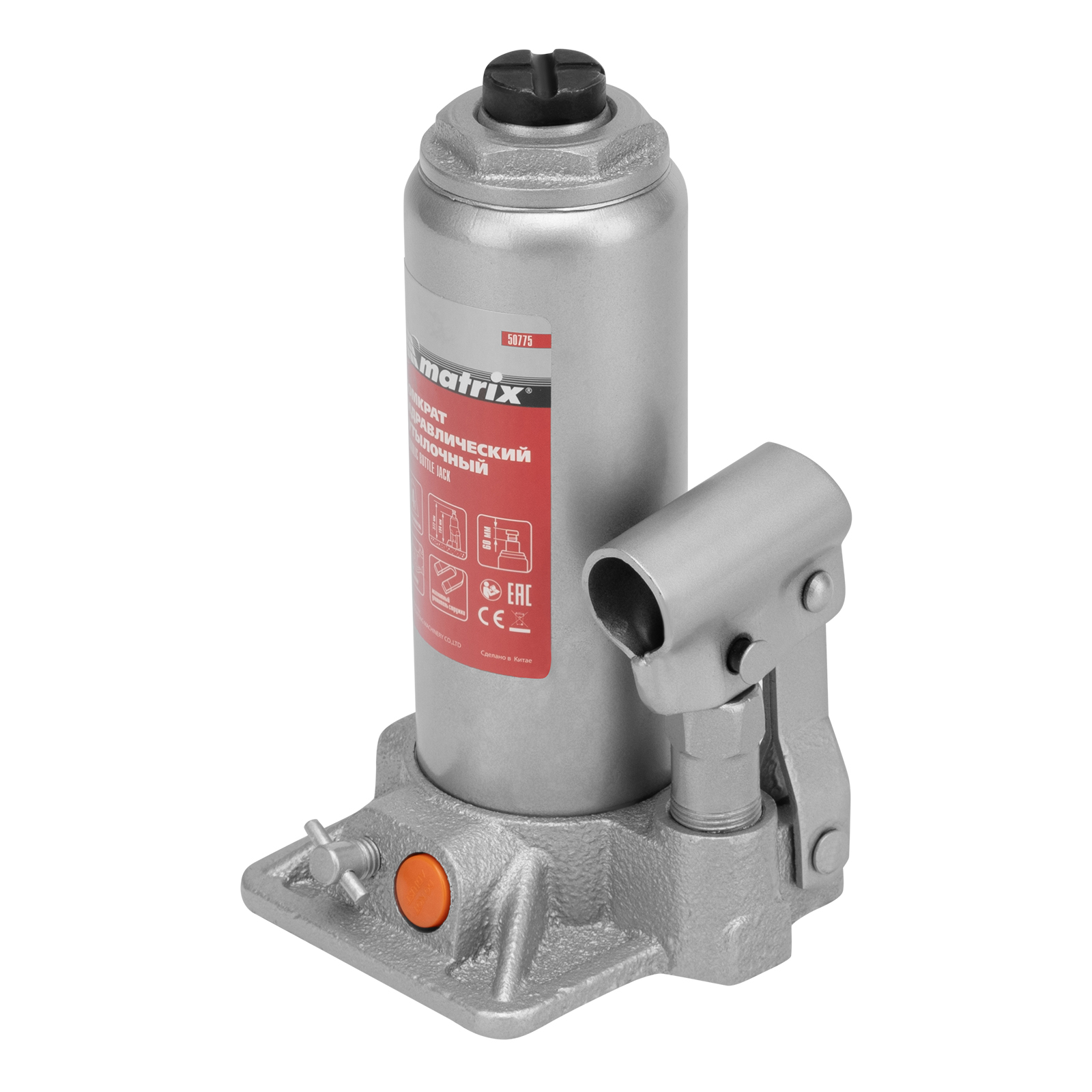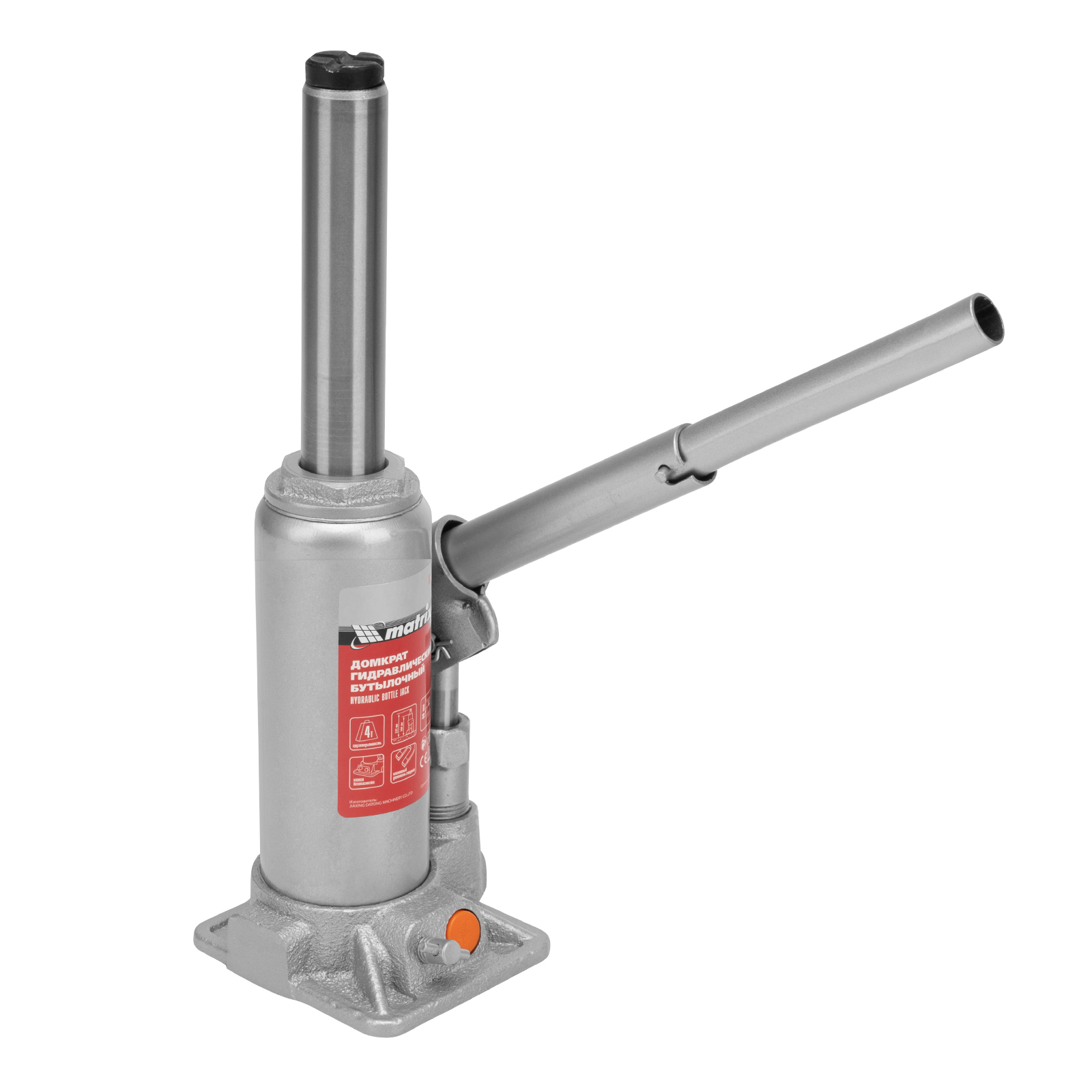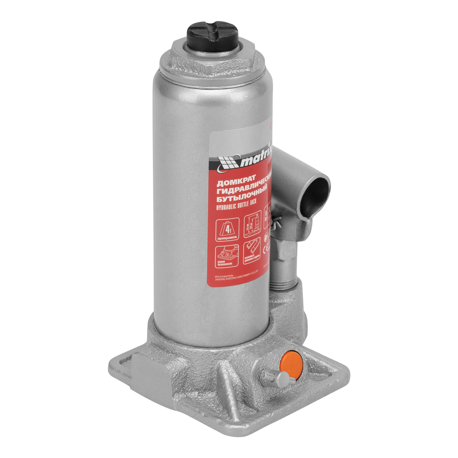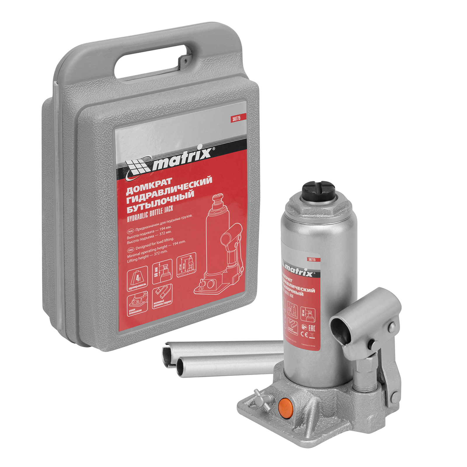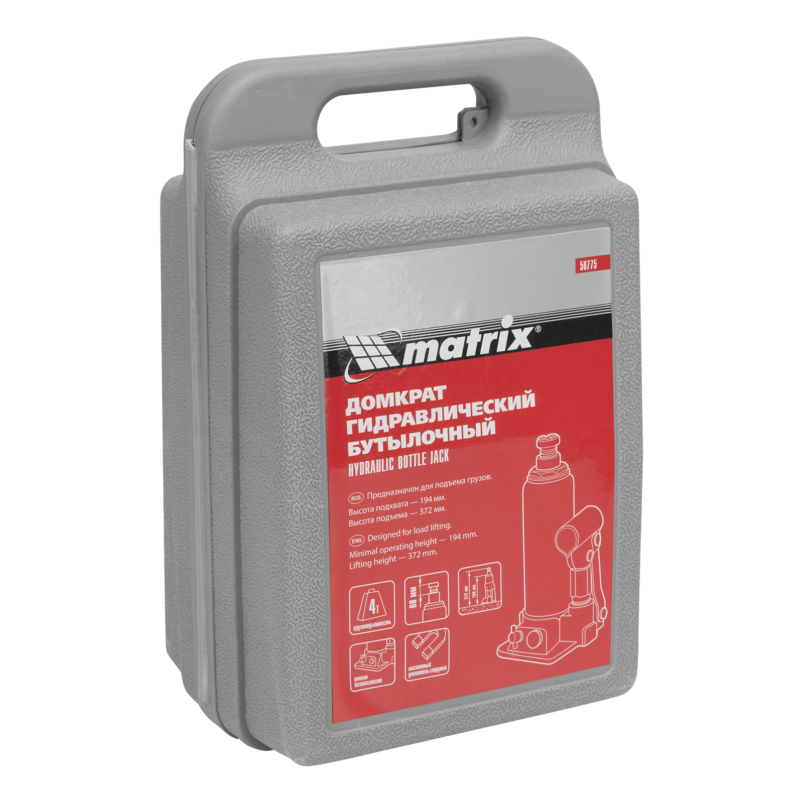 <p>Гидравлический бутылочный домкрат Matrix 50775 позволяет быстро поднимать грузы массой до 4 т на высоту 194-372 мм. Встроенный магнитный уловитель собирает металлическую стружку, предотвращая преждевременный износ резиновых уплотнителей. Домкрат пригодится для полупрофессионального применения.</p><h2>Преимущества</h2><ul><li>Безопасность — предохранительный клапан защищает домкрат от перегрузок, не позволяя поднимать автомобиль массой более 4000 кг.</li><li>Надежность и долговечность — устройство изготовлено из высокопрочной коррозионностойкой стали.</li><li>Разборная конструкция — корпус можно отсоединить от станины для ремонта или прочистки изделия.</li><li>Удобная транспортировка — домкрат комплектуется прочным пластиковым кейсом.</li></ul>