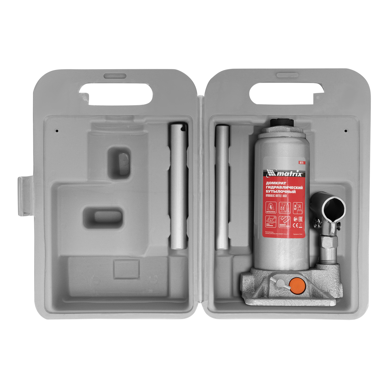 Домкрат гидравлический бутылочный, 4 т, h подъема 194-372 мм, в пластиковом кейсе Matrix