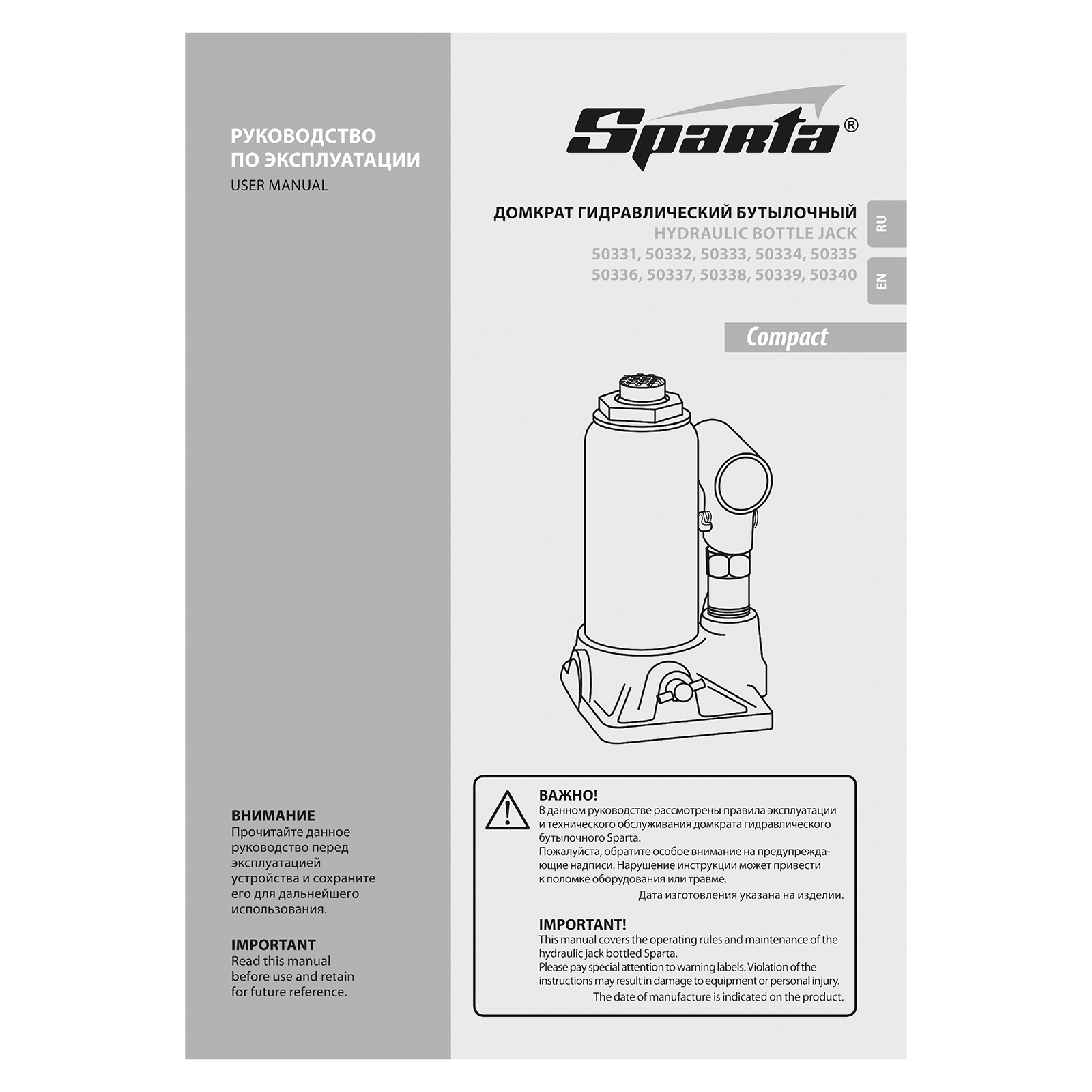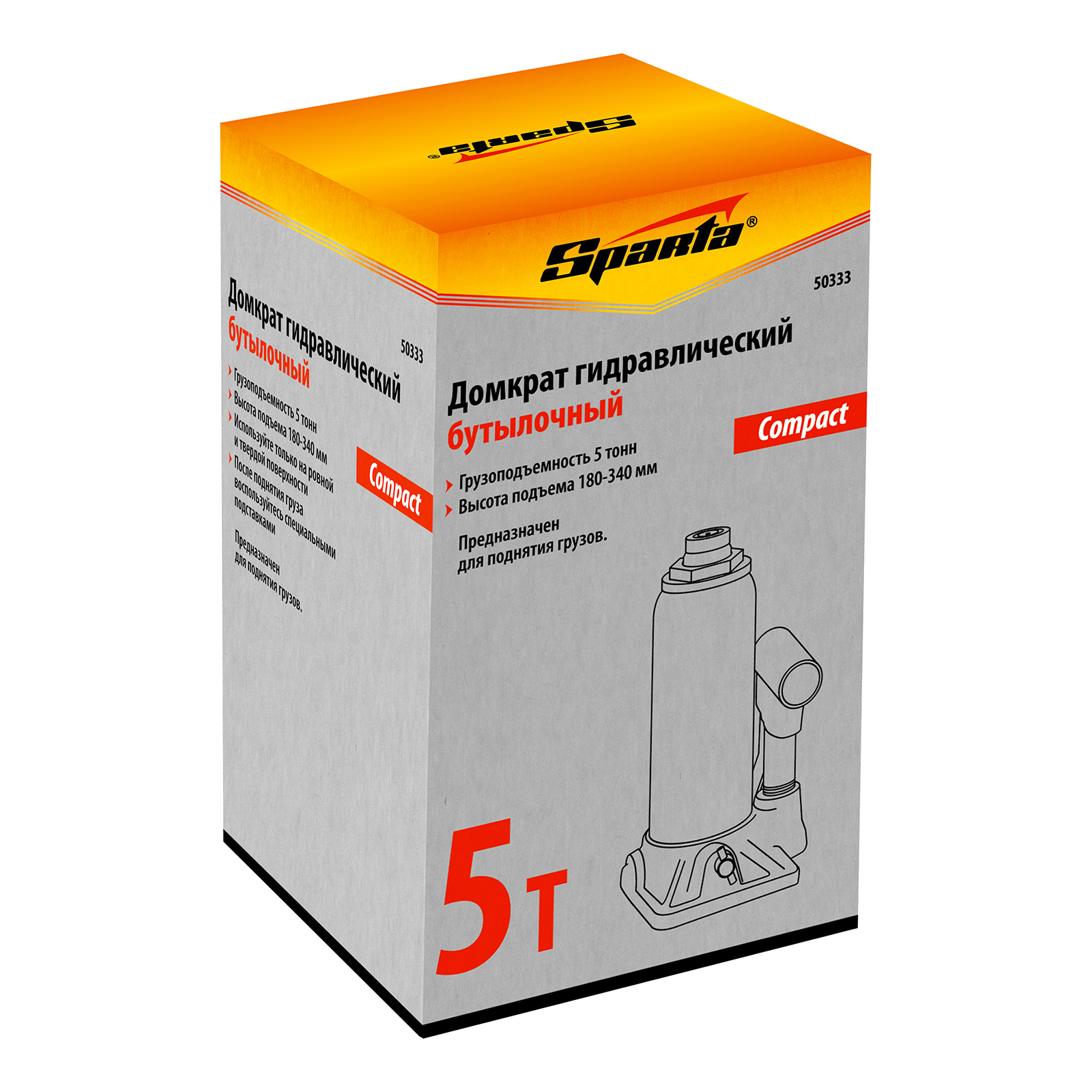 <p>Гидравлический бутылочный домкрат Sparta Compact 50333 предназначен для подъема грузов весом до 5 т на высоту 180-340 мм. Существенно облегчает рабочий процесс, т.к. не требует больших усилий от пользователя. Домкрат будет полезен в автосервисе и гараже для проведения технического обслуживания авто.</p><h2>Преимущества</h2><ul><li>Надежная конструкция — корпус домкрата выполнен из стали, а основание — из чугуна.</li><li>Ремонтопригодность — благодаря резьбовому соединению корпус легко снимается со станины.</li><li>Удобное хранение и транспортировка — домкрат весит 2,98 кг и не занимает много места благодаря съемному рычагу.</li></ul>