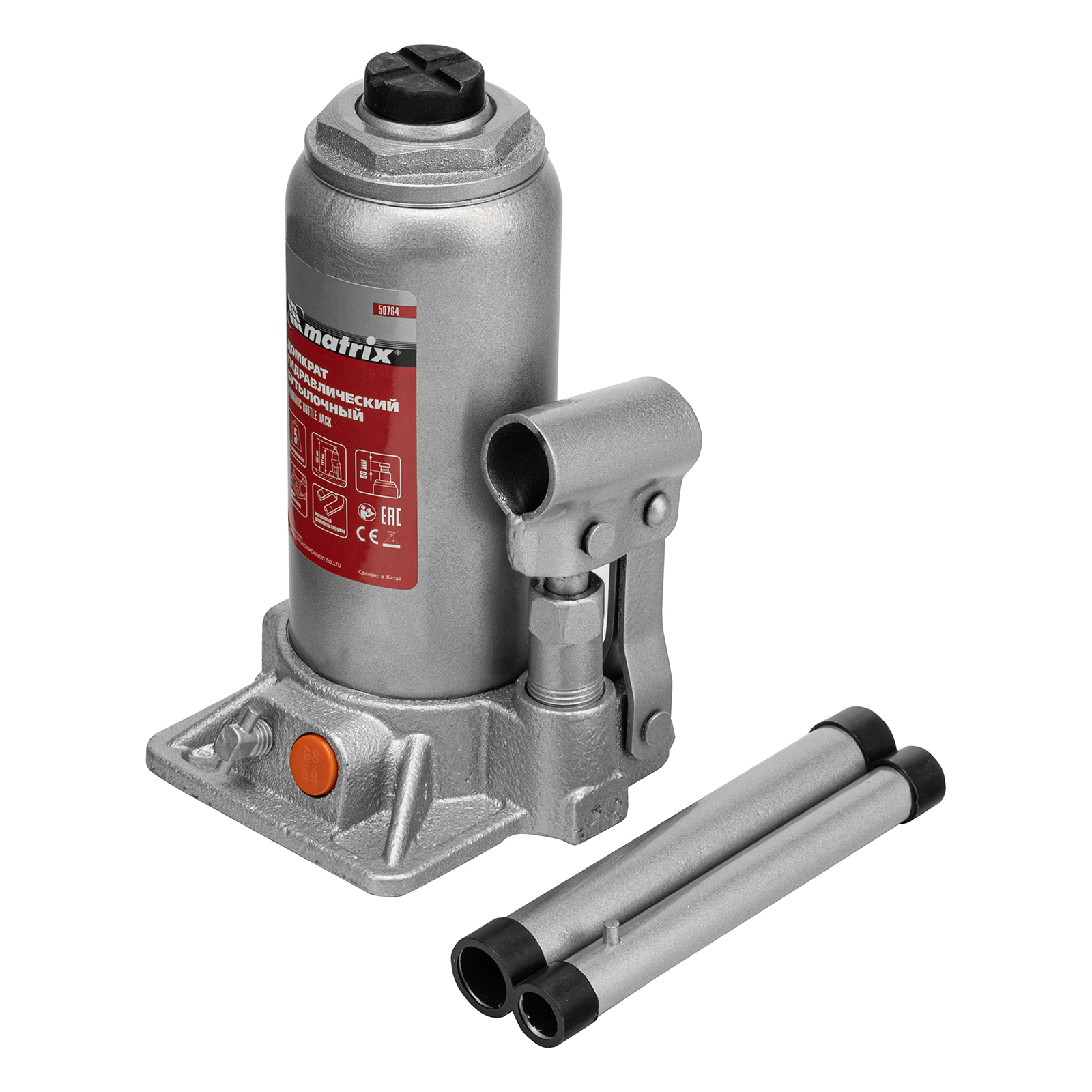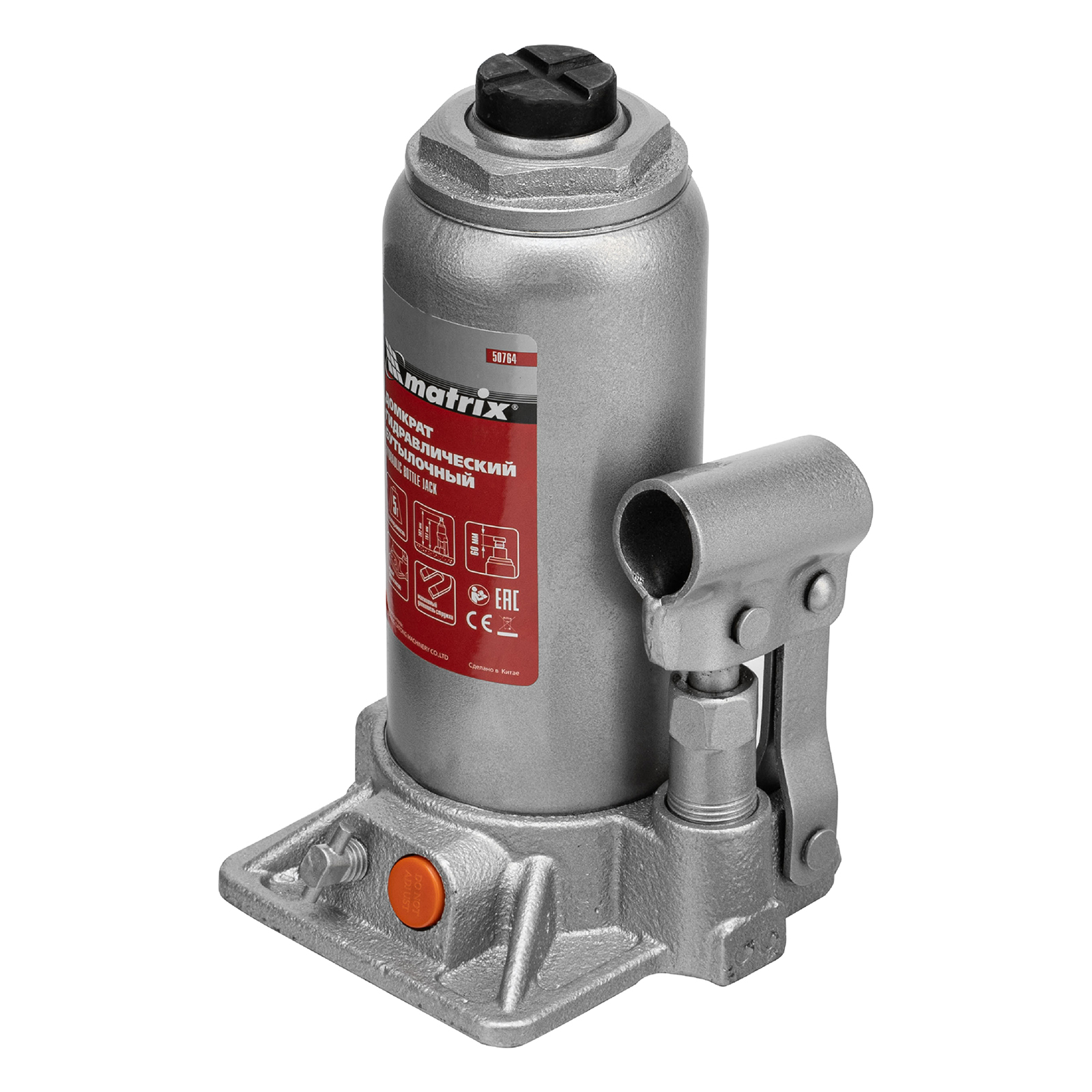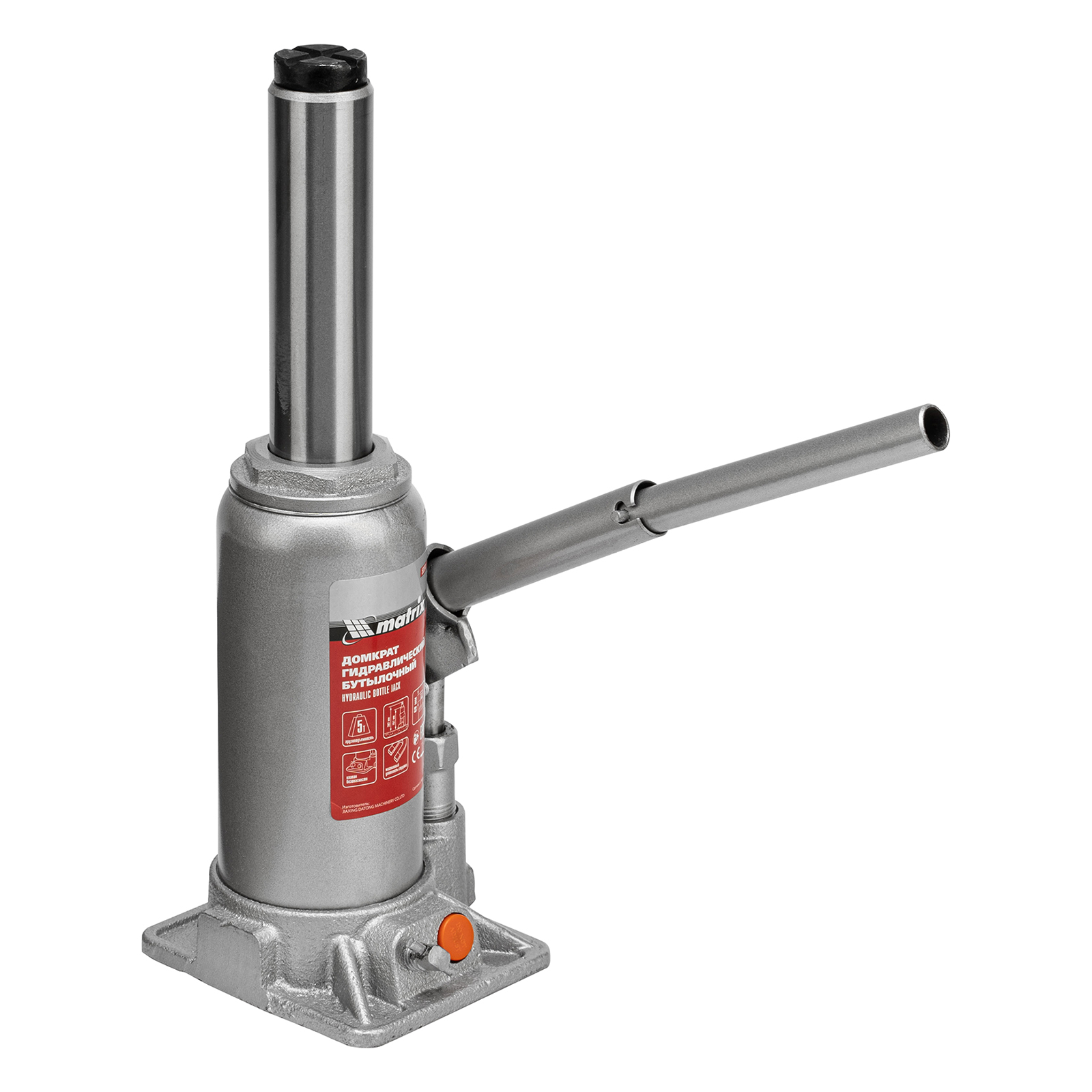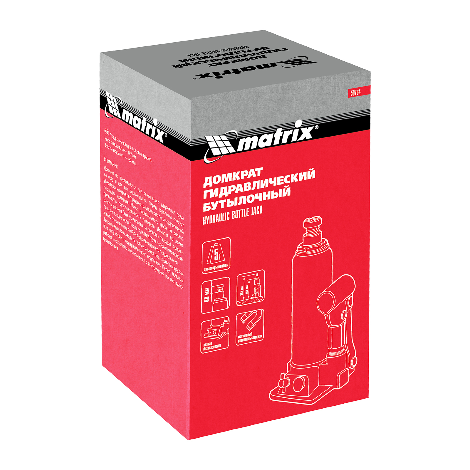 <p>Гидравлический бутылочный домкрат Matrix 50764 предназначен для быстрого поднятия грузов массой до 5 т на высоту 197-382 мм. Будет полезен автолюбителям и мастерам СТО в качестве полупрофессионального инструмента. Встроенный магнитный уловитель металлической стружки защищает резиновые уплотнители от повреждений.</p><h2>Преимущества</h2><ul><li>Защита от перегрузки — клапан безопасности не допускает поднятия груза массой более 5000 кг.</li><li>Надежность — подъемное устройство выполнено из прочной коррозионностойкой стали.</li><li>Разборный корпус — домкрат можно отремонтировать при необходимости.</li><li>Удобная транспортировка — домкрат весом 4,2 кг легко помещается в багажник авто.</li></ul>