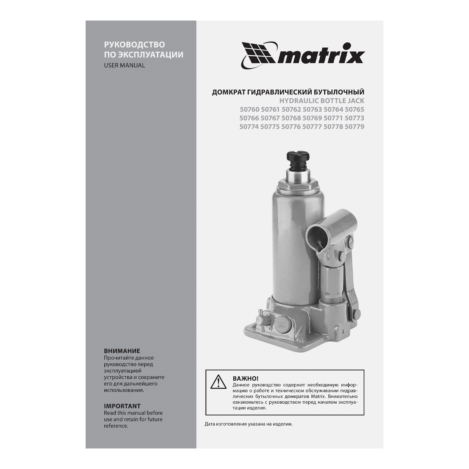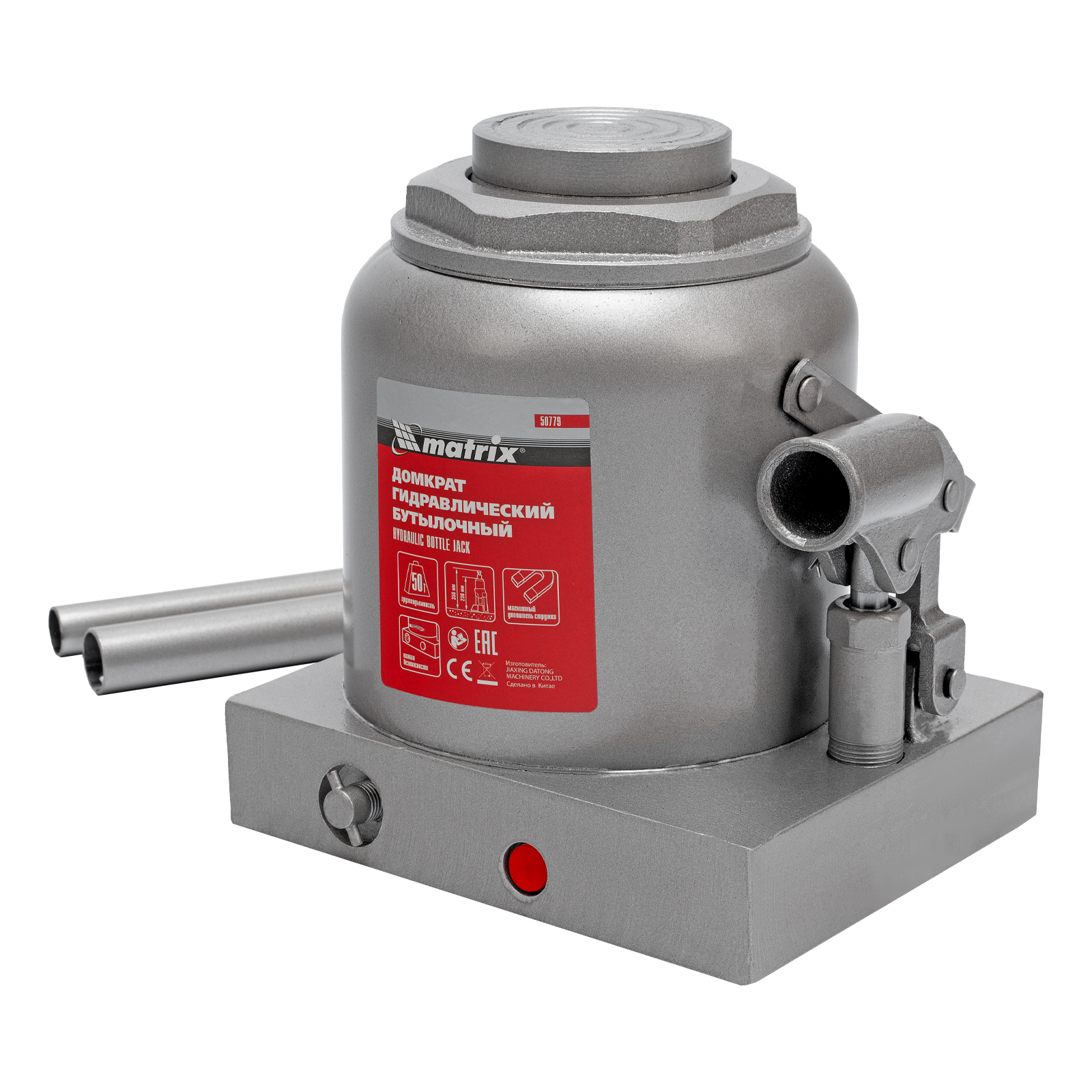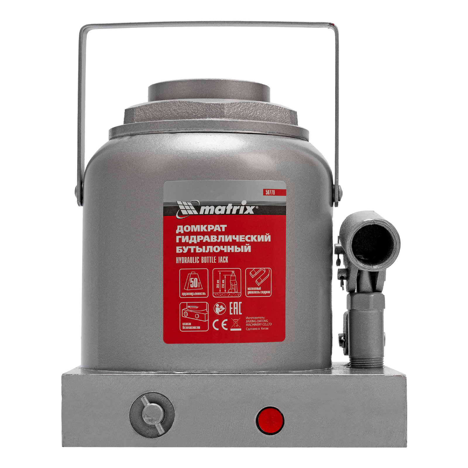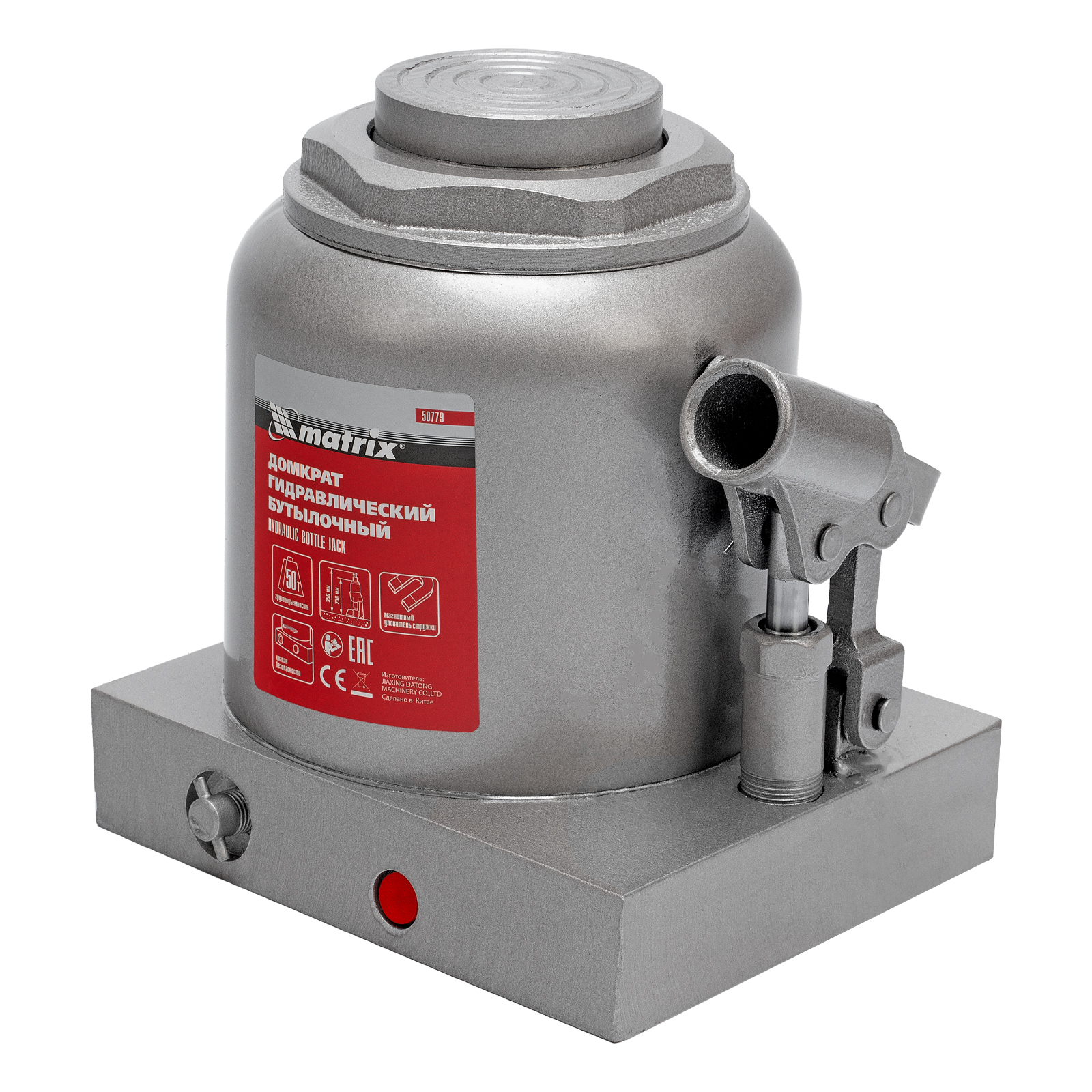 <p>Гидравлический бутылочный домкрат Matrix 50779 поднимает грузы весом до 50 т на высоту 236-356 мм и может использоваться в гараже, на станции ТО или строительной площадке. Встроенный магнитный уловитель собирает металлическую стружку, образующуюся в процессе работы, что защищает домкрат от преждевременного износа.</p><h2>Преимущества</h2><ul><li>Защита от перегрузок — благодаря клапану безопасности домкрат не поднимает грузы массой более 50 т.</li><li>Прочность и долговечность — домкрат из коррозионностойкой стали устойчив к высоким нагрузкам.</li><li>Разборная конструкция — подъемное устройство можно чистить и ремонтировать при необходимости.</li><li>Удобная транспортировка — приспособление весом 26,5 кг можно перевозить в багажнике авто.</li></ul>