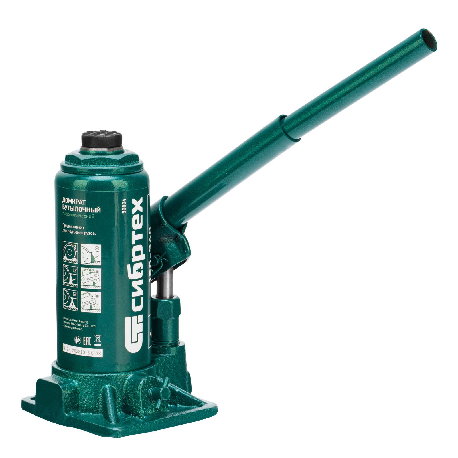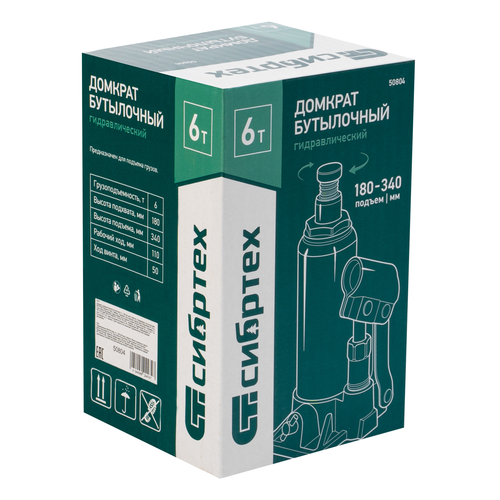 <p>Домкрат гидравлический бутылочный Сибртех 50804 предназначен для подъема грузов массой до 6 т на высоту от 180 до 340 мм. Не требует больших усилий от пользователя и значительно облегчает рабочий процесс. Домкрат будет полезен при проведении техобслуживания машины в автосервисе или гараже.</p><h2>Преимущества</h2><ul><li>Прочность и долговечность — корпус выполнен из стали, основание — из чугуна.</li><li>Разборная конструкция — корпус крепится к станине при помощи резьбового соединения, поэтому при необходимости домкрат можно отремонтировать.</li><li>Точная регулировка высоты подхвата — в конструкции предусмотрен выдвижной винт.</li><li>Удобное хранение и транспортировка — домкрат весит всего 2,8 кг, а благодаря съемному рычагу не занимает много места.</li></ul>