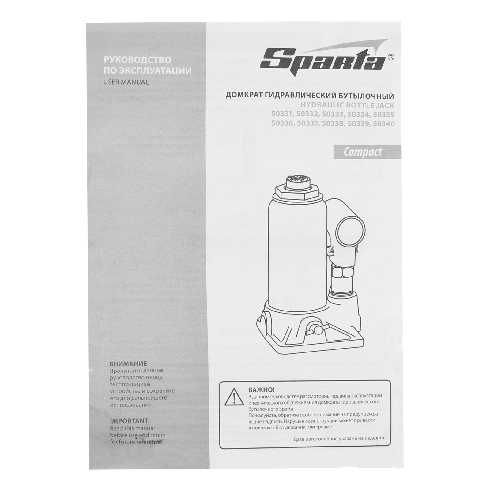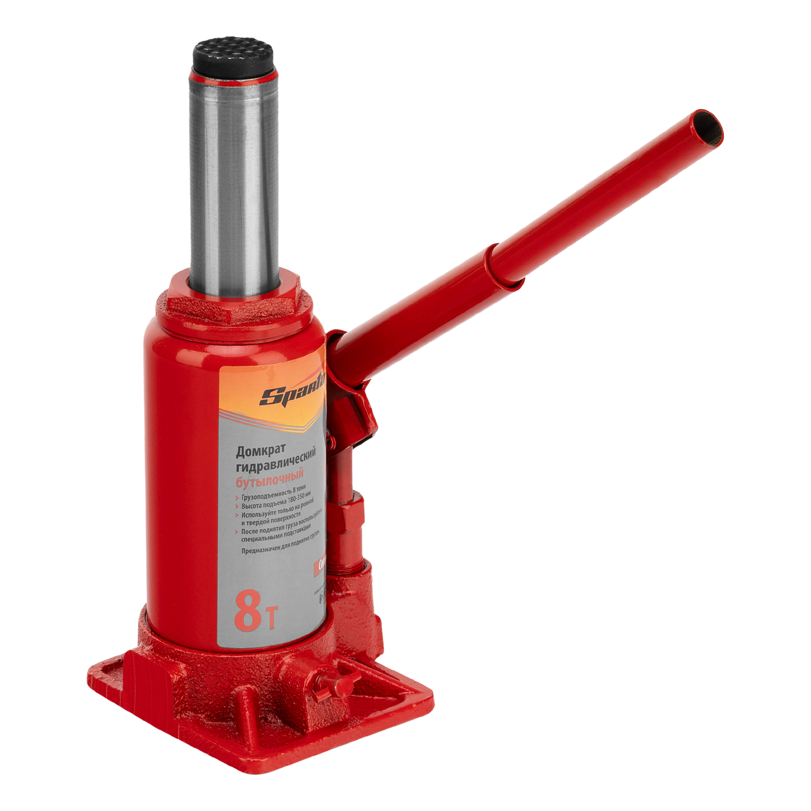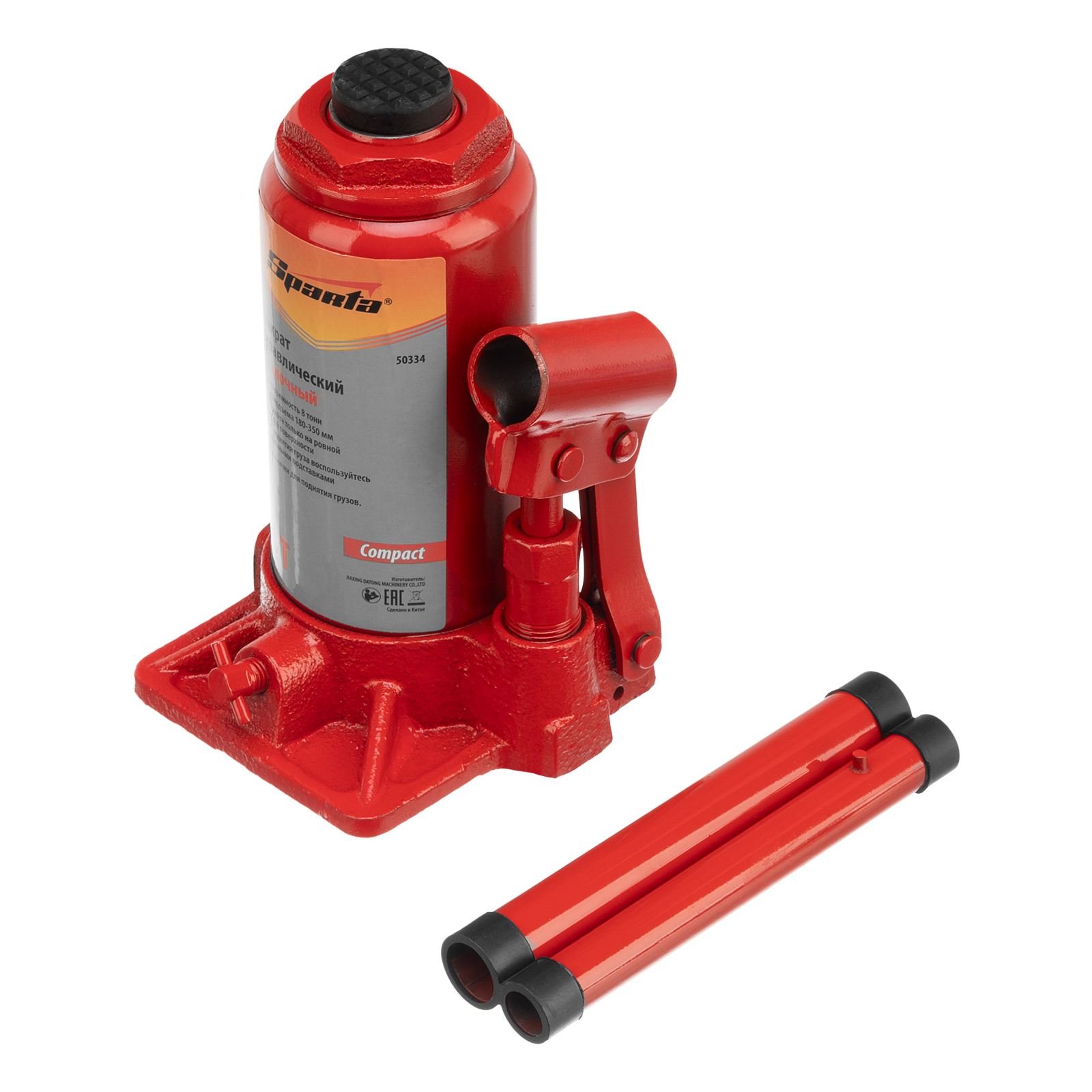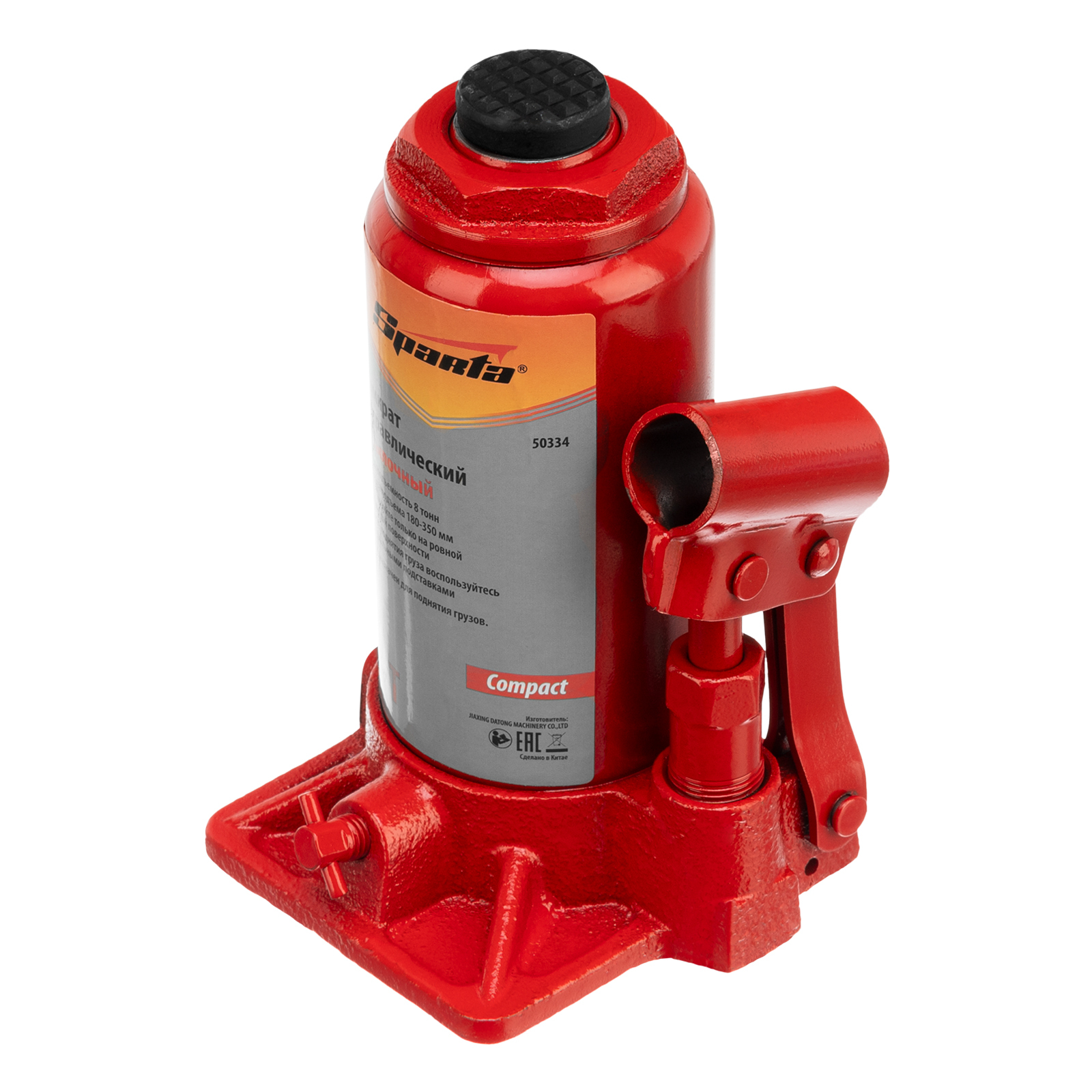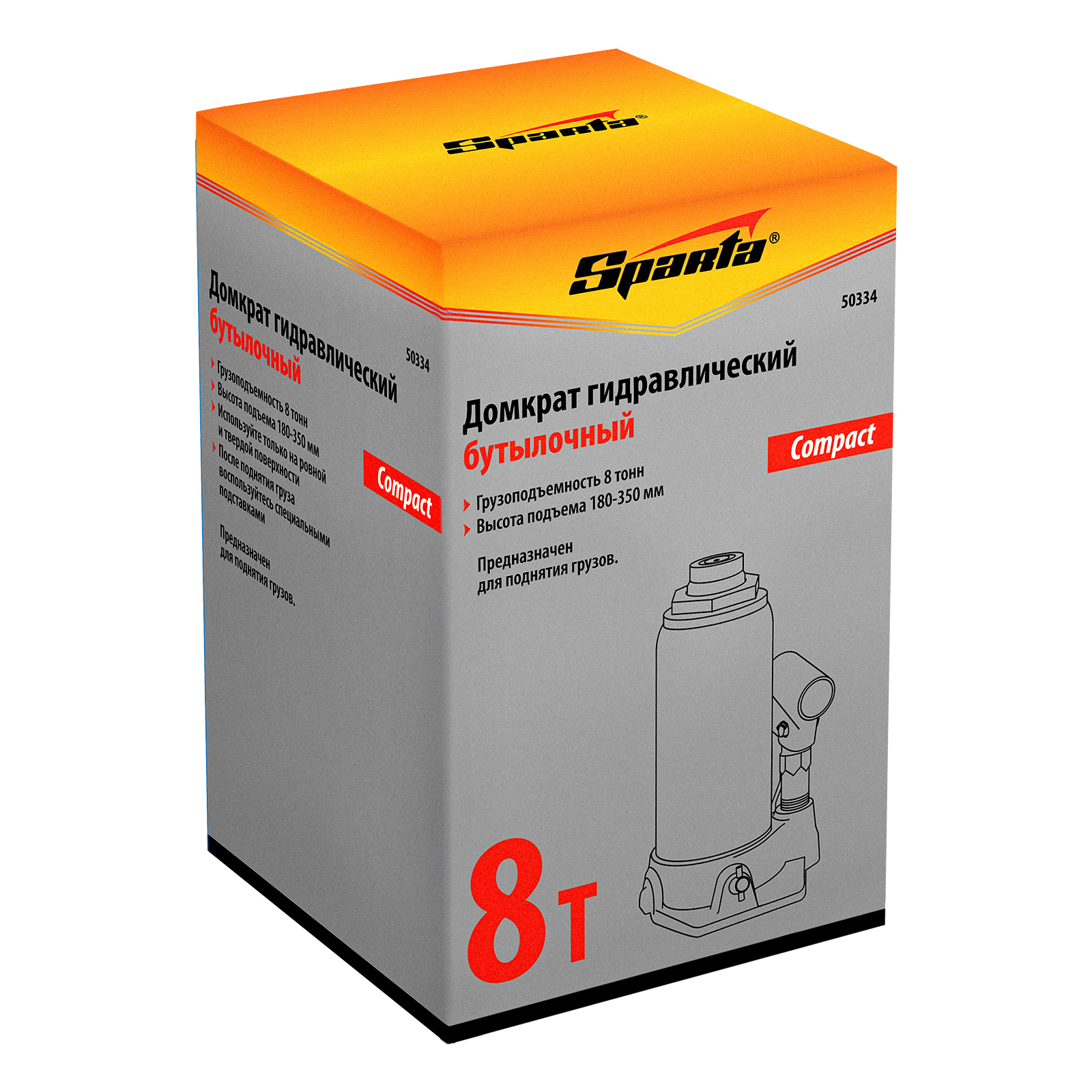<p>Гидравлический бутылочный домкрат Sparta Compact 50334 предназначен для подъема грузов весом до 8 т на высоту 180-350 мм. Существенно облегчает рабочий процесс, т.к. не требует больших усилий от пользователя. Домкрат будет полезен в автосервисе и гараже для проведения технического обслуживания авто.</p><h2>Преимущества</h2><ul><li>Надежная конструкция — корпус домкрата выполнен из стали, а основание — из чугуна.</li><li>Ремонтопригодность — благодаря резьбовому соединению корпус легко снимается со станины.</li><li>Удобное хранение и транспортировка — домкрат весит 3,58 кг и не занимает много места благодаря съемному рычагу.</li></ul>
