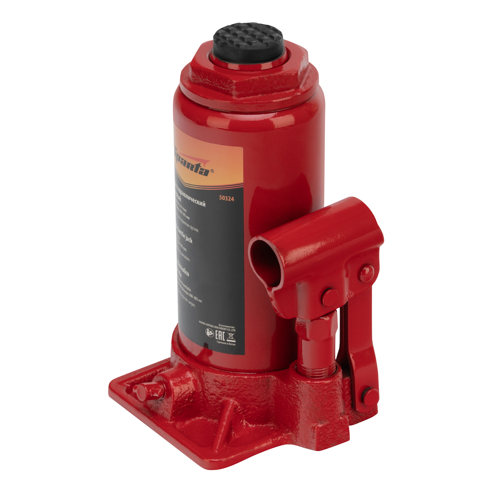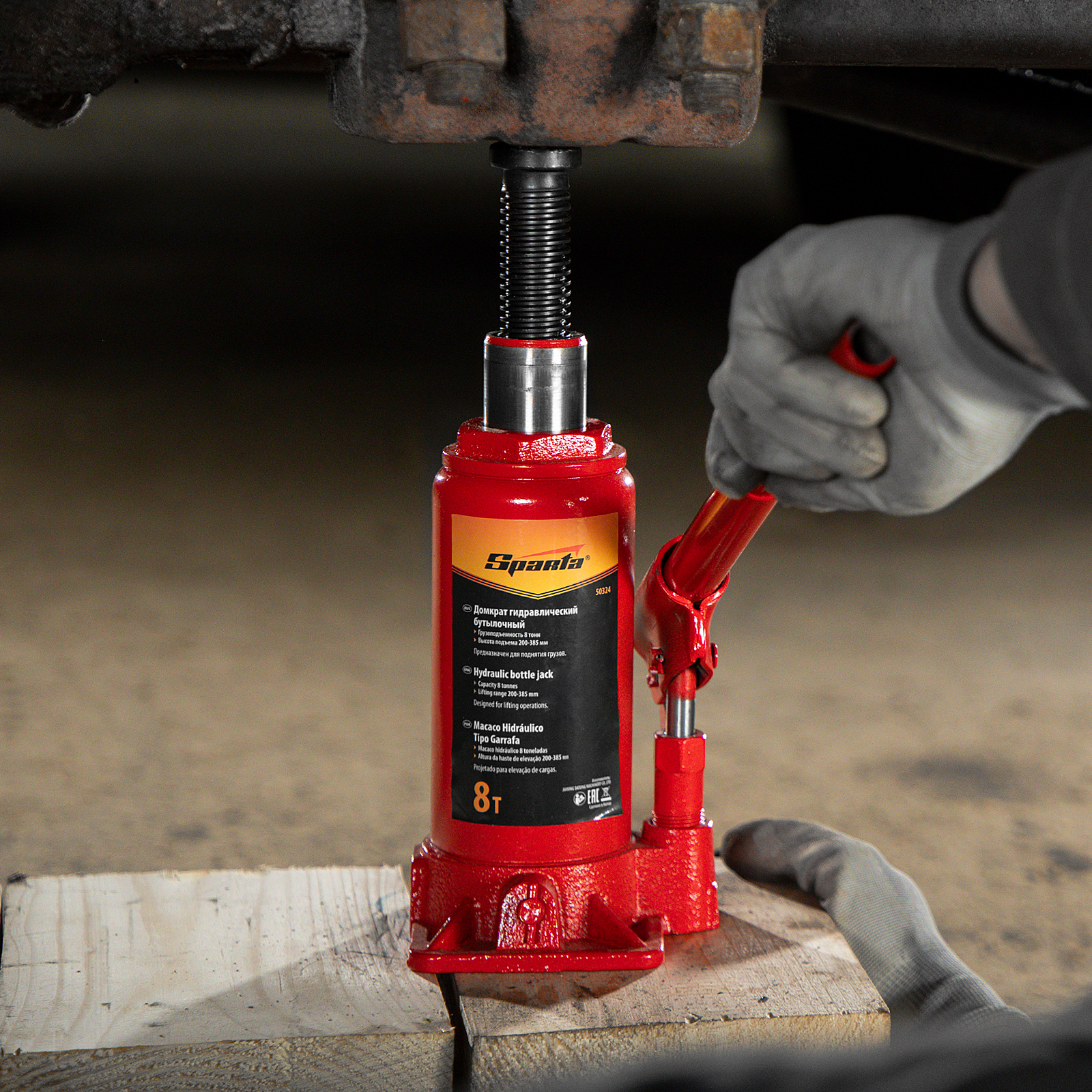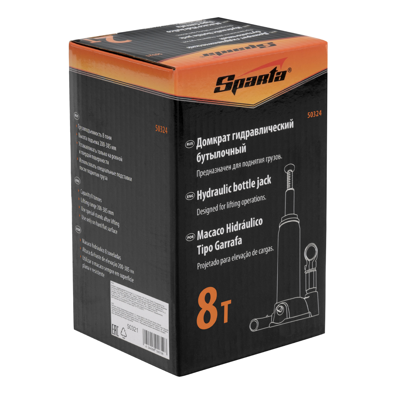 <p>Гидравлический бутылочный домкрат Sparta 50324 рассчитан на подъем грузов весом до 8 т на высоту от 200 до 385 мм. Он пригодится как автолюбителям в гараже, так и профессиональным мастерам в автосервисах. Домкрат обеспечивает плавный подъем груза без особых усилий со стороны пользователя.</p><h2>Преимущества</h2><ul><li>Надежность и долговечность — основание изготовлено из высокопрочного чугуна.</li><li>Ремонтопригодность — корпус крепится станине с помощью резьбового соединения.</li><li>Удобное хранение и транспортировка — домкрат оборудован съемным рычагом и весит 4,95 кг.</li></ul>