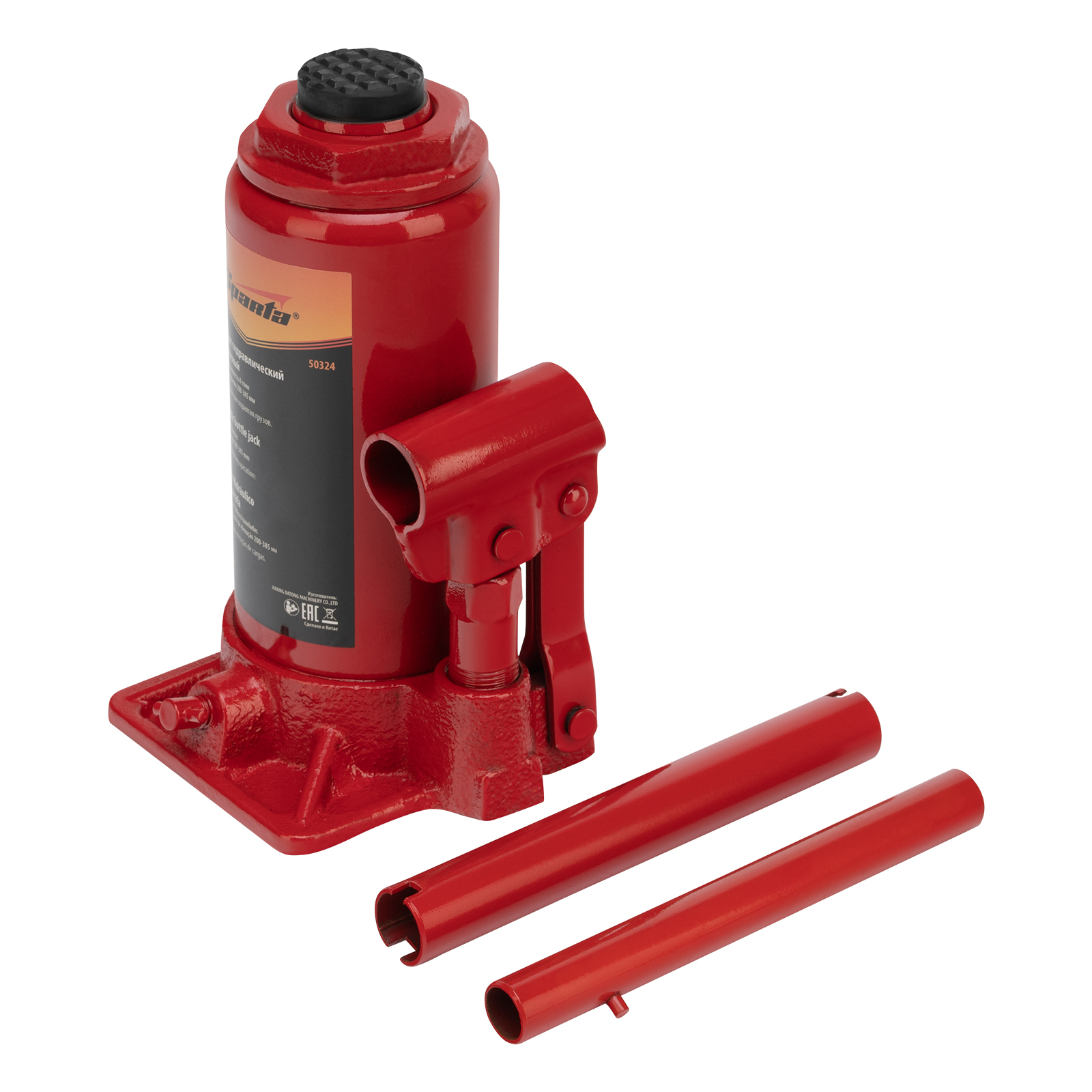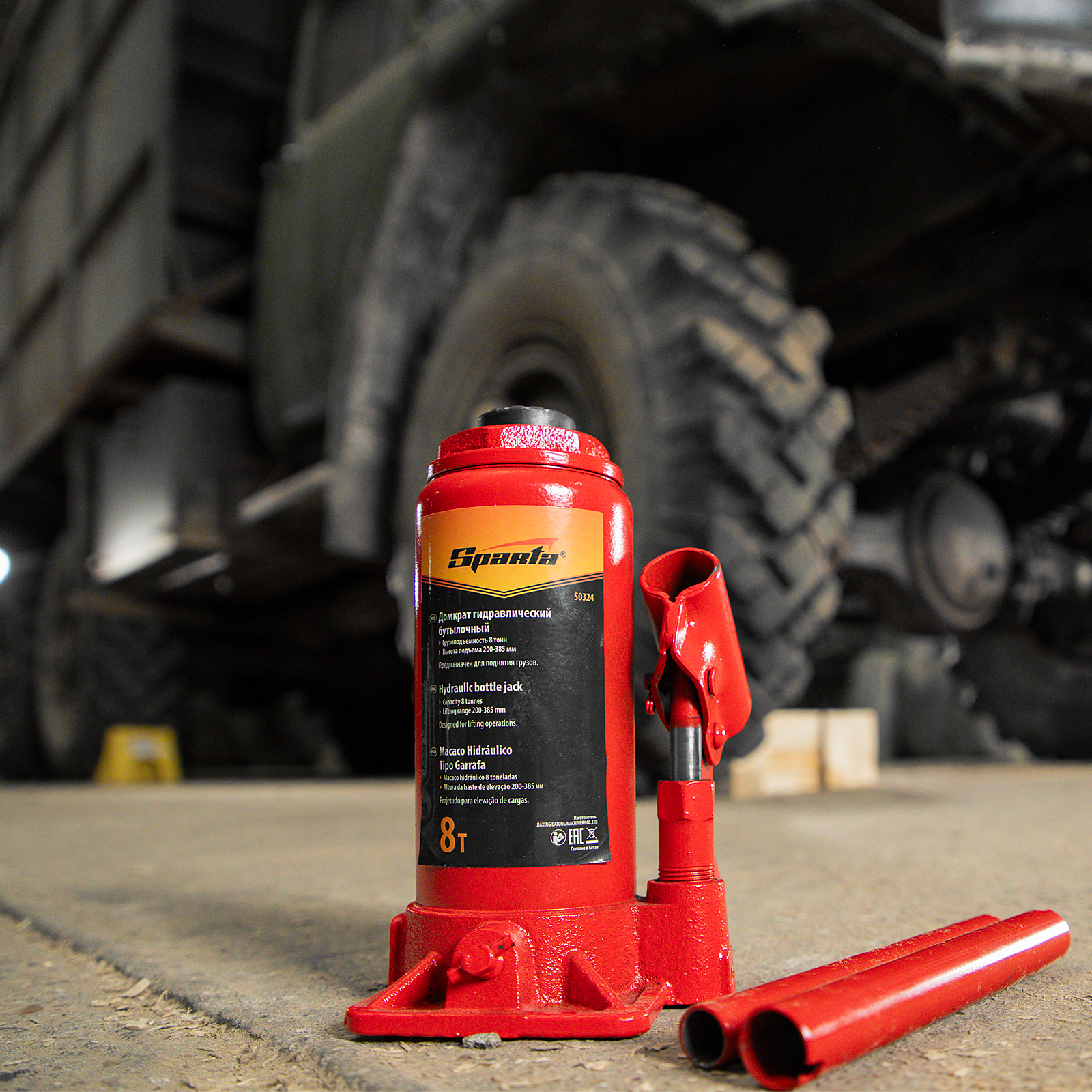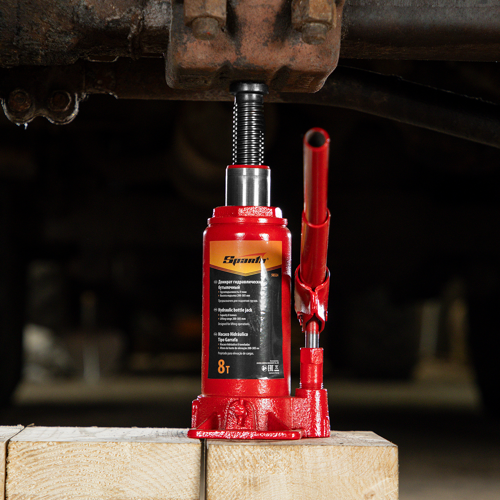 <p>Гидравлический бутылочный домкрат Sparta 50324 рассчитан на подъем грузов весом до 8 т на высоту от 200 до 385 мм. Он пригодится как автолюбителям в гараже, так и профессиональным мастерам в автосервисах. Домкрат обеспечивает плавный подъем груза без особых усилий со стороны пользователя.</p><h2>Преимущества</h2><ul><li>Надежность и долговечность — основание изготовлено из высокопрочного чугуна.</li><li>Ремонтопригодность — корпус крепится станине с помощью резьбового соединения.</li><li>Удобное хранение и транспортировка — домкрат оборудован съемным рычагом и весит 4,95 кг.</li></ul>