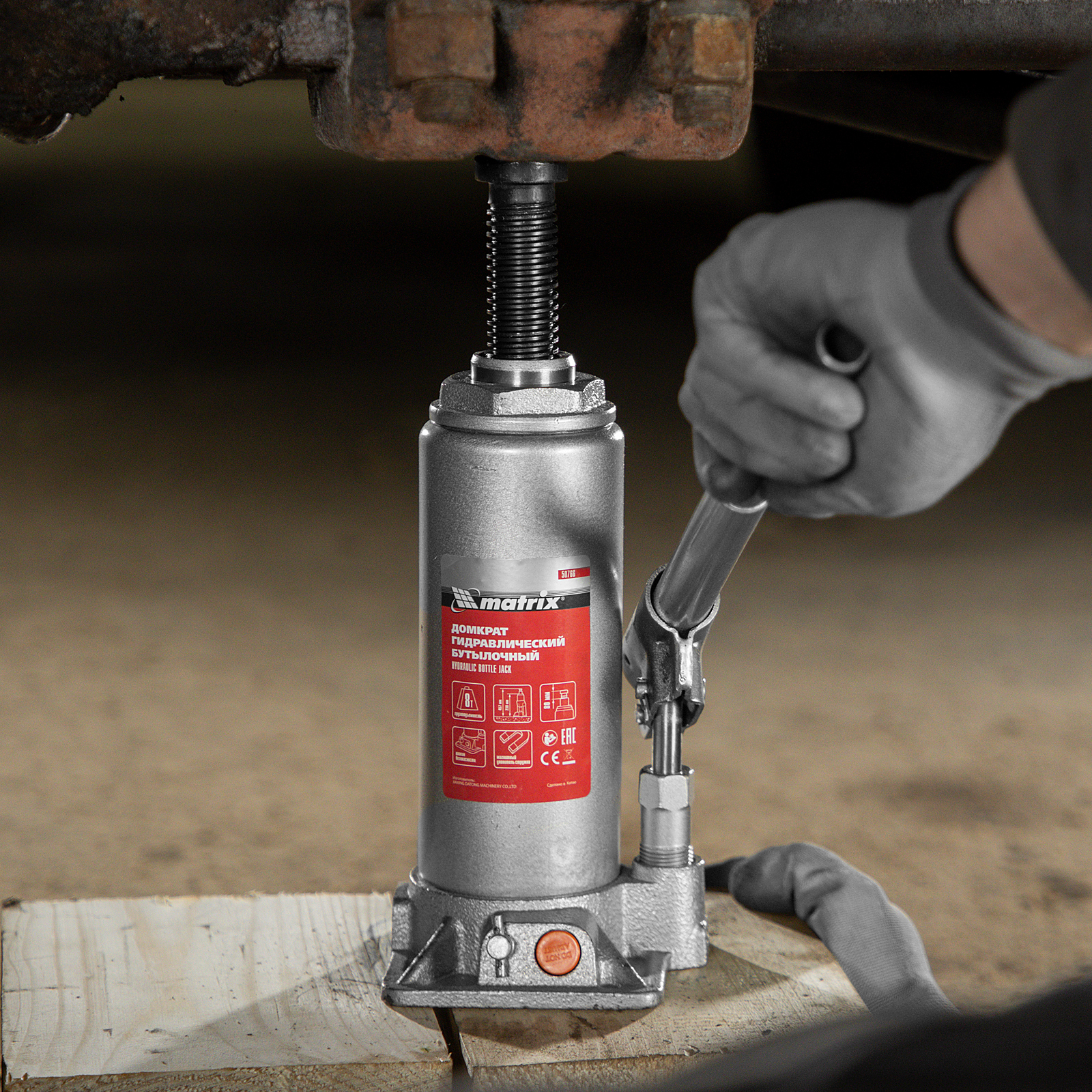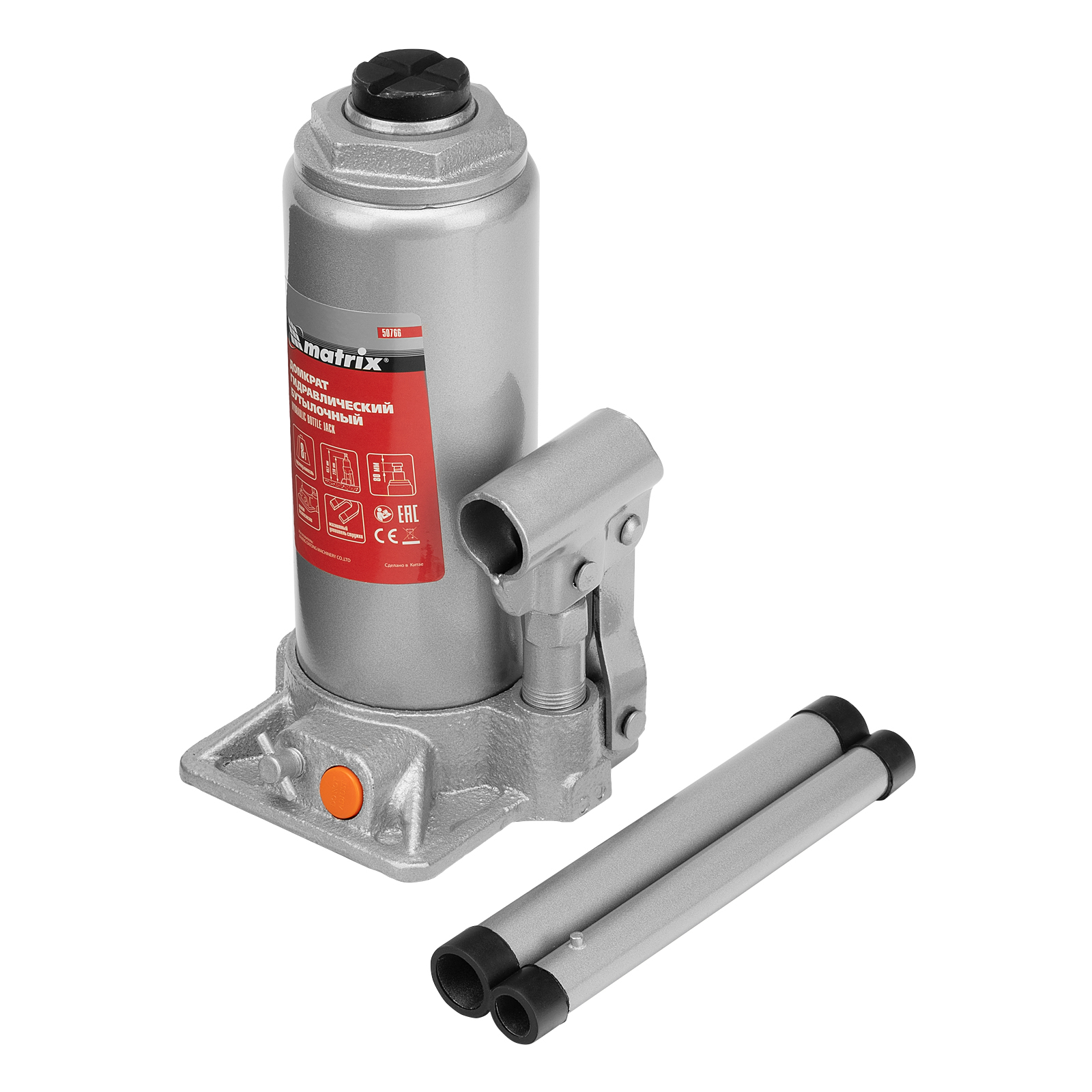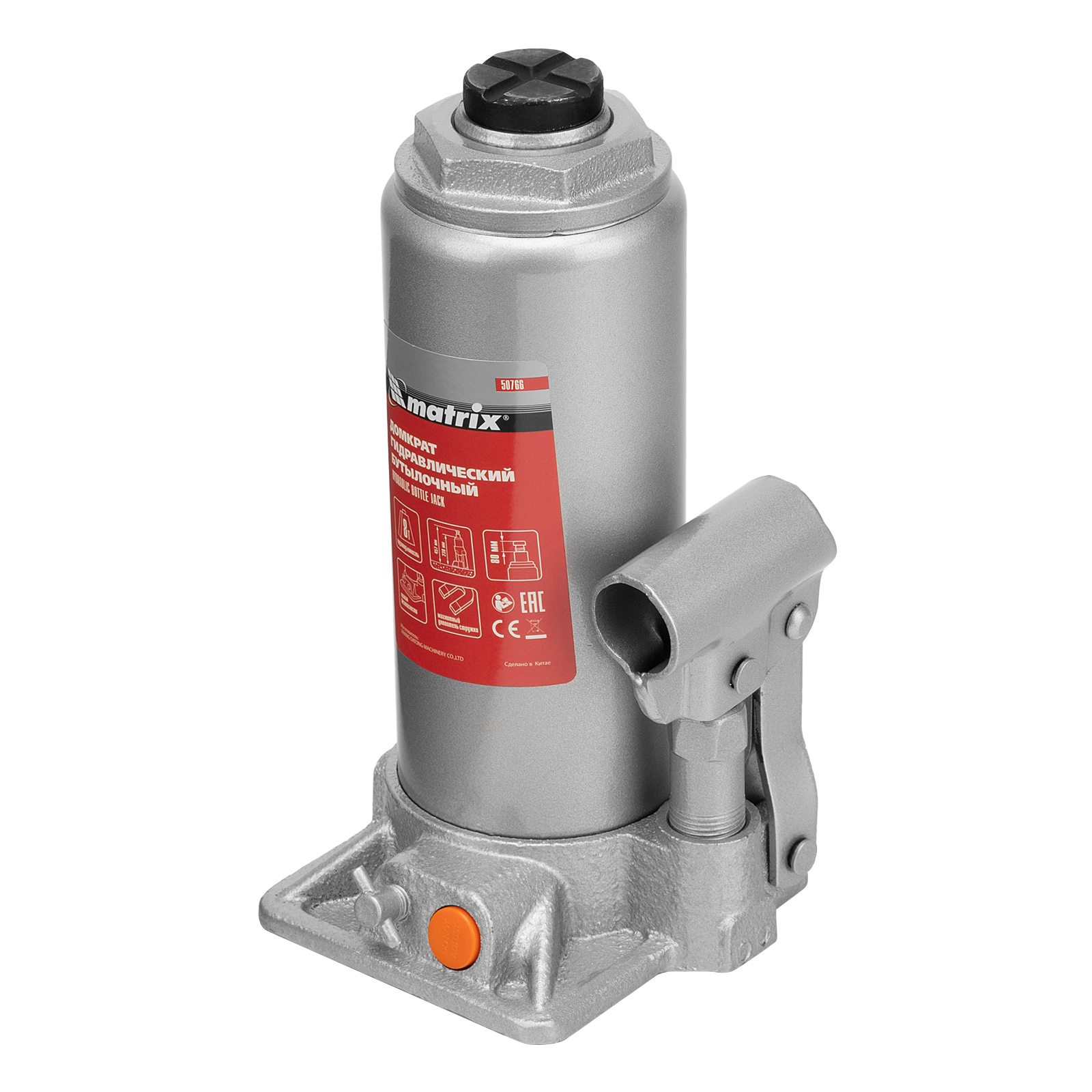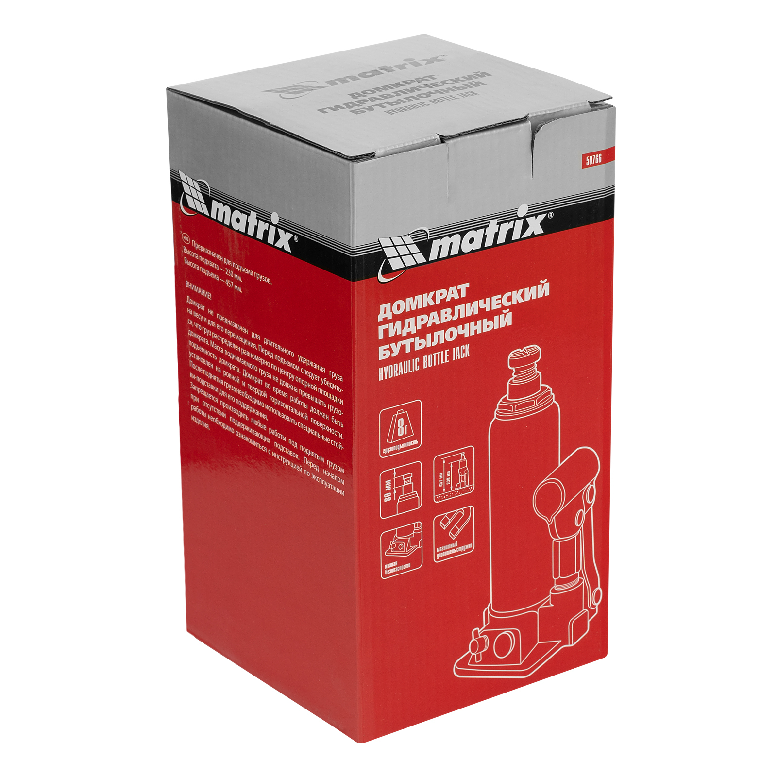 <p>Гидравлический бутылочный домкрат Matrix 50766 предназначен для быстрого поднятия грузов массой до 8 т на высоту 230-457 мм. Будет полезен автолюбителям и мастерам СТО в качестве полупрофессионального инструмента. Встроенный магнитный уловитель металлической стружки защищает резиновые уплотнители от повреждений.</p><h2>Преимущества</h2><ul><li>Защита от перегрузки — клапан безопасности не допускает поднятия груза массой более 8000 кг.</li><li>Надежность — подъемное устройство выполнено из прочной коррозионностойкой стали.</li><li>Разборный корпус — домкрат можно отремонтировать при необходимости.</li><li>Удобная транспортировка — домкрат весом 5,25 кг легко помещается в багажник авто.</li></ul>