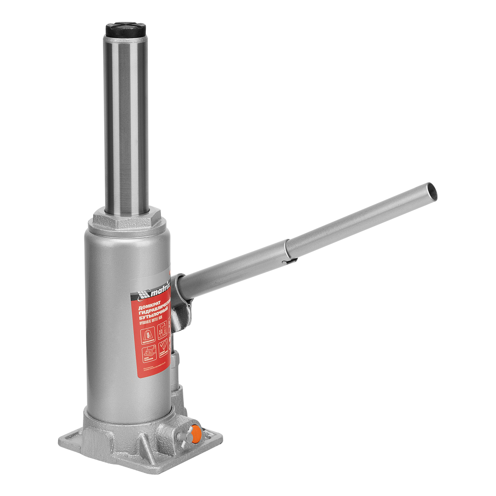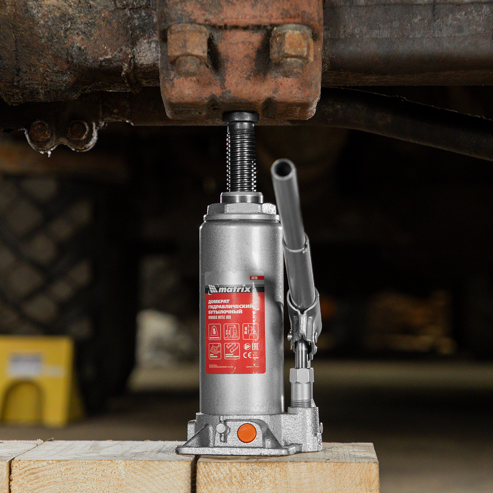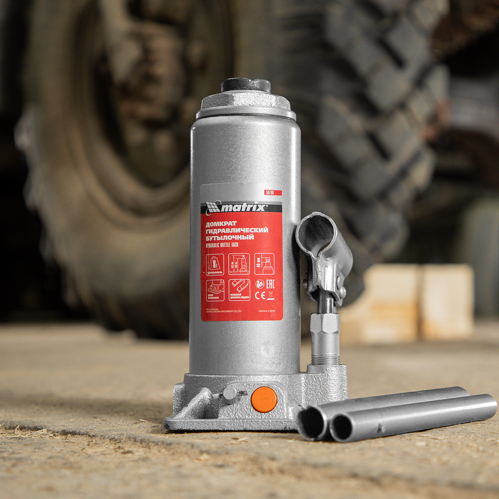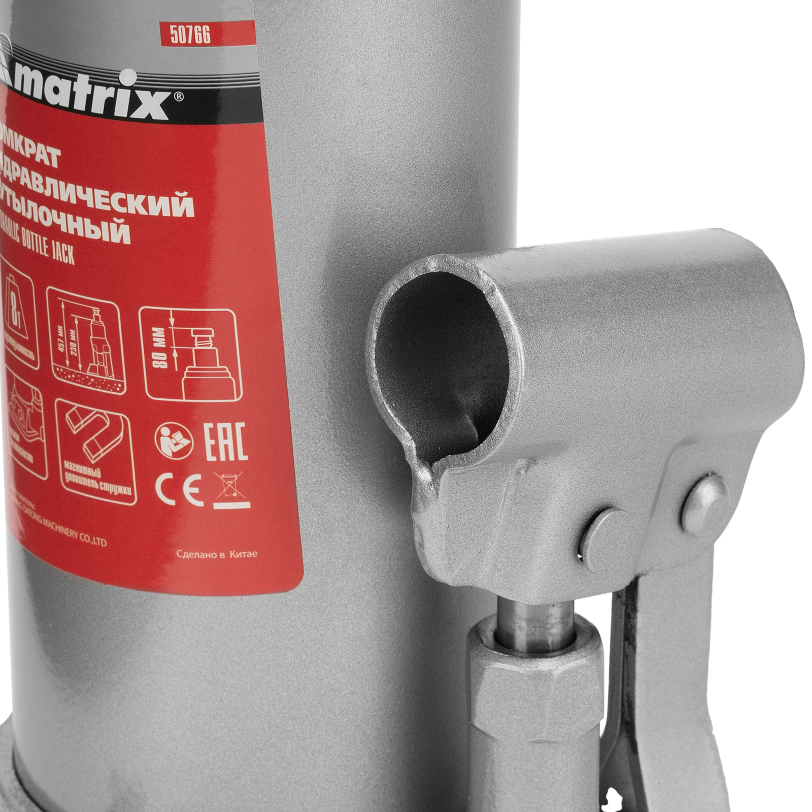 <p>Гидравлический бутылочный домкрат Matrix 50766 предназначен для быстрого поднятия грузов массой до 8 т на высоту 230-457 мм. Будет полезен автолюбителям и мастерам СТО в качестве полупрофессионального инструмента. Встроенный магнитный уловитель металлической стружки защищает резиновые уплотнители от повреждений.</p><h2>Преимущества</h2><ul><li>Защита от перегрузки — клапан безопасности не допускает поднятия груза массой более 8000 кг.</li><li>Надежность — подъемное устройство выполнено из прочной коррозионностойкой стали.</li><li>Разборный корпус — домкрат можно отремонтировать при необходимости.</li><li>Удобная транспортировка — домкрат весом 5,25 кг легко помещается в багажник авто.</li></ul>