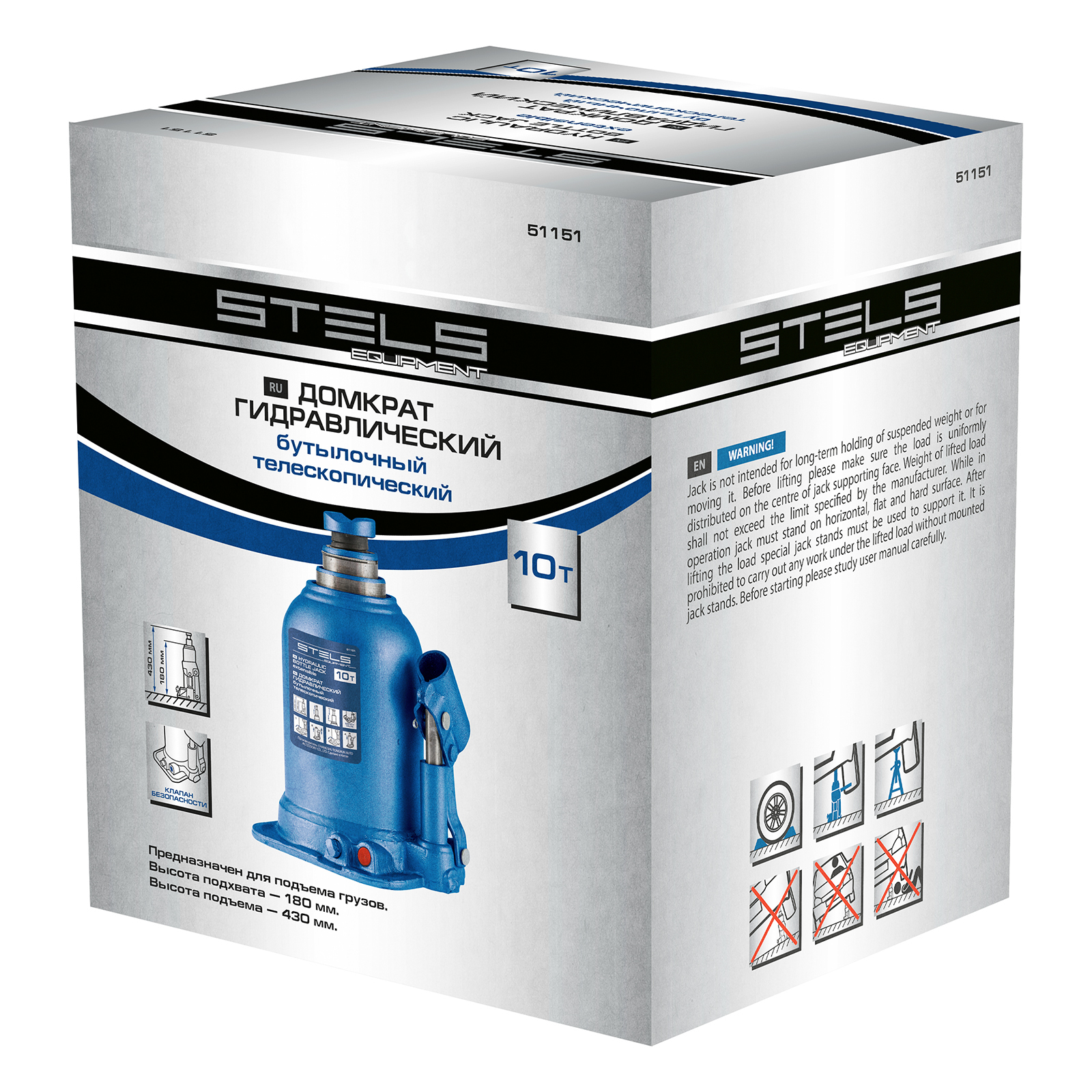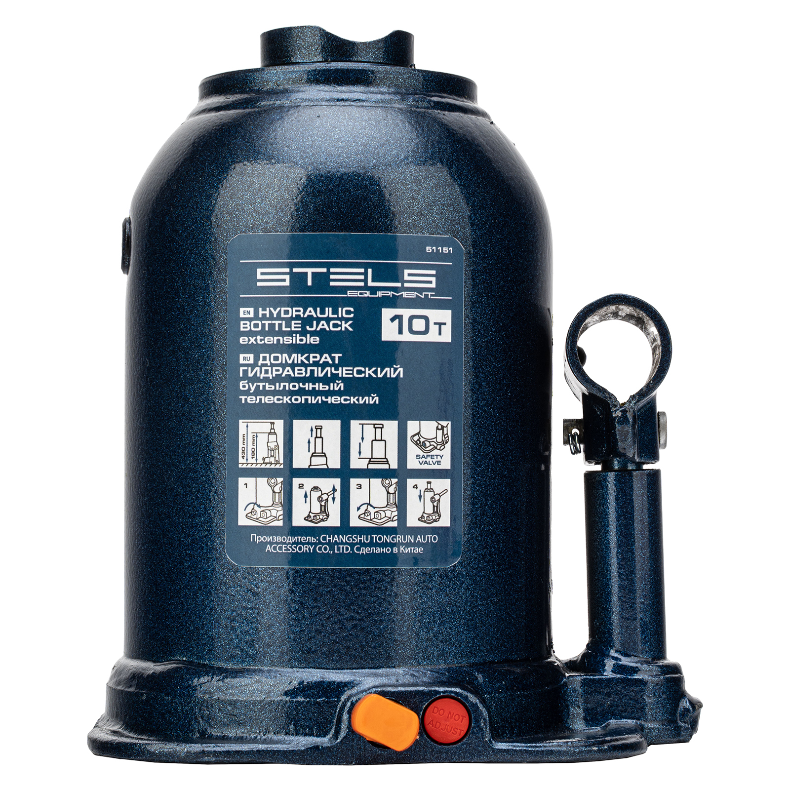 Домкрат гидравлический бутылочный Stels 51151, телескопический, используется для поднятия грузов весом до 10 т с на высоту 180-430 мм. Не требует больших усилий и оптимален для автомобилей с большим клиренсом. Домкрат можно использовать в гараже для самостоятельного ремонта машины или в автосервисе для решения профессиональных задач.