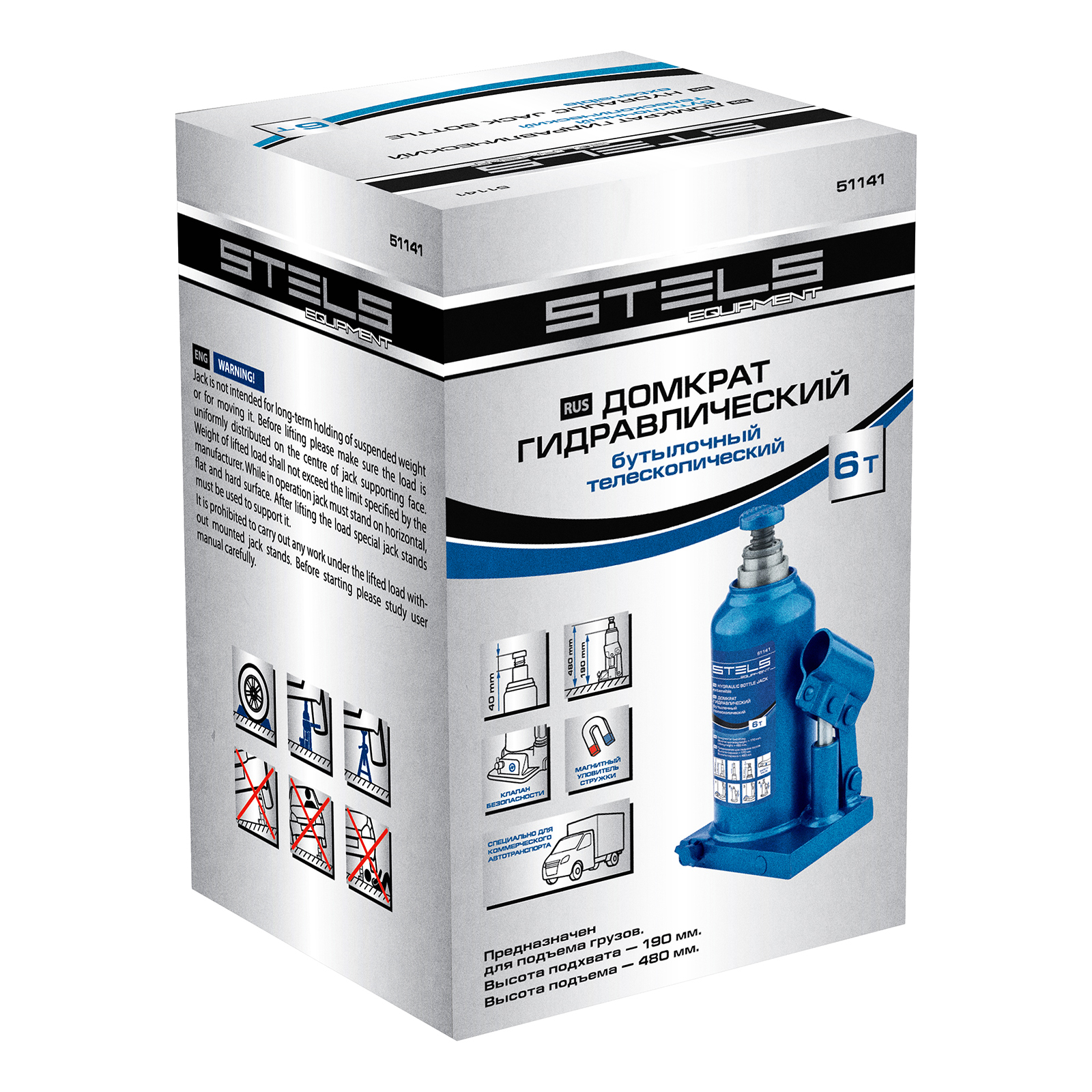 <p>Гидравлический бутылочный телескопический домкрат Stels 51141 используется для поднятия грузов весом до 6 т с на высоту 190-480 мм. Не требует больших усилий и оптимален для автомобилей с большим клиренсом. Домкрат можно использовать в гараже для самостоятельного ремонта машины или в автосервисе для решения профессиональных задач.</p><h2>Преимущества</h2><ul><li>Защита от поломки — клапан безопасности не позволяет поднимать грузы массой свыше 6000 кг.</li><li>Надежная конструкция — основание и корпус выполнены из стали и сварены между собой.</li><li>Малый вес 5,5 кг — домкрат легко перемещать и перевозить в багажнике машины.</li></ul>