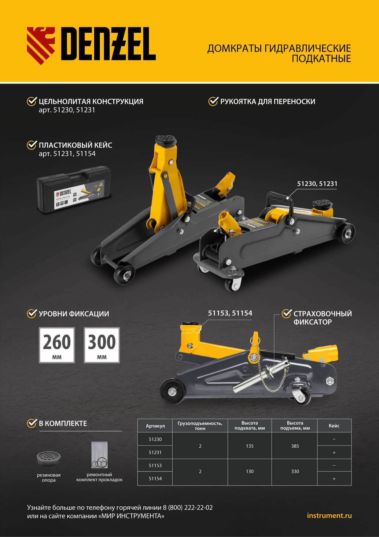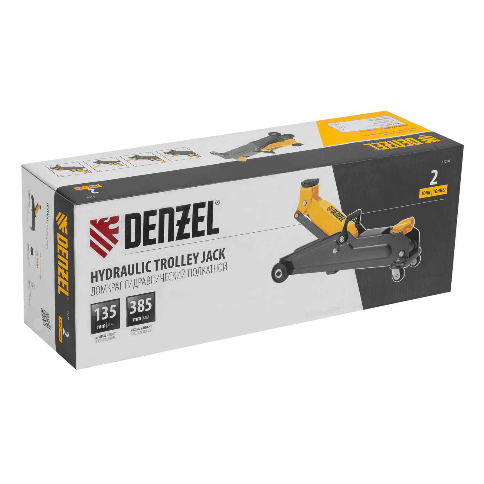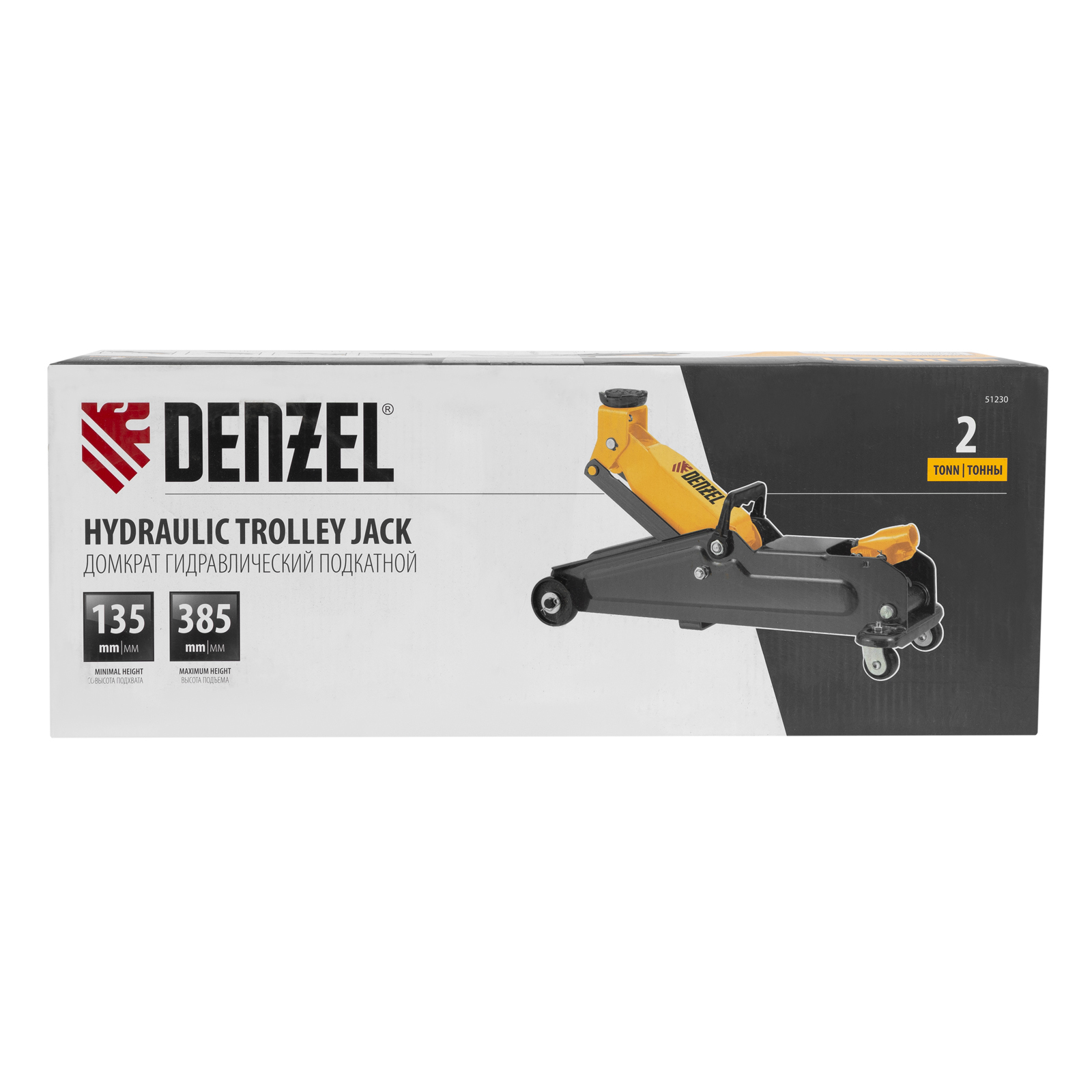 <p>Гидравлический подкатной домкрат Denzel 51230 с высотой подхвата 135 мм предназначен для плавного подъема грузов массой до 2 т на высоту до 385 мм. Домкрат пригодится владельцам легковых автомобилей со стандартным клиренсом.</p><h2>Преимущества</h2><ul><li>Надежность — подъемный рычаг домкрата имеет усиленные боковые стороны. </li><li>Защита от поломки — предохранительный клапан не допускает подъема груза массой более 2 т.</li><li>Аккуратная работа — резиновая опора защищает днище автомобиля от нежелательных повреждений.</li><li>Комфортное перемещение — в верхней части корпуса имеется эргономичная рукоятка с подпальцевыми выемками.</li></ul>