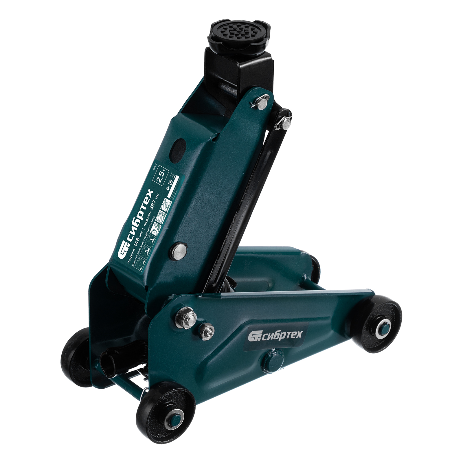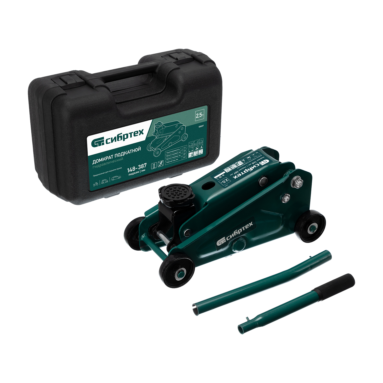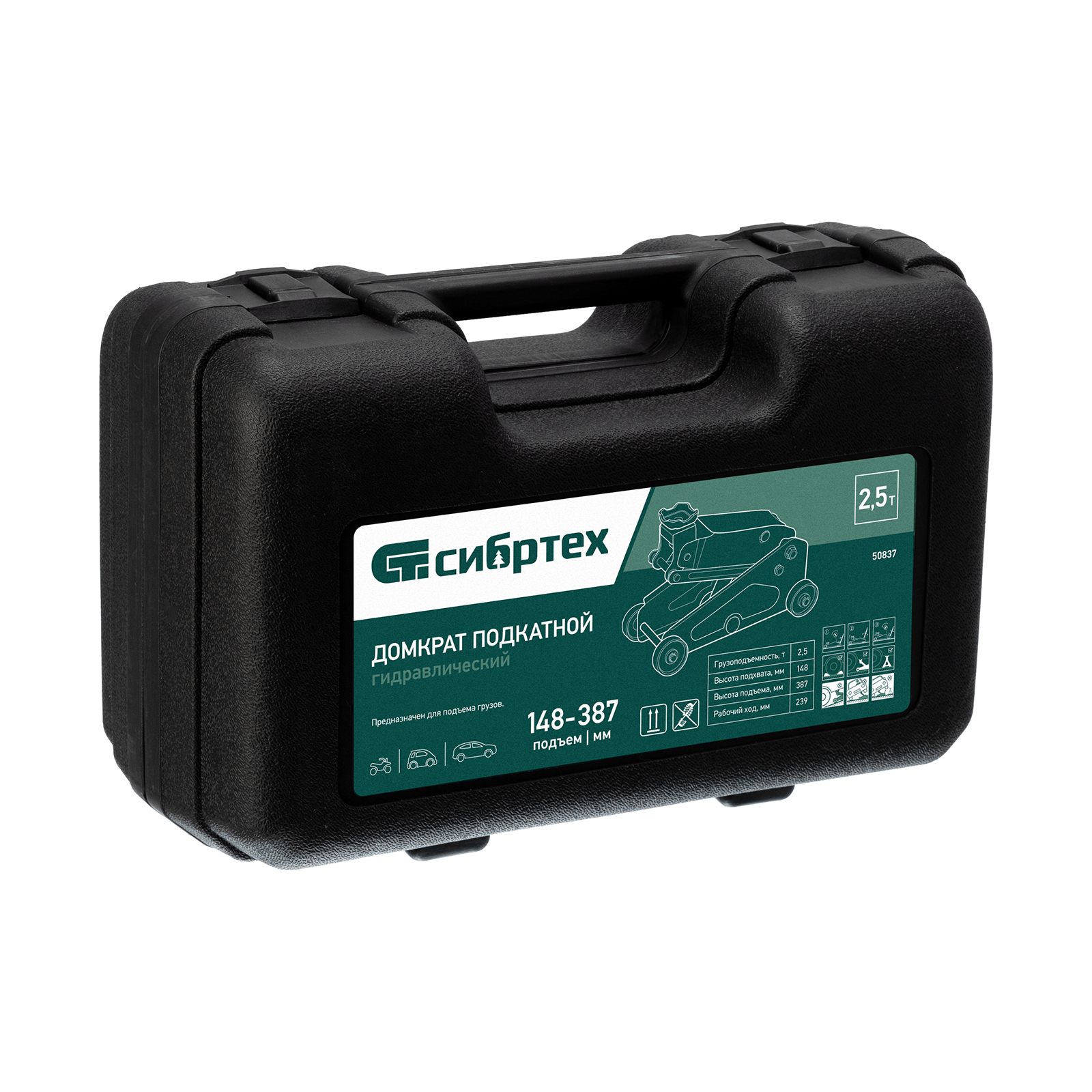 <p>Гидравлический подкатной домкрат Сибртех 50837, поставляющийся в пластиковом кейсе, с высотой подхвата 148 мм, предназначен для подъема грузов массой до 2,5 т на высоту до 387 мм. Применяется для обслуживания автомобилей со стандартным клиренсом. Компактный домкрат подходит для самостоятельного использования автовладельцами.</p><h2>Преимущества</h2><ul><li>Безопасность — клапан сброса избыточного давления защищает домкрат от перегрузки, предотвращая подъем груза массой более 2,5 т.</li><li>Маневренность — благодаря поворотным колесам домкрат можно быстро подвести под груз.</li><li>Небольшие габариты — подъемное устройство можно разместить в багажнике автомобиля.</li><li>Удобное хранение и транспортировка — в комплект поставки включен прочный пластиковый кейс, домкрат весит 9,6 кг.</li></ul>