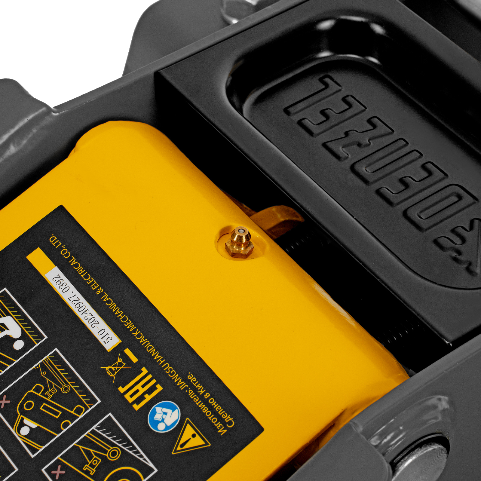 - Высокий ресурс — масленка на подъемном рычаге позволяет легко смазывать инструмент для снижения трения между движущимися механизмами, что повышает эффективность работы домкрата и продлевает его срок службы.