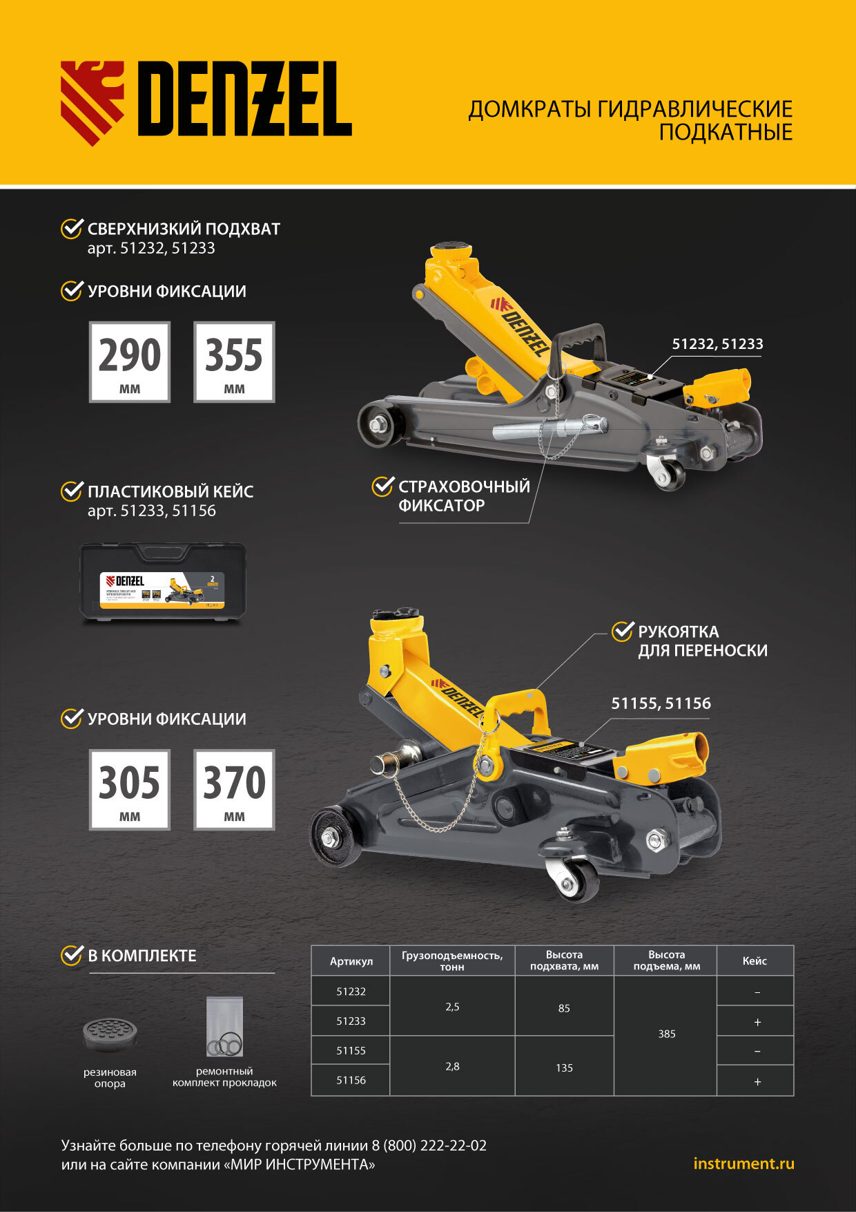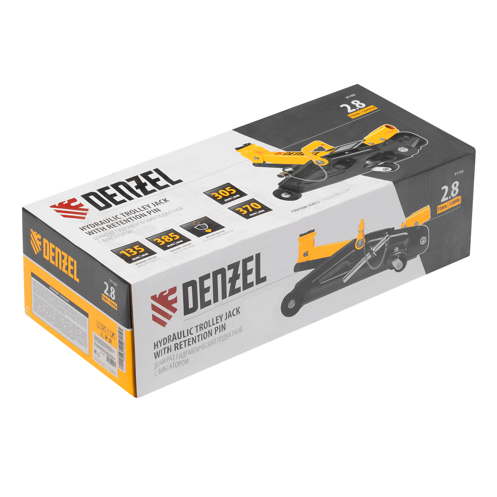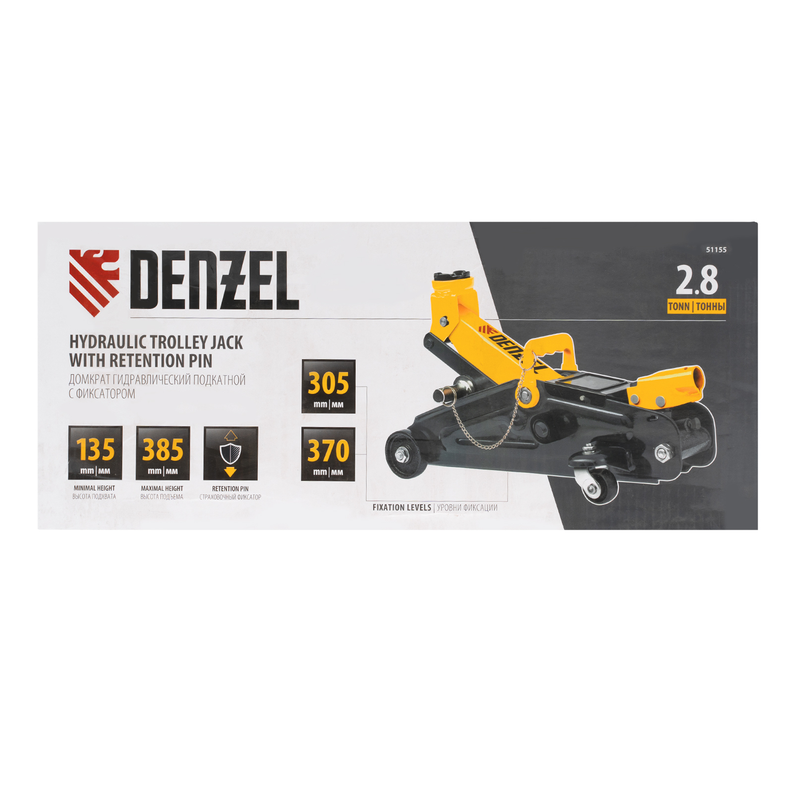<p>Гидравлический подкатной домкрат с фиксатором Denzel 51155 с высотой подхвата 135 мм предназначен для плавного подъема грузов массой до 2,8 т на высоту до 385 мм. Страховочный штифт позволяет фиксировать подъемный рычаг на высоте 305 и 370 мм для безопасной работы. Домкрат пригодится владельцам легковых автомобилей со стандартным клиренсом.</p><h2>Преимущества</h2><ul><li>Защита от поломки — предохранительный клапан не допускает подъема груза массой более 2,8 т.</li><li>Резиновая поворотная опора — груз надежно фиксируется, а кузов авто защищен от повреждений.</li><li>Эргономичность — домкрат имеет переставную рукоятку для комфортного перемещения и извлечения из-под автомобиля.</li></ul>