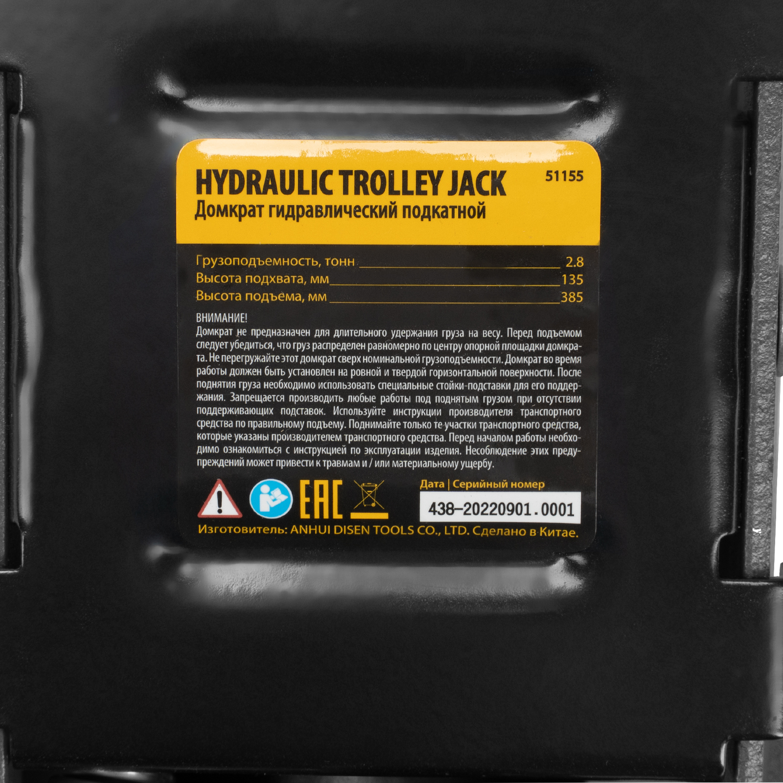 Домкрат гидравлический подкатной с фиксатором, 2,8 т, 135-385 мм Denzel
