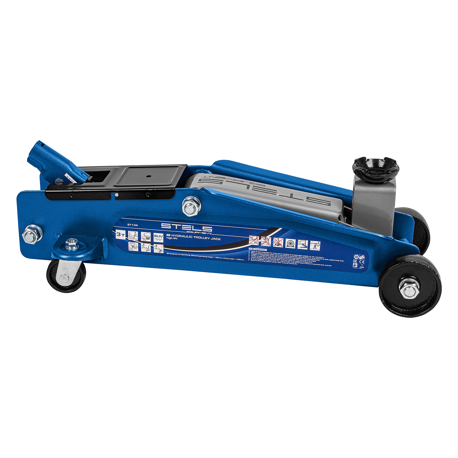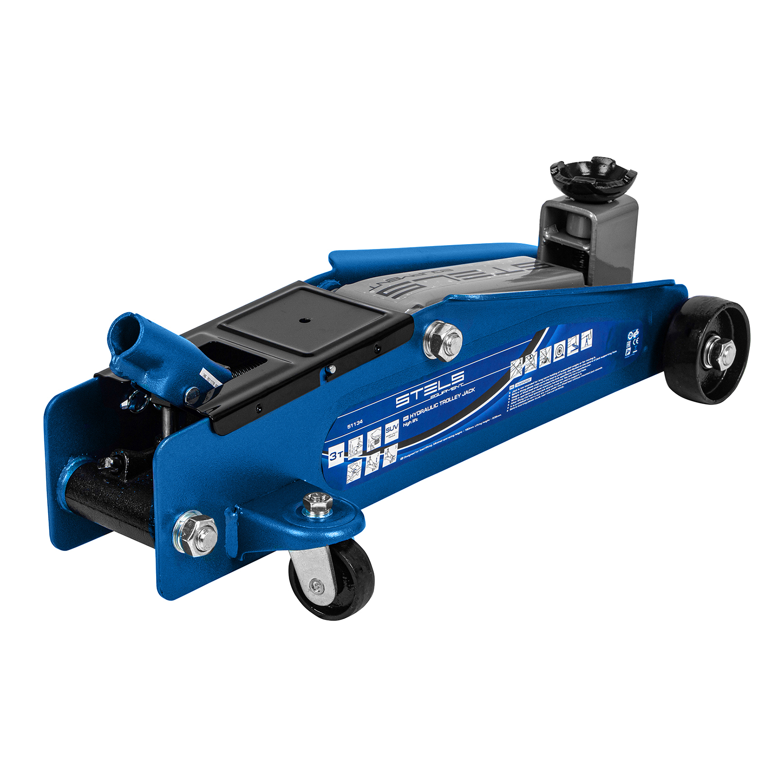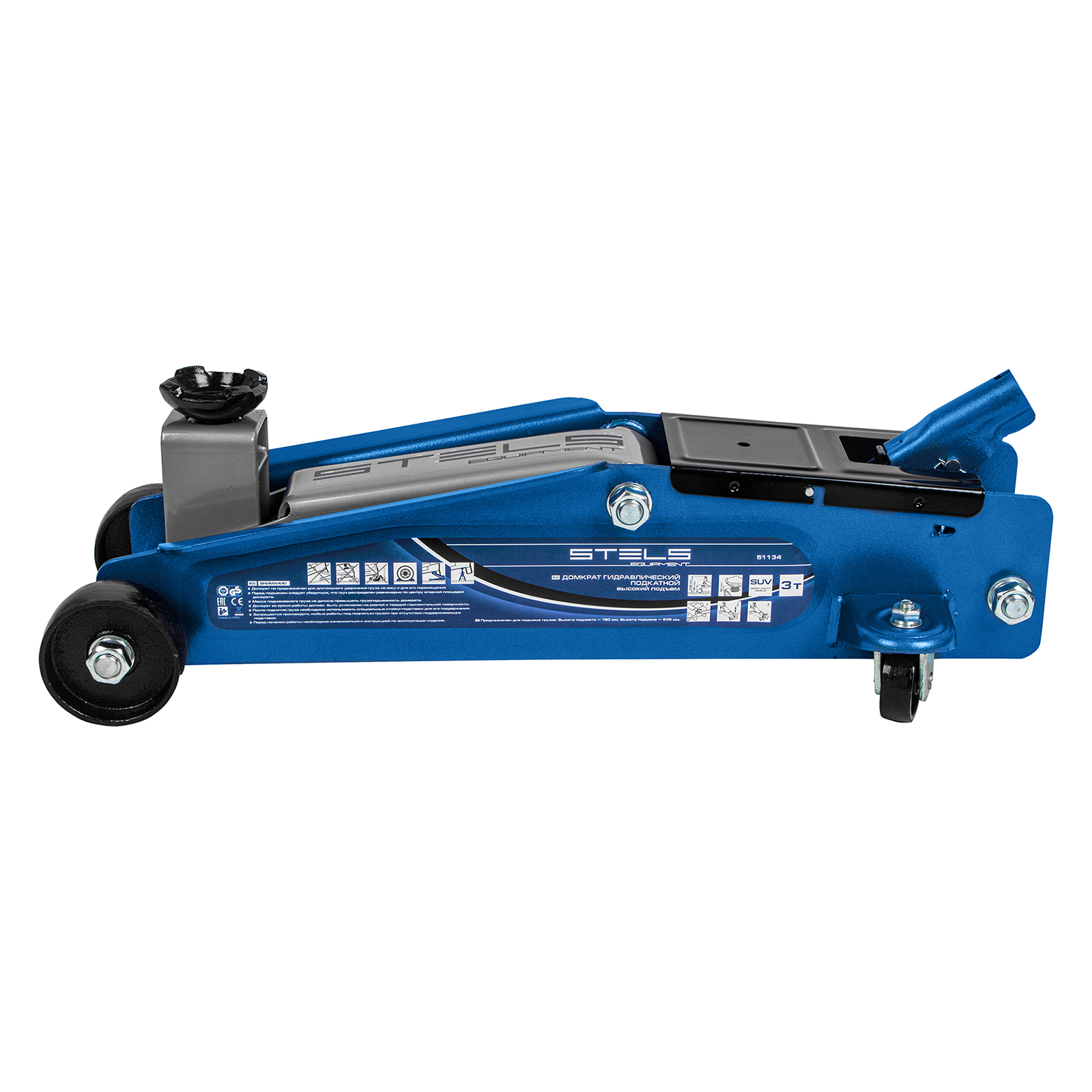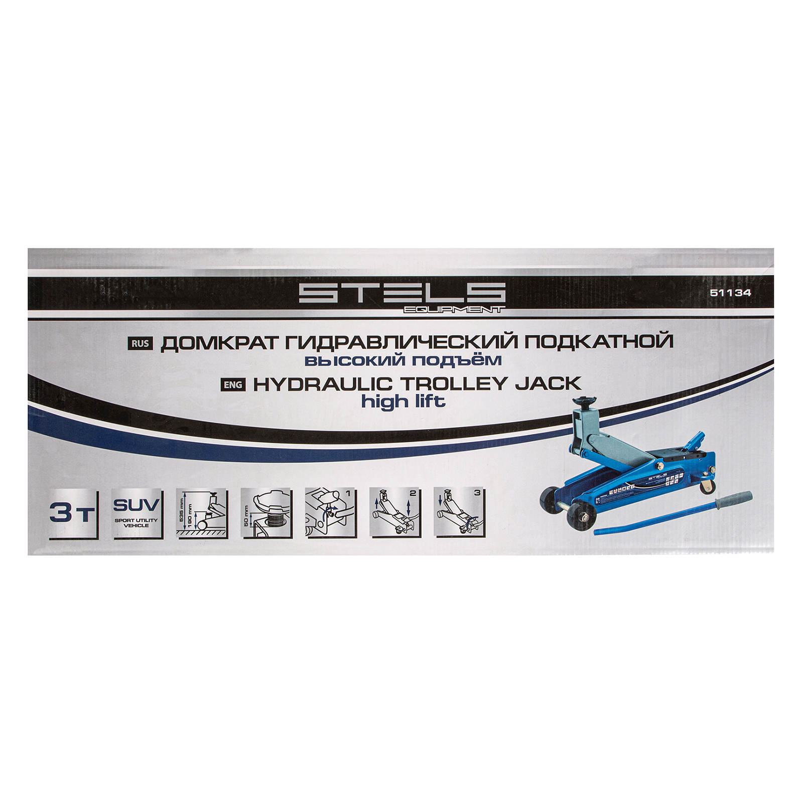 <p>Подкатной гидравлический домкрат Stels 51134 с высоким подъемом 190 мм позволяет поднимать грузы весом до 3 т на высоту 535 мм и подходит для автомобилей класса SUV с увеличенным дорожным просветом. Может использоваться для самостоятельного обслуживания авто.</p><h2>Преимущества</h2><ul><li>Установка точной высоты подъема — положение опорной площадки регулируется в пределах 50 мм.</li><li>Защита от перегрузки — предохранительный клапан не допускает подъем груза массой более 3 т.</li><li>Маневренность — задние колеса сделаны поворотными, что облегчает установку и извлечение устройства.</li><li>Комфортная работа даже при отрицательной температуре — благодаря рифленой накладке рабочая ручка не скользит в ладони.</li></ul>