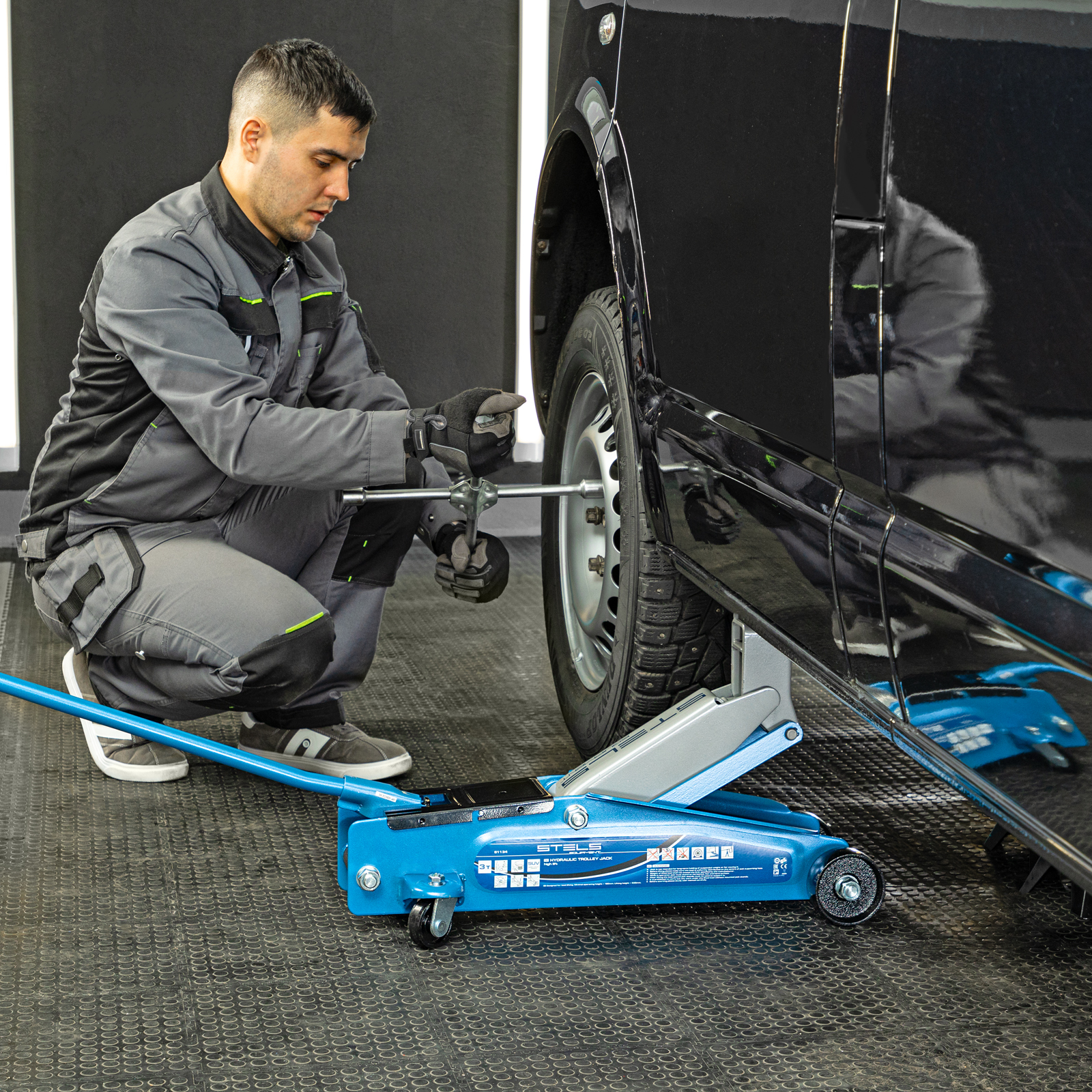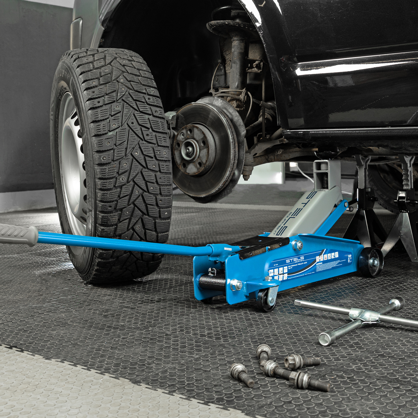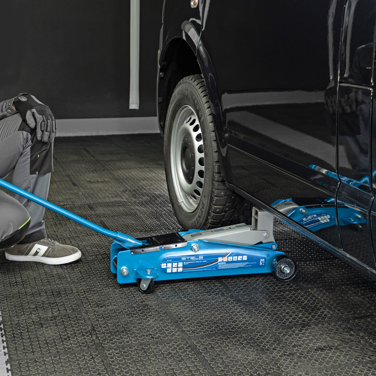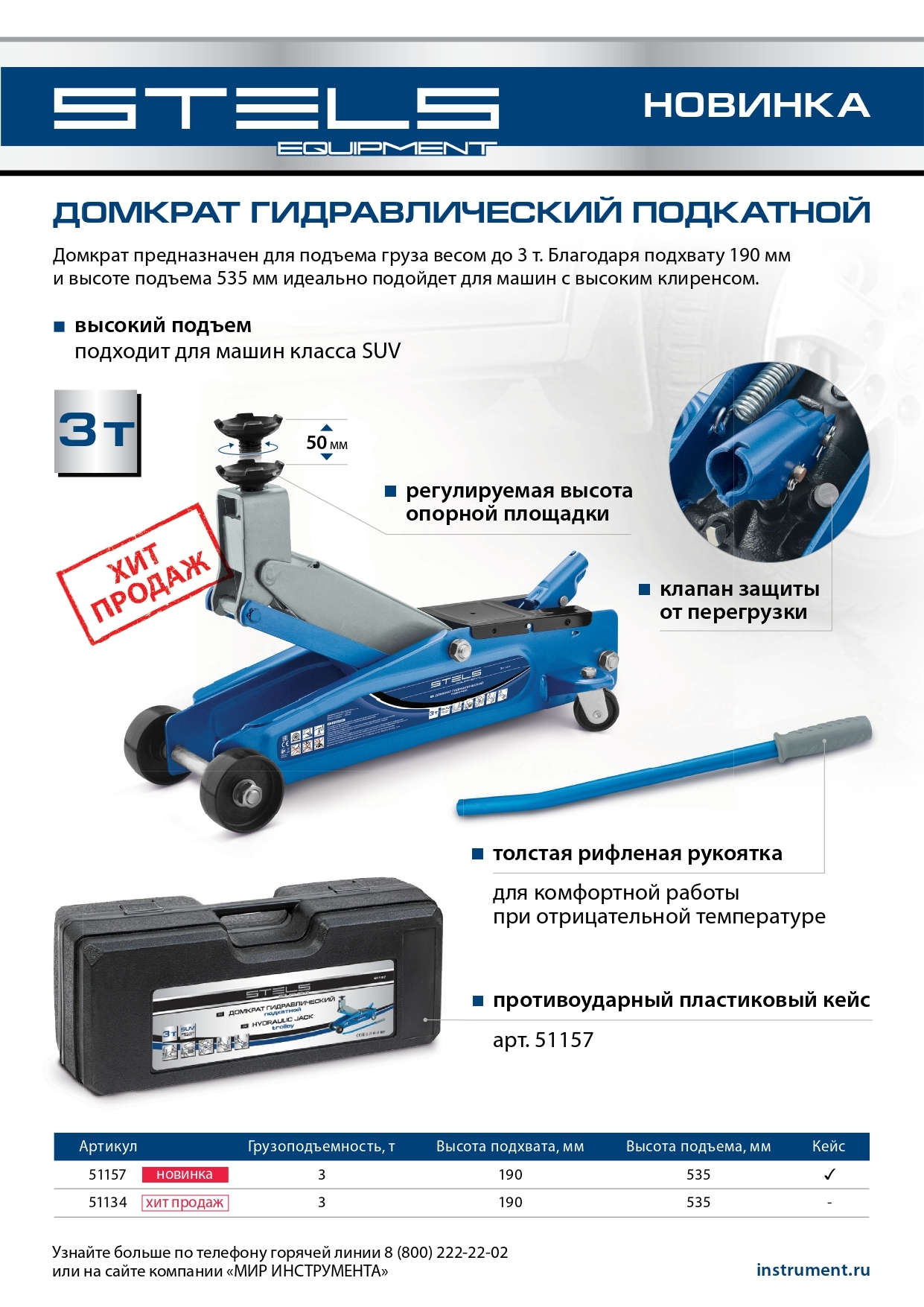 <p>Подкатной гидравлический домкрат Stels 51134 с высоким подъемом 190 мм позволяет поднимать грузы весом до 3 т на высоту 535 мм и подходит для автомобилей класса SUV с увеличенным дорожным просветом. Может использоваться для самостоятельного обслуживания авто.</p><h2>Преимущества</h2><ul><li>Установка точной высоты подъема — положение опорной площадки регулируется в пределах 50 мм.</li><li>Защита от перегрузки — предохранительный клапан не допускает подъем груза массой более 3 т.</li><li>Маневренность — задние колеса сделаны поворотными, что облегчает установку и извлечение устройства.</li><li>Комфортная работа даже при отрицательной температуре — благодаря рифленой накладке рабочая ручка не скользит в ладони.</li></ul>