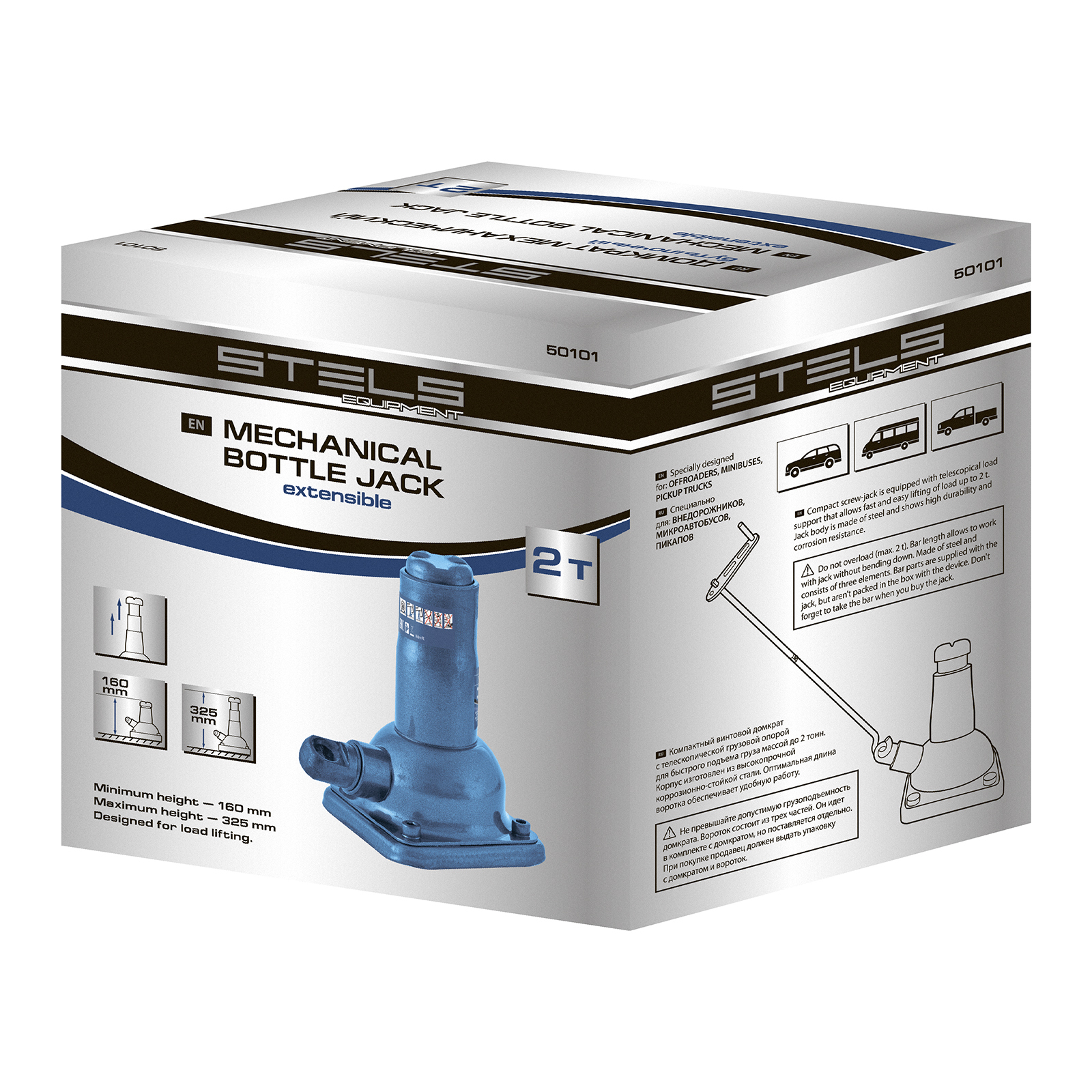 <p>Механический бутылочный домкрат Stels 50101 состоит из 2 частей: самого домкрата и ручки, имеет телескопический шток и используется для быстрого подъема грузов массой до 2 т на высоту от 150 до 310 мм. Домкрат предназначен для самостоятельного применения, будет полезен владельцам легковых автомобилей в дороге и гараже.</p><h2>Преимущества</h2><ul><li>Надежность и долговечность — корпус домкрата выполнен из коррозионностойкой стали повышенной прочности.</li><li>Работа в труднодоступных местах — в комплект входит вороток из трех частей.</li><li>Удобная транспортировка — компактный домкрат весом 3,76 кг легко помещается в багажник автомобиля.</li></ul>