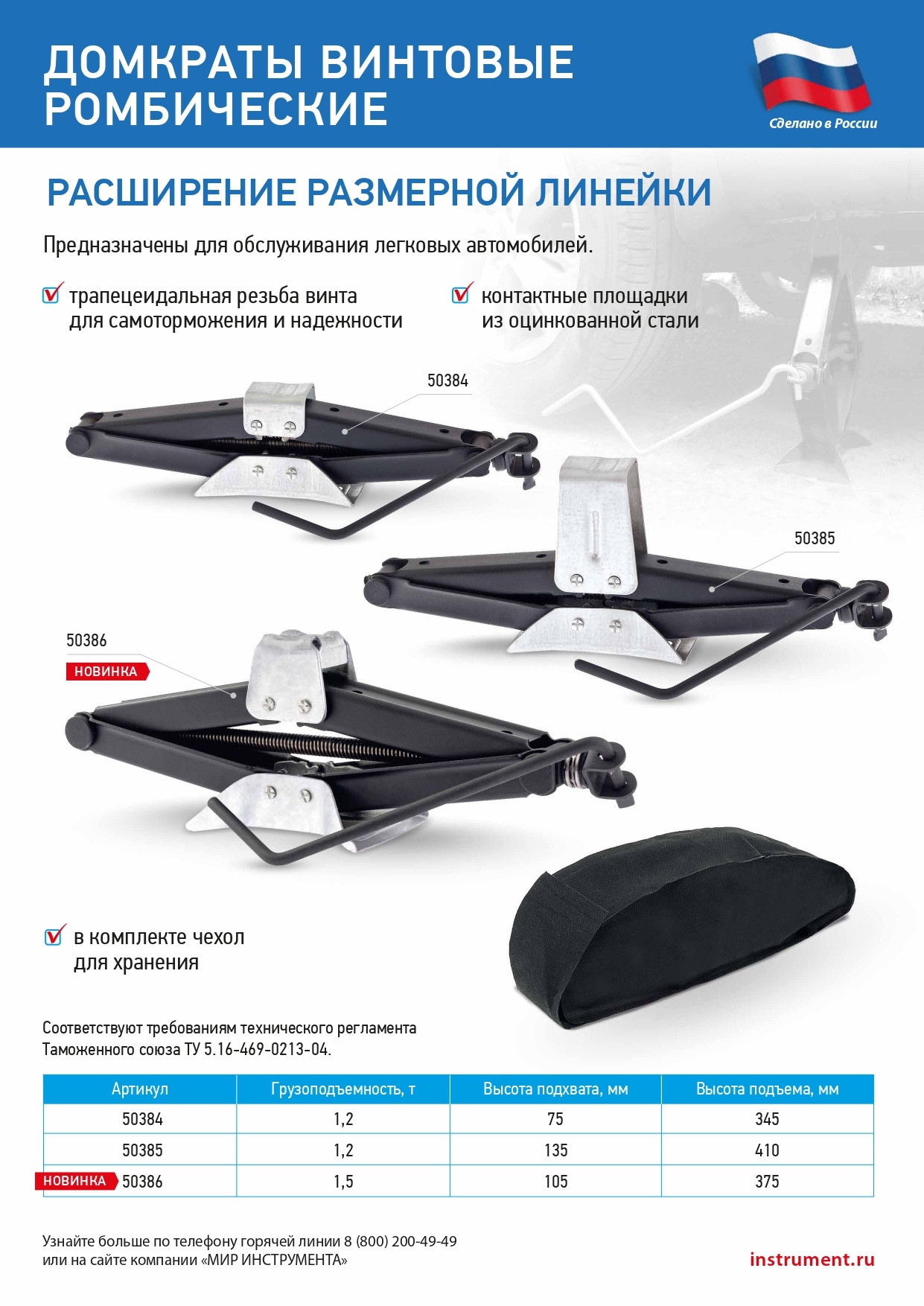 <p>Универсальный винтовой ромбический домкрат 50384 соответствует ТУ 5.16-469-0213-04 и предназначен для обслуживания легковых автомобилей массой не более 1,2т и подъема их на высоту 75-345 мм. Благодаря небольшой высоте подхвата домкрат для машин с низким клиренсом. Он приводится в действие посредством простого и надежного винтового механизма. Будет полезен в гараже, пригодится также и в дороге.</p><h2>Преимущества</h2><ul><li>Устойчивость — благодаря широкому основанию домкрат не опрокидывается во время работы.</li><li>Надежность и долговечность — домкрат не боится коррозии благодаря качественному лакокрасочному покрытию, а также выдерживает эксплуатацию при низких температурах.</li><li>Безопасная эксплуатация — трапецеидальная резьба винта обеспечивает функцию самоторможения.</li><li>Компактность и малый вес — домкрат удобен для хранения и транспортировки.</li></ul>