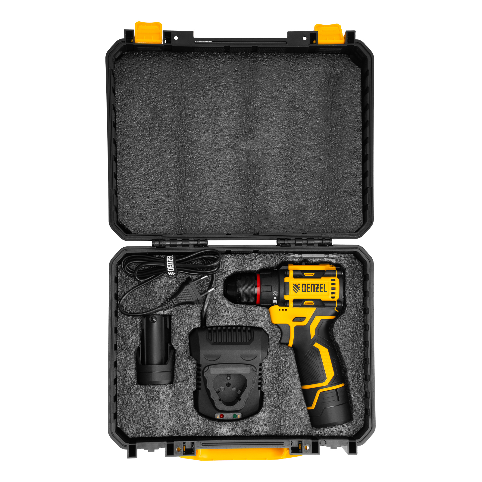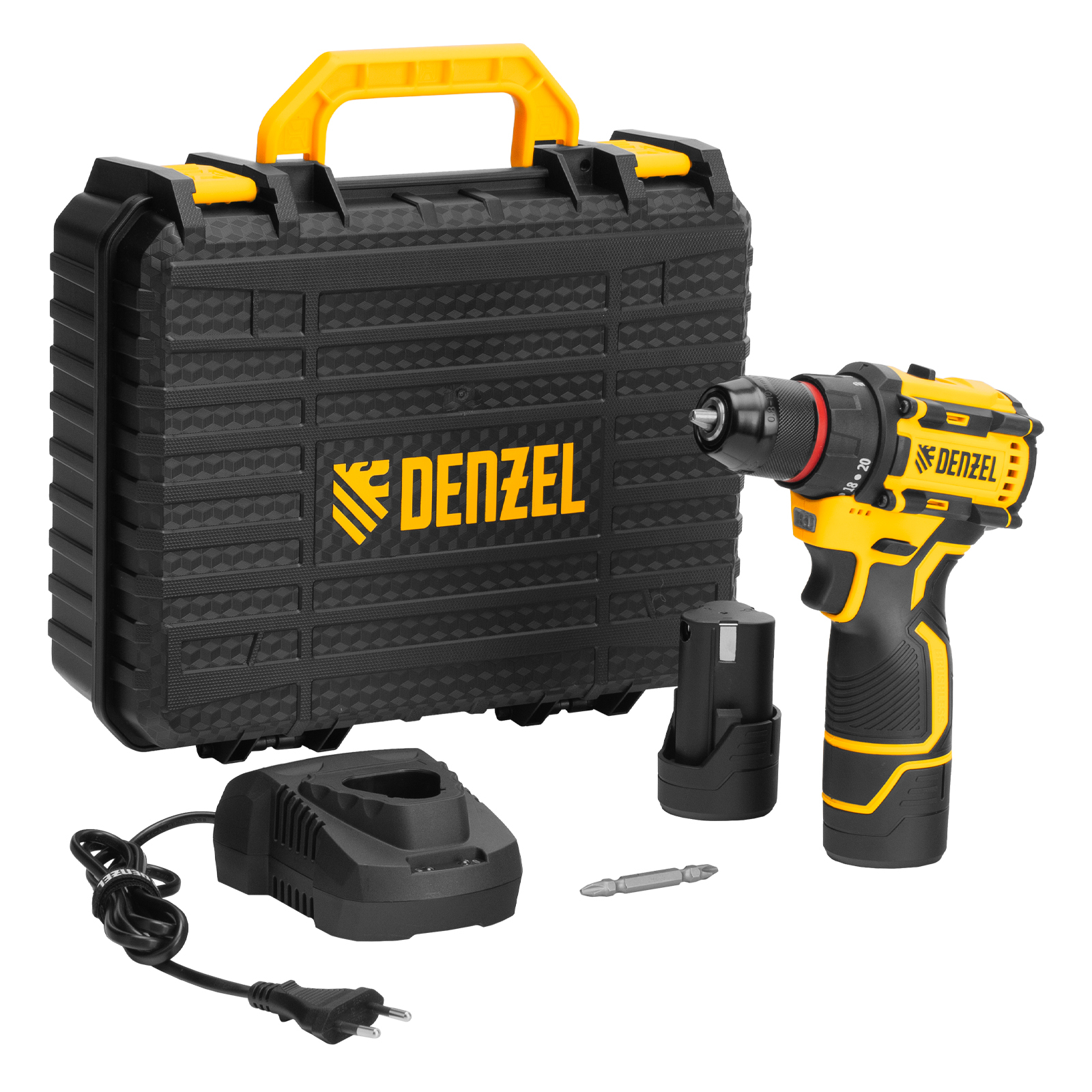 Дрель-шуруповерт аккумуляторная - 1 шт, Батарея аккумуляторная - 2 шт, Устройство зарядное - 1 шт, Бита - 1 шт, Инструкция по эксплуатации с гарантийным талоном - 1 шт, Пластиковый кейс - 1 шт