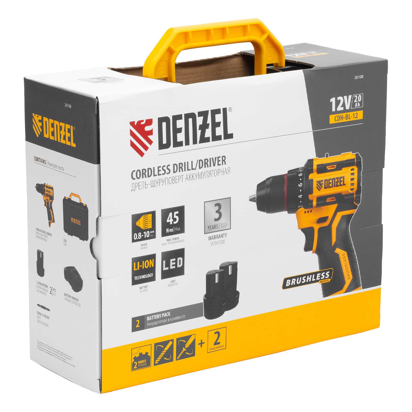 Аккумуляторная дрель-шуруповерт Denzel CDH-BL-12 26108 используется для закручивания и откручивания резьбового крепежа, а также для сверления отверстий в древесине, металле, пластмассе и других материалах. Максимальный диаметр сверления в металле составляет 10 мм, в древесине — 25 мм. Работает от аккумулятора Li-Ion 12 В емкостью 2 А·ч. Мощный бесщеточный двигатель позволяет развивать крутящий момент до 45 Н·м для эффективного применения в быту.