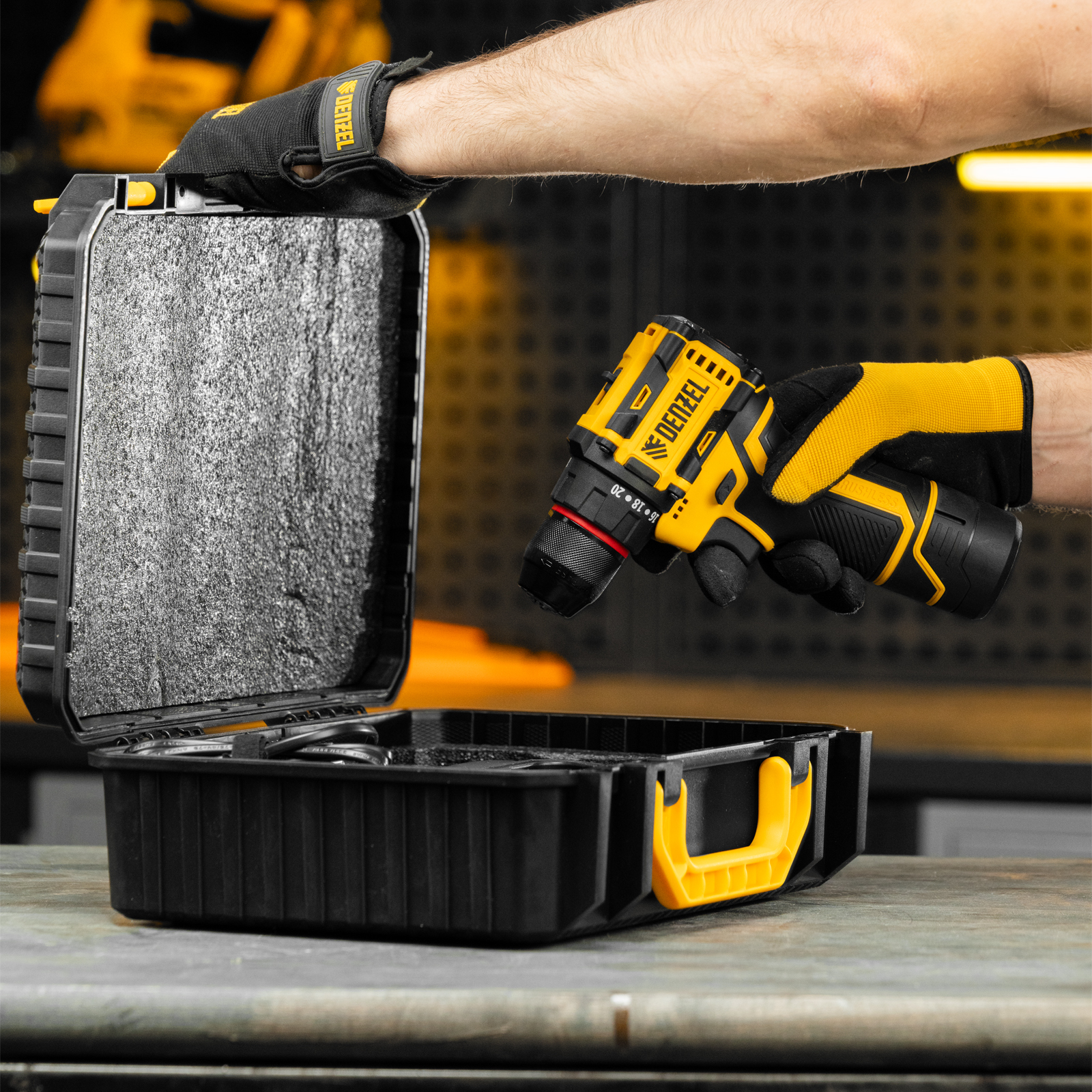 - Надежная упаковка — дрель-шуруповерт с аксессуарами поставляется в прочном пластиковом кейсе.