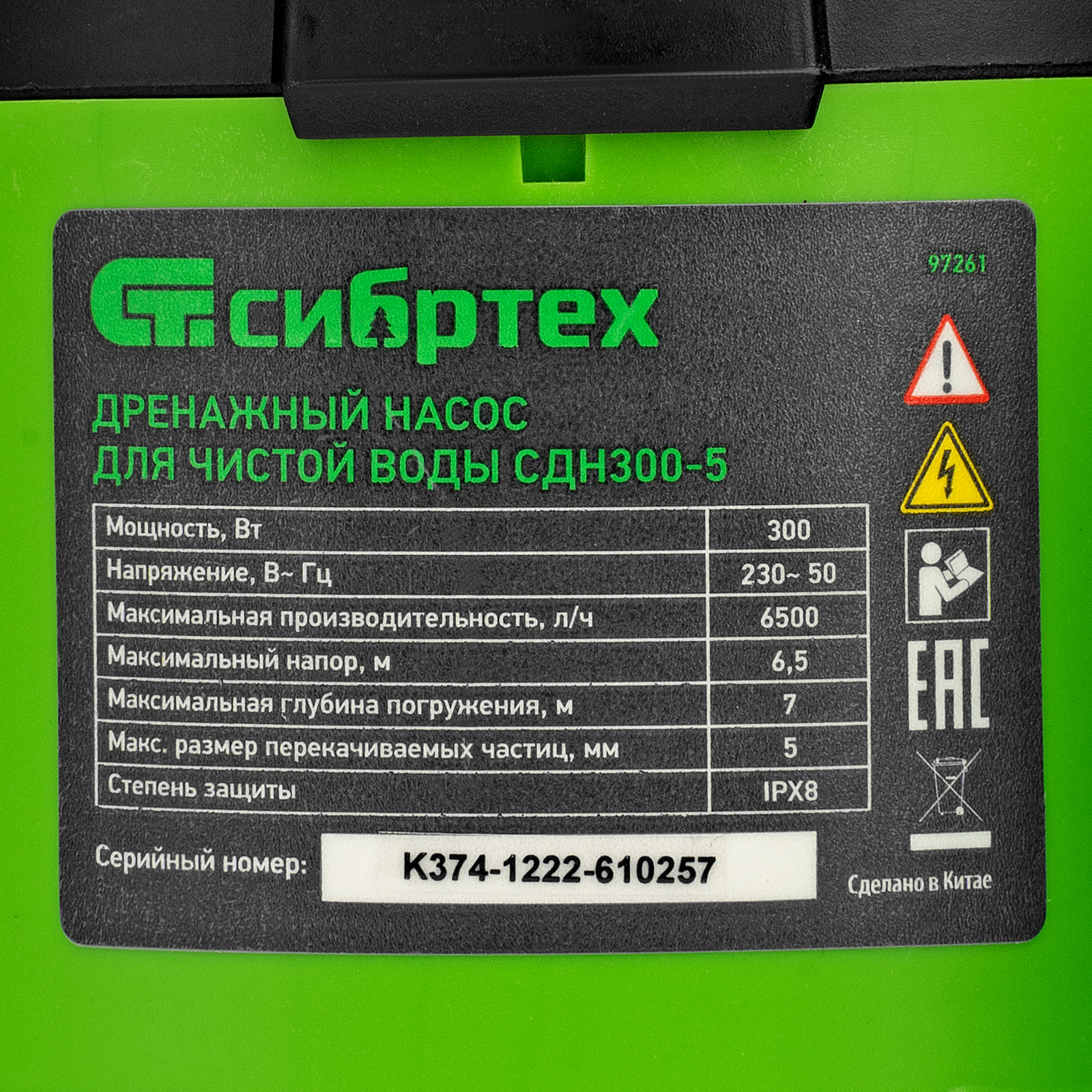 Дренажный насос для чистой воды СДН300-5, 300 Вт, напор 6.5м, 6500 л/ч Сибртех