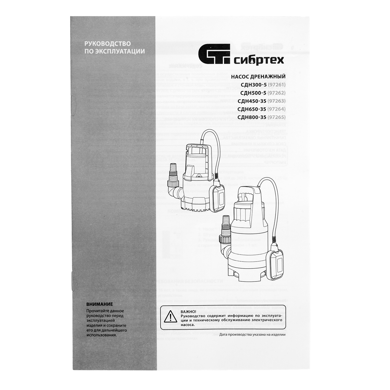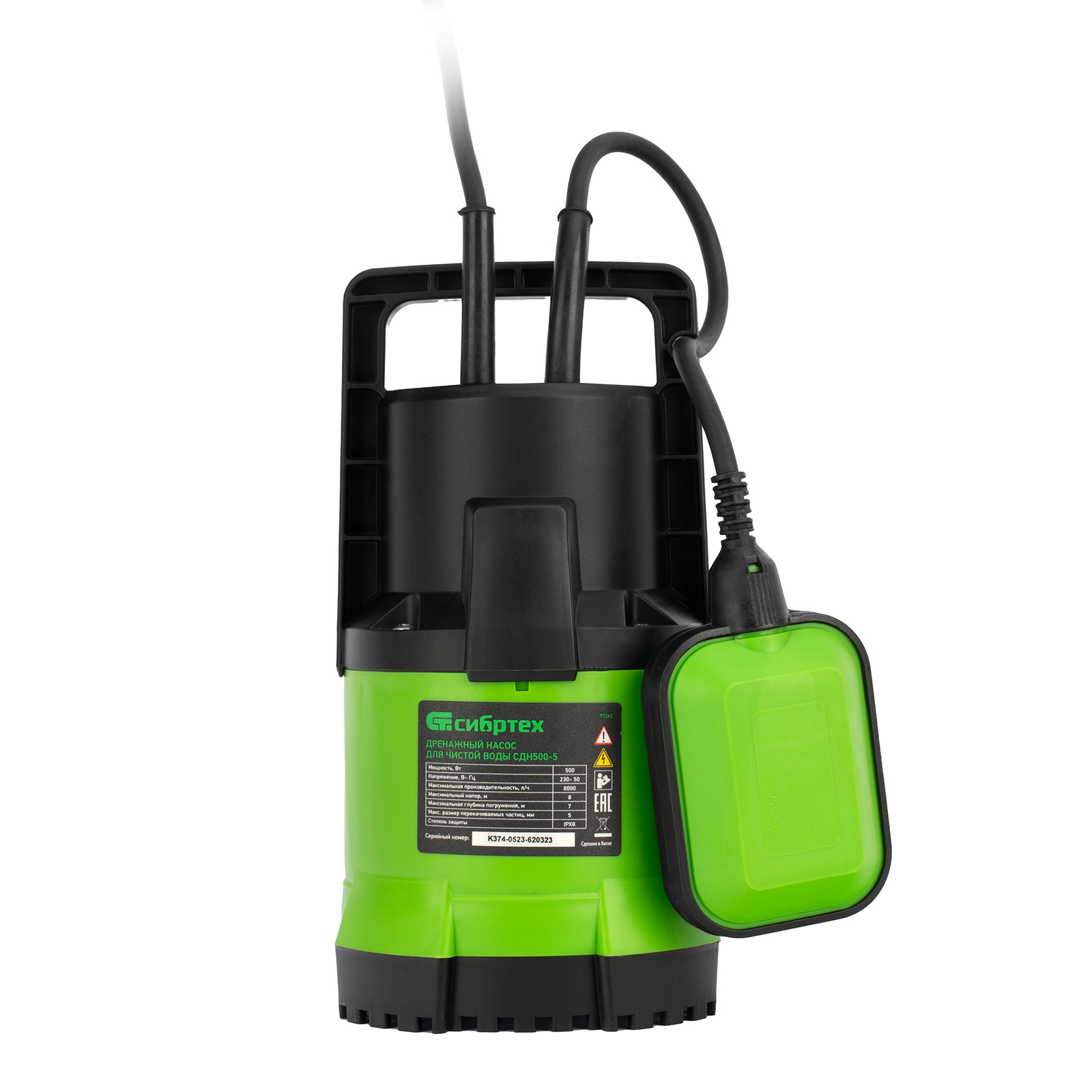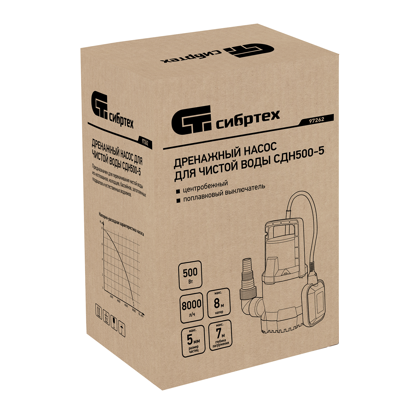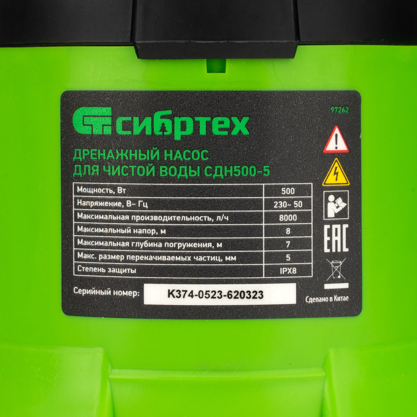 Дренажный насос для чистой воды СДН500-5, 500 Вт, напор 8 м, 8000 л/ч Сибртех