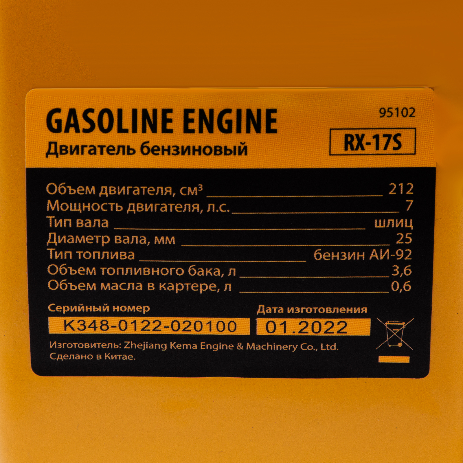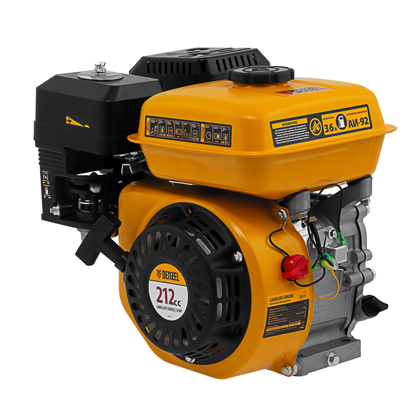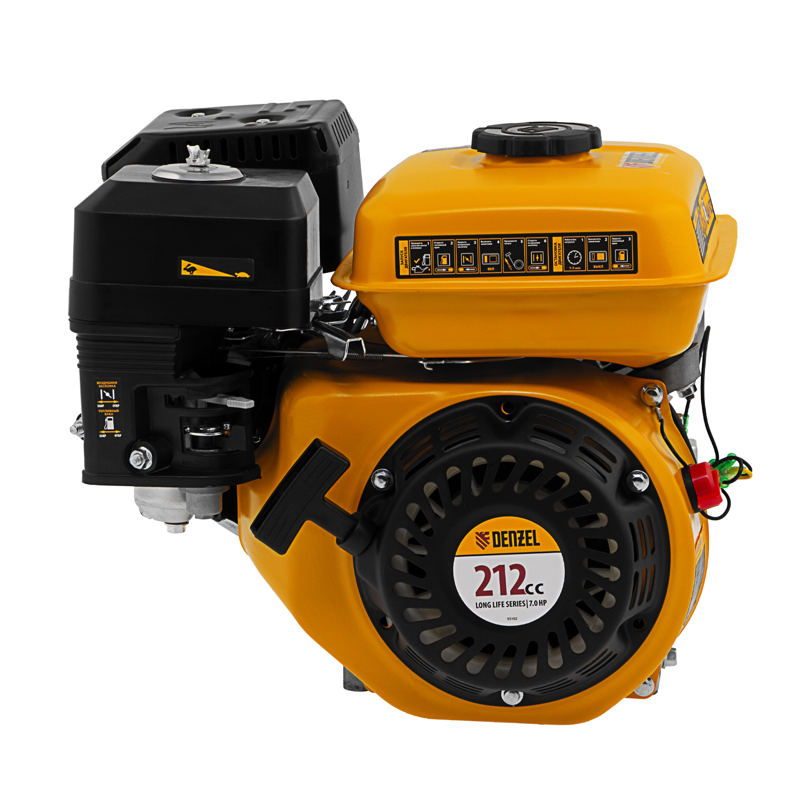 Четырехтактный бензиновый двигатель Denzel RX-17S 95102 мощностью 7 л. с. и объемом 212 см3, с типом горизонтального вала шлиц 25 мм, имеет ручной старт и воздушное охлаждение. Предназначен для использования в качестве привода садово-парковой и строительной техники (садовых измельчителей, мотопомп, бензиновых моек высокого давления и др.). Обеспечивает бесперебойное функционирование оборудования и эффективное выполнение сельскохозяйственных, строительных работ, а также решение прочих задач на загородном участке.