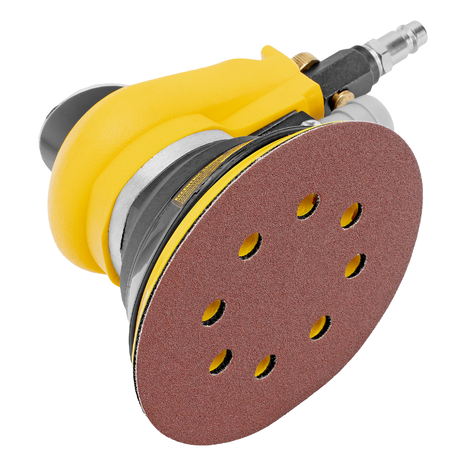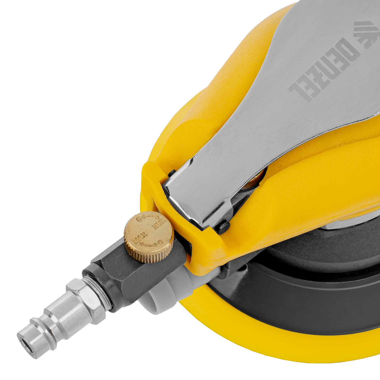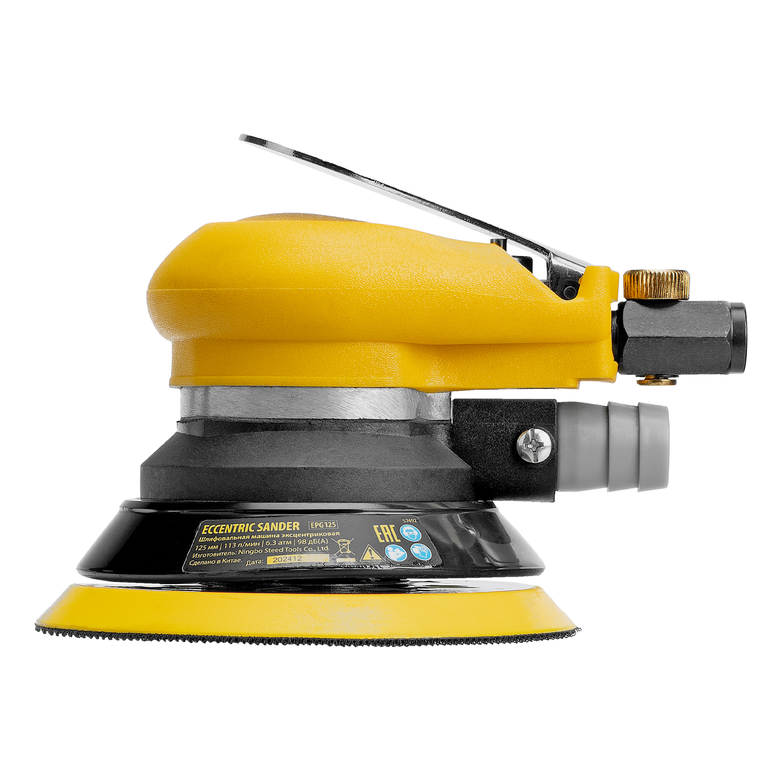 Эксцентриковая шлифовальная машина Denzel EPG125 57492 с амплитудой колебаний 5 мм обеспечивает скорость вращения до 9000 об/мин при среднем расходе воздуха 113 л/мин и давлении 6,3 бар, что делает ее идеальным инструментом для шлифовки и обработки различных материалов. Диаметр подошвы составляет 125 мм, поэтому инструмент оптимален для выполнения работ в труднодоступных местах, а также для детальной обработки небольших поверхностей, что особенно важно при подготовке к покраске и отделке.