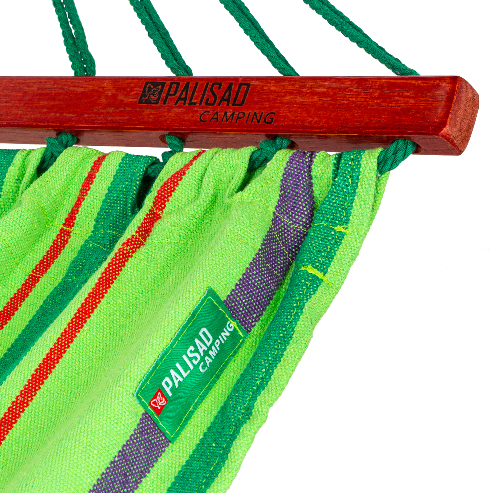 <p>Гамак Camping Palisad 69586 размером 200 х 100 см, с деревянными планками, сделает пребывание на природе комфортным. Поможет расслабиться и приятно провести время за чтением, подарит освежающий сон, а также обеспечит спокойную работу за ноутбуком на свежем воздухе.</p><h2>Преимущества</h2><ul><li>Экологичность — гамак из 100% хлопка безвреден для здоровья и позволяет телу дышать.</li><li>Отсутствие ограничений по использованию — длина полотна составляет 200 см, допустимая нагрузка — 120 кг, поэтому гамак подойдет практически любому пользователю.</li><li>Комфортный отдых — деревянные планки обеспечивают более сильное натяжение полотна. </li><li>Удобная транспортировка — гамак поставляется в комплекте с чехлом.</li></ul>