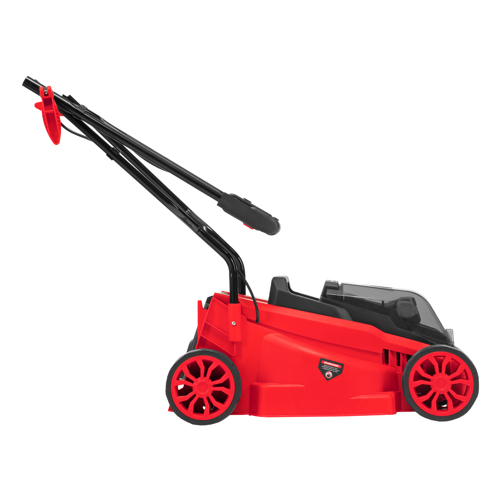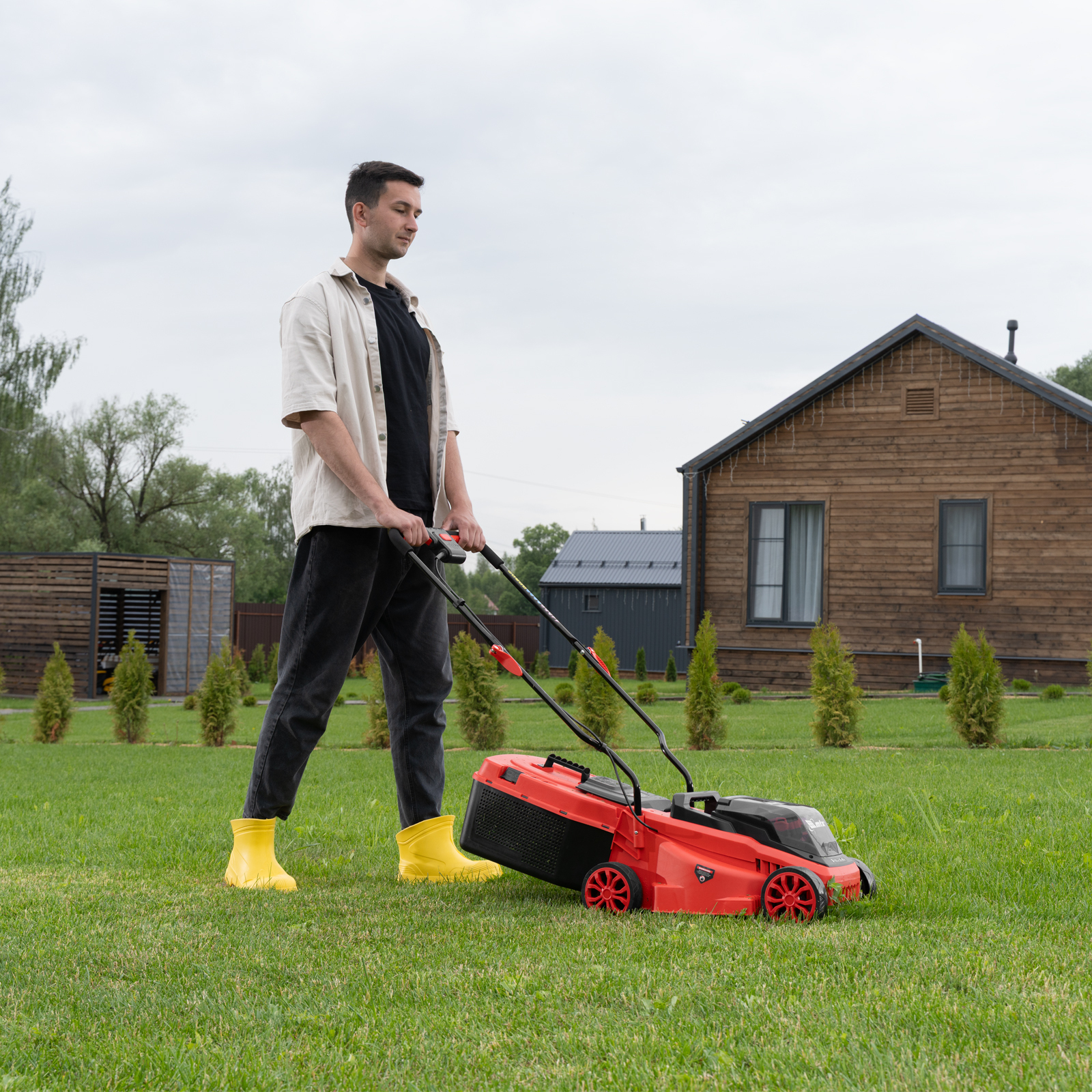 - Небольшой вес 9,6 кг — пластиковая дека не утяжеляет конструкцию, газонокосилку легко направлять.