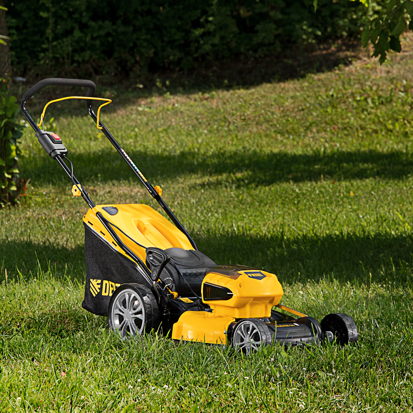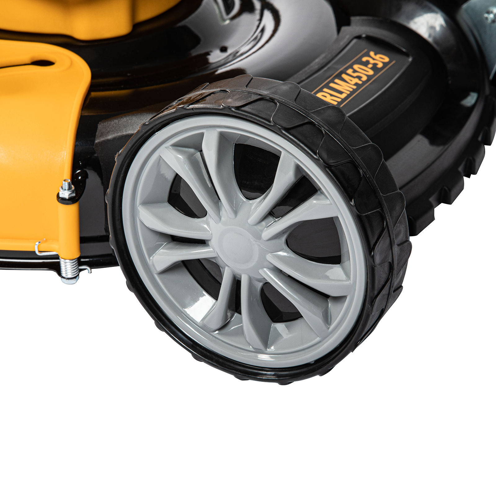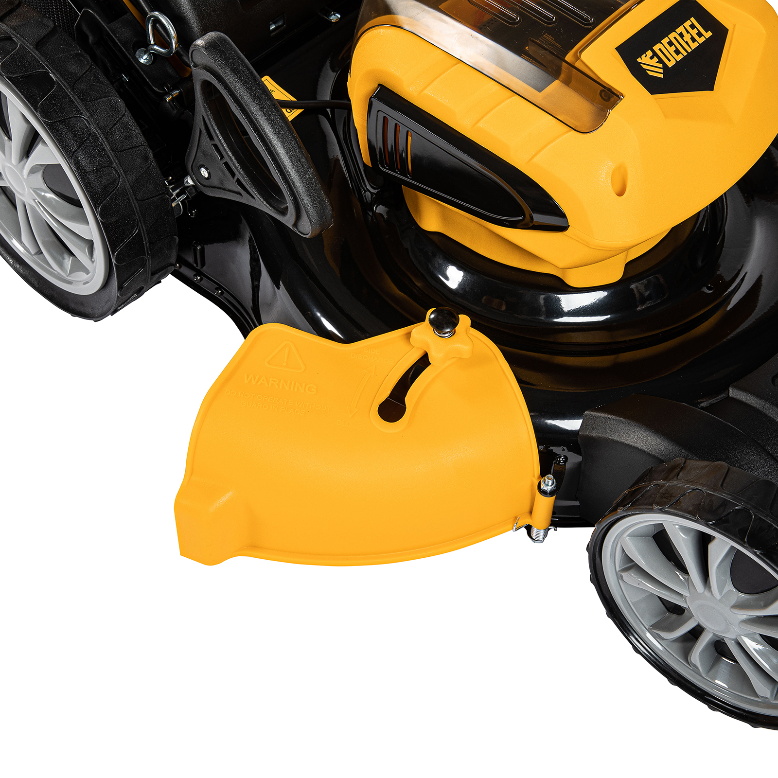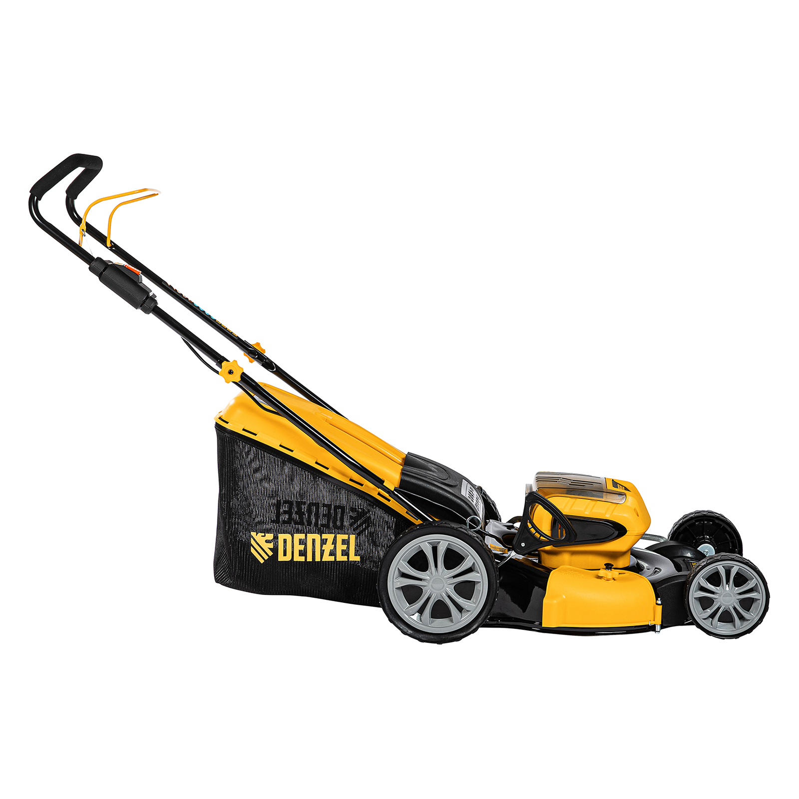 Бесщеточная аккумуляторная газонокосилка Denzel RLM450-36 58910 работает от двух батарей Li-Ion суммарным напряжением 36 В и емкостью 4 Ач, оснащена объемным травосборником на 40 л и обеспечивает ширину скашивания 450 мм за один проход. Машина предназначена для ухода за газоном и подрезания травы на небольших приусадебных участках. Высокоэффективный бесщеточный двигатель позволяет скашивать больше травы на одном заряде АКБ. 7-ступенчатая настройка высоты среза позволяет регулировать уровень скашивания травы в диапазоне 25-75 мм.,Аккумуляторная газонокосилка выгодно отличается от бензиновых и сетевых аналогов по уровню безопасности. Она не требует сложного техобслуживания, пользователю не нужно готовить топливную смесь, а управление будет комфортным даже для новичков.
