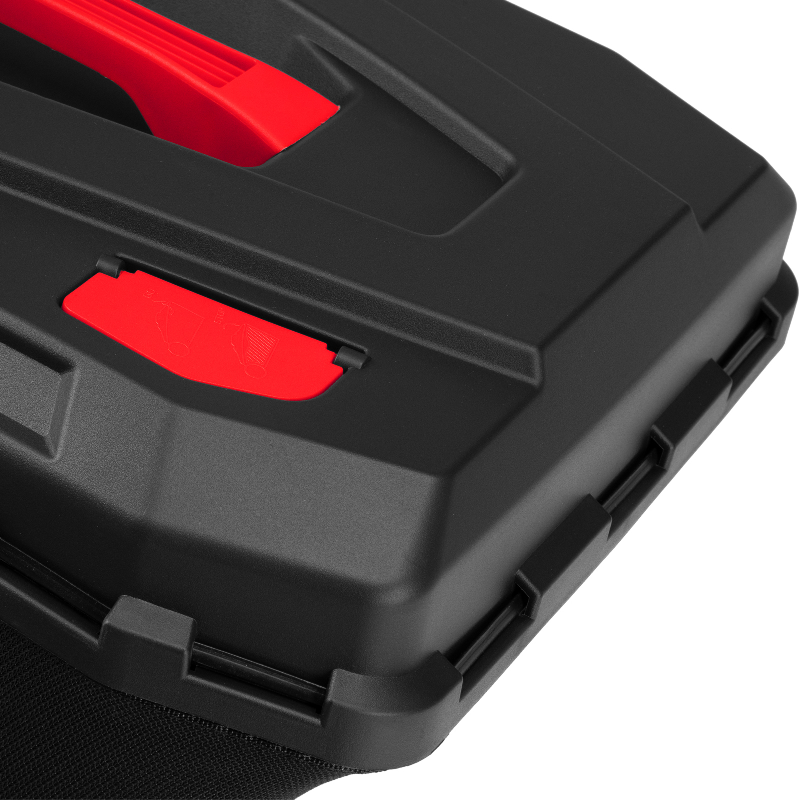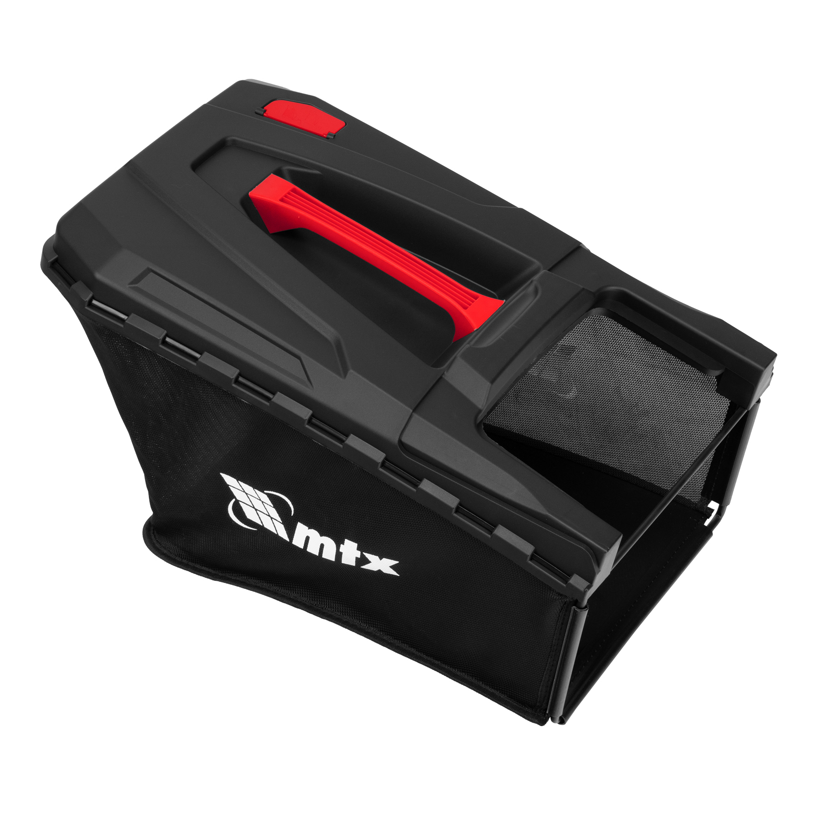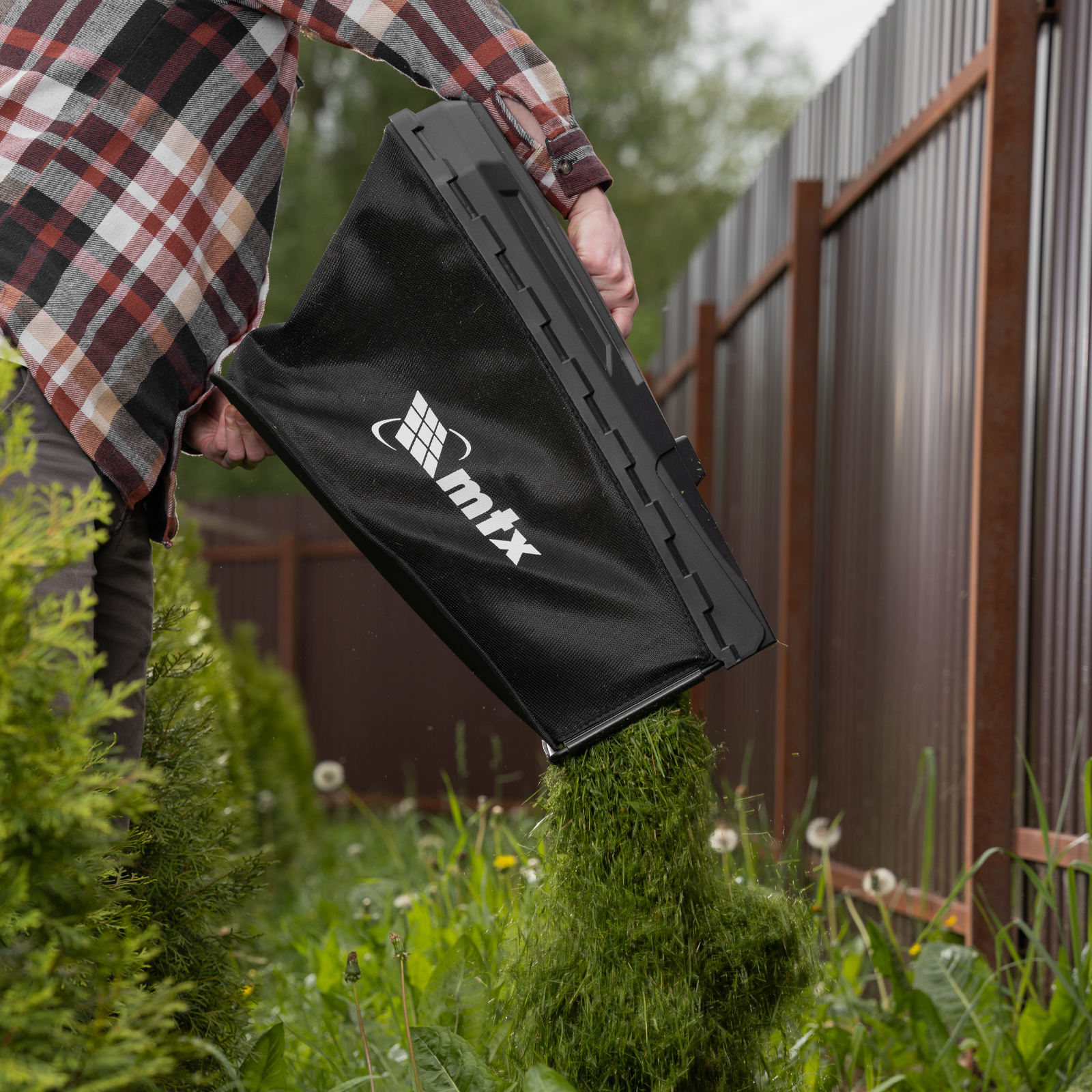 - Удобная эксплуатация и хранение — усиленная конструкция рукоятки позволяет комфортно управлять газонокосилкой, тканевый травосборник не утяжеляет конструкцию, а в сложенном состоянии не занимает много места.