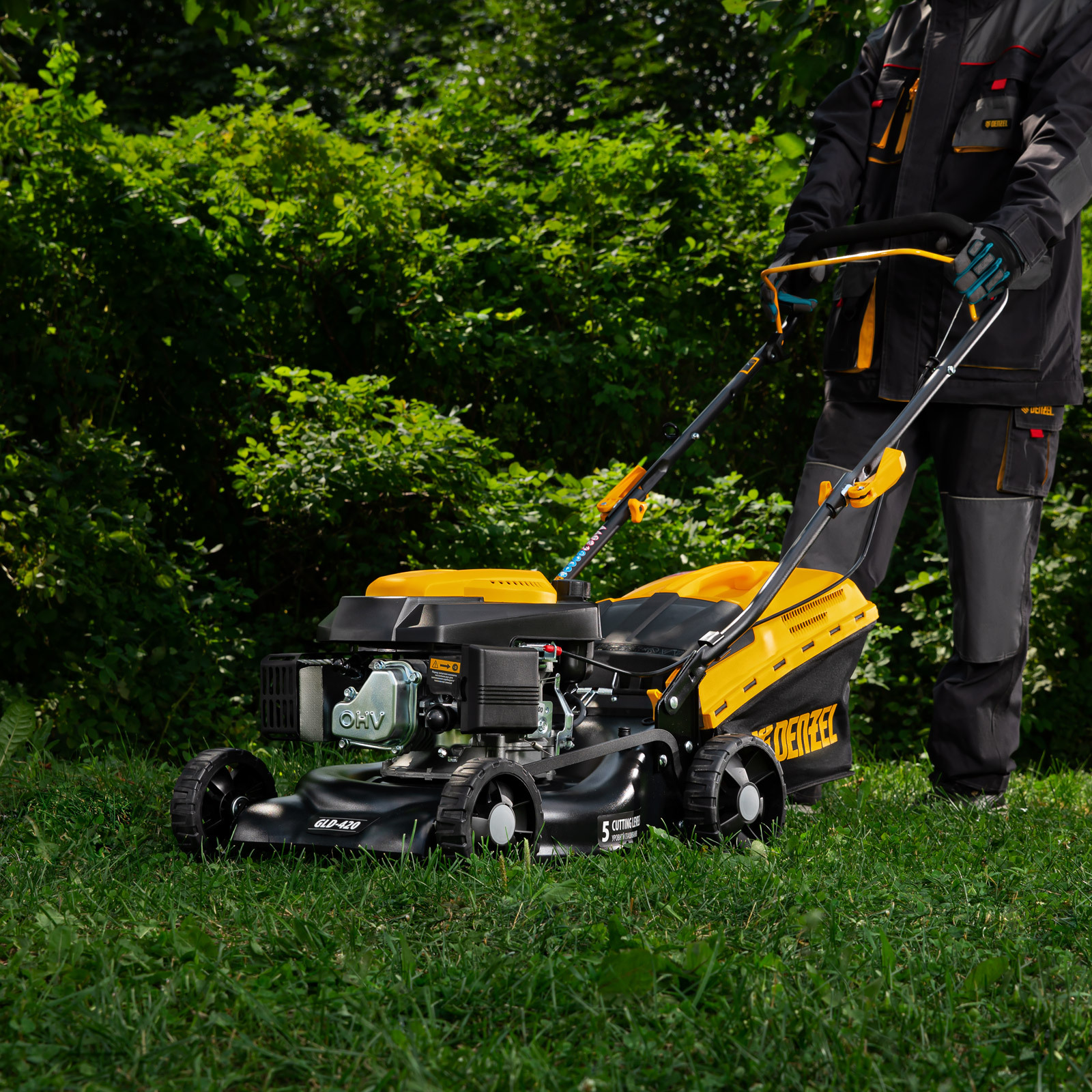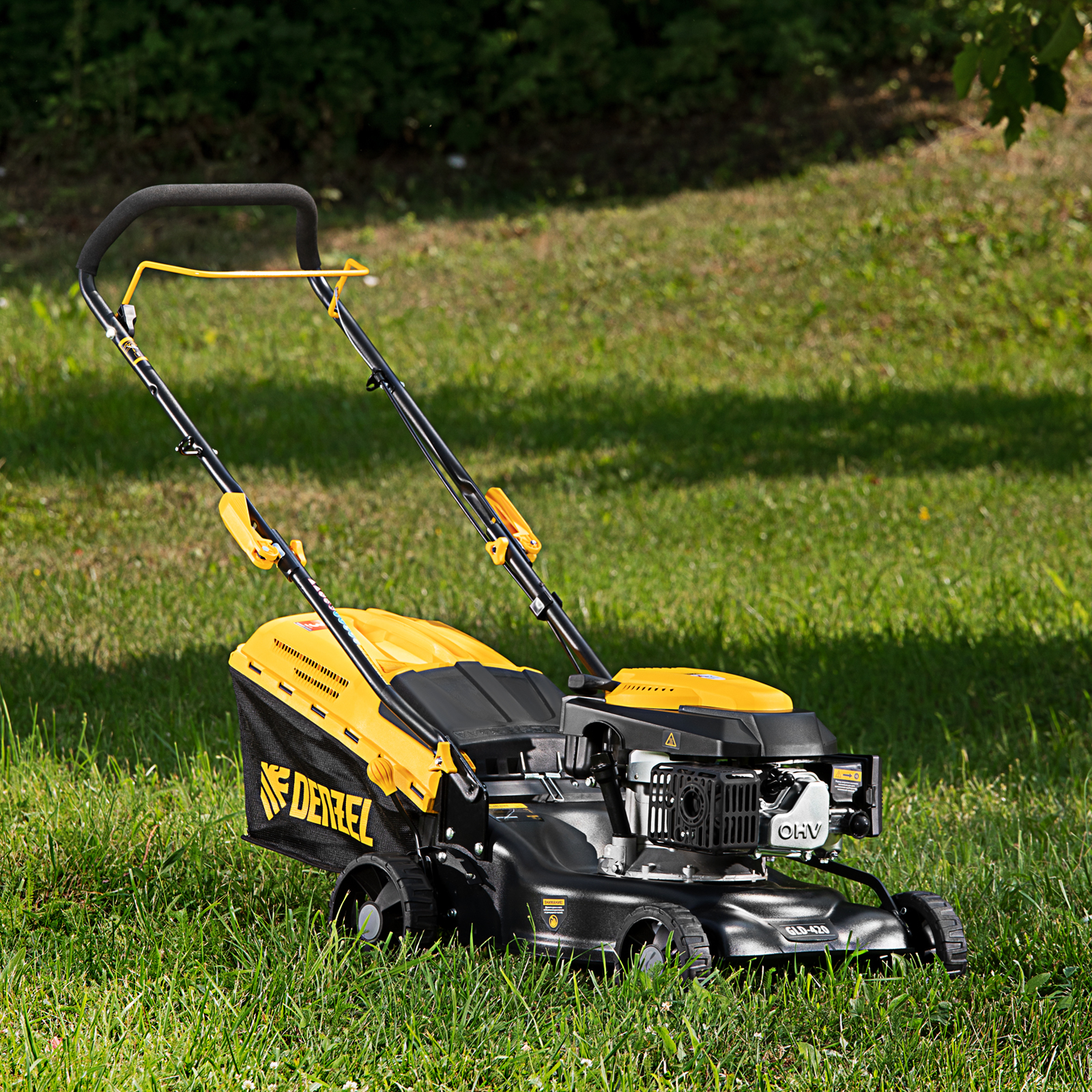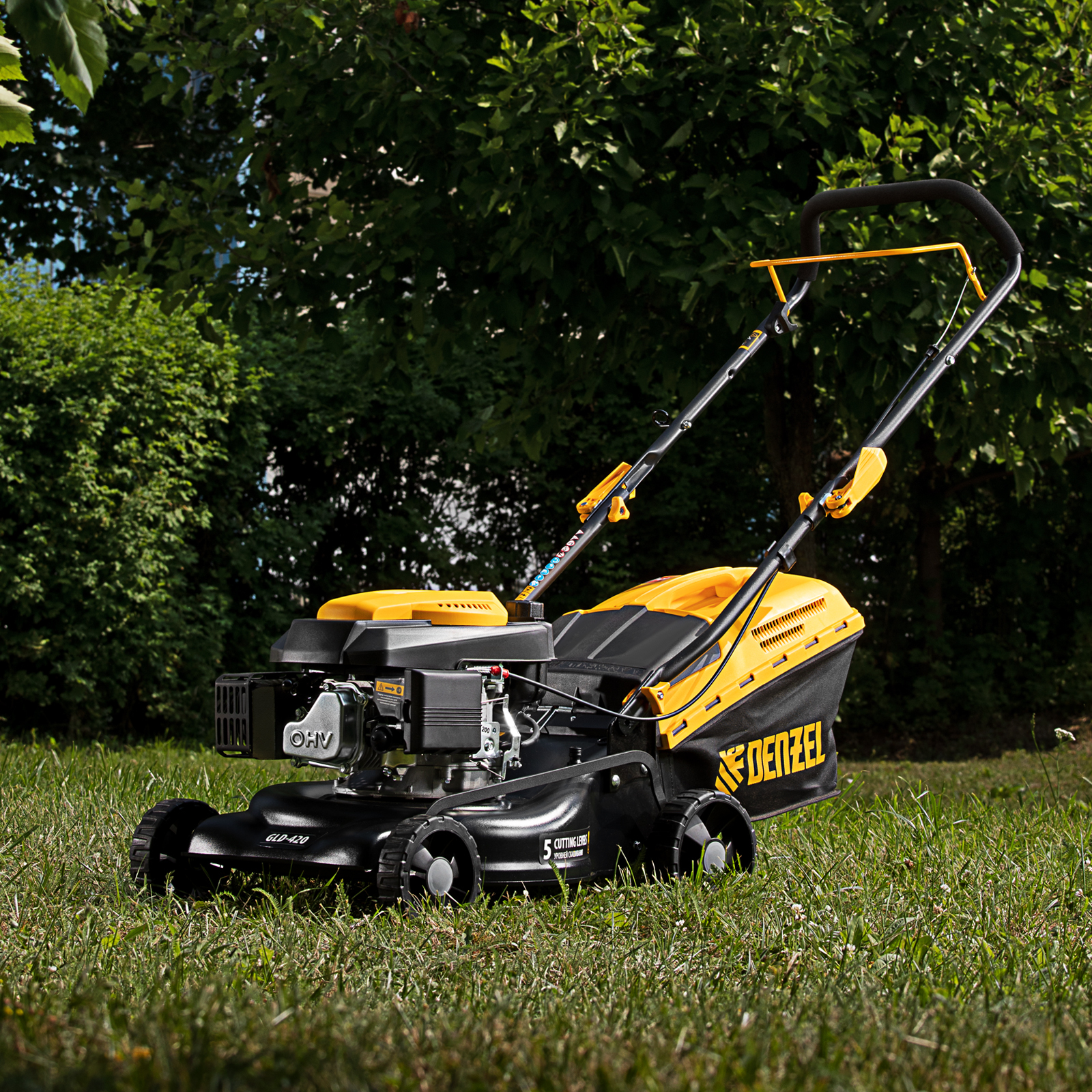 Бензиновая газонокосилка Denzel GLD-420 58805 с объемом двигателя 146 см куб., травосборником на 40 л, с шириной прохода 42 см, идеально подходит для благоустройства дачных территорий, огородов и ровных земельных участков. Ширина скашивания за один проход 42 см позволяет обрабатывать 1500 кв.м за 1 час. В зависимости от нагрузки, дозаправка топливного бака требуется через 40-60 минут. Мощность двигателя данной модели составляет 4,5 л.с.,Для создания идеальной дорожки, площадки для спортивных игр или другого типа покрова в газонокосилке предусмотрено 5 уровней скашивания. Поворачивая рычаг регулировки высоты покоса, Вы сможете самостоятельно выбрать желаемое значение в диапазоне 25-75 мм. Косилка способна срезать даже густую траву и стебли, потому что оснащена закаленным до твердости 45 HRC ножом.