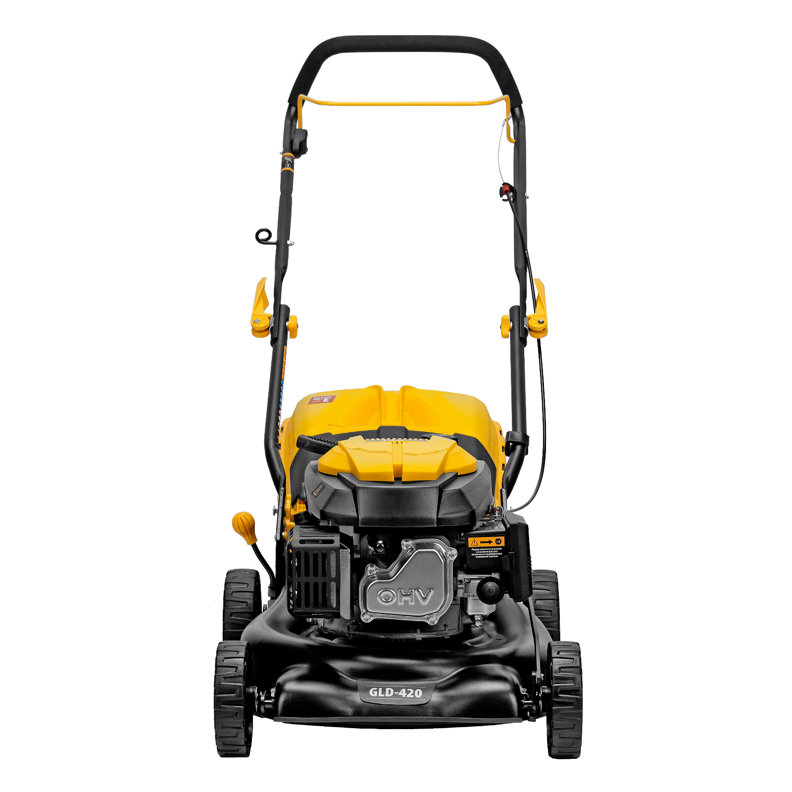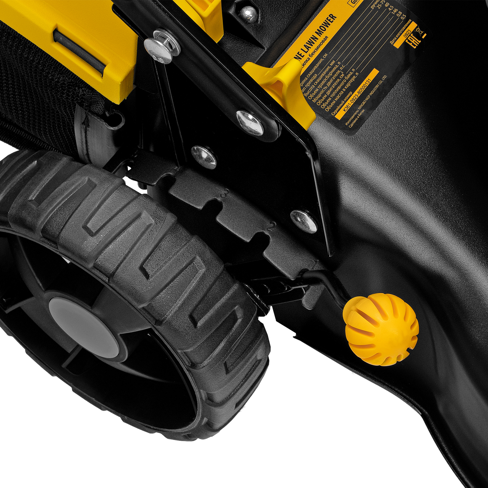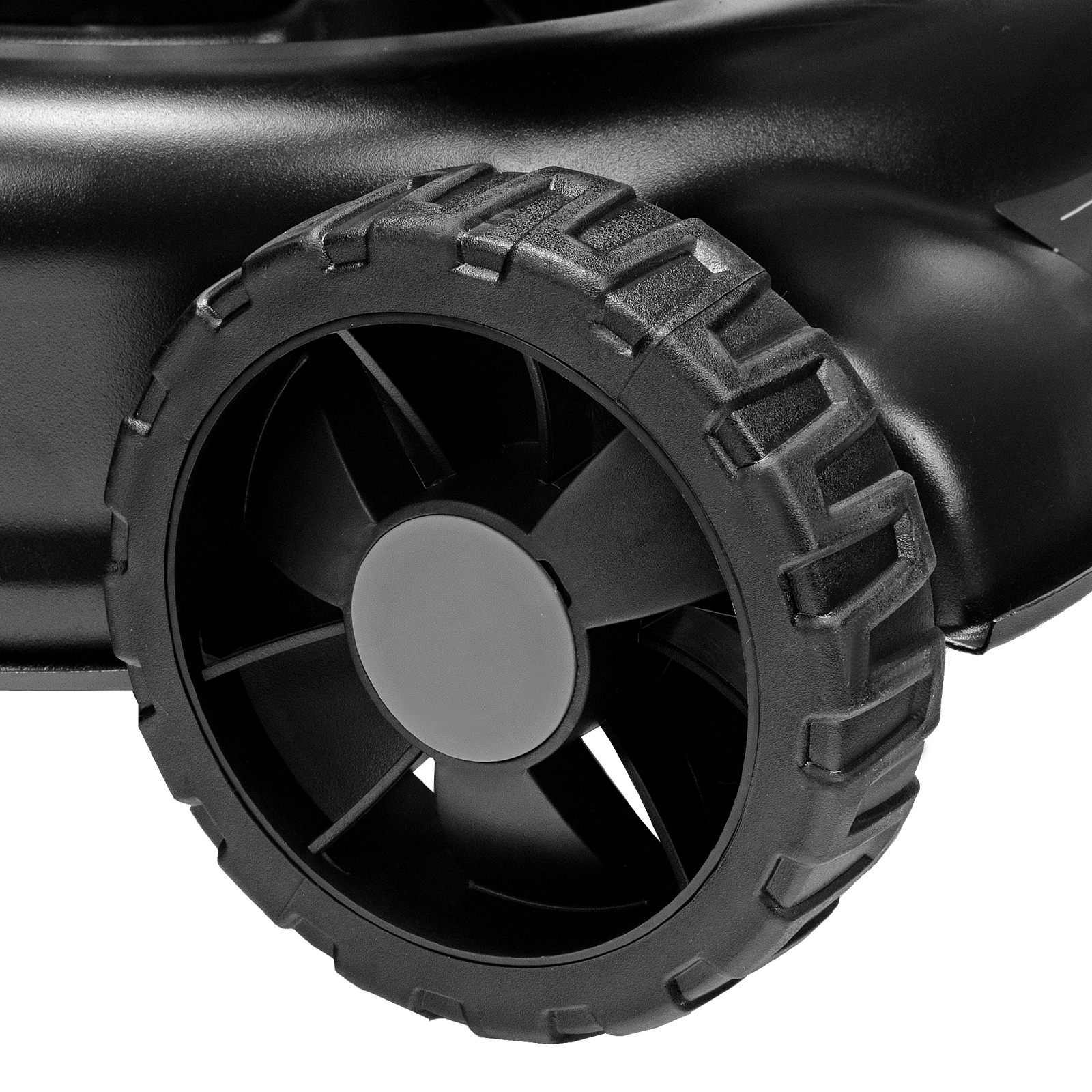 - Увеличенные задние колеса — косилка отличается хорошей проходимостью и при этом не повреждает газон.
