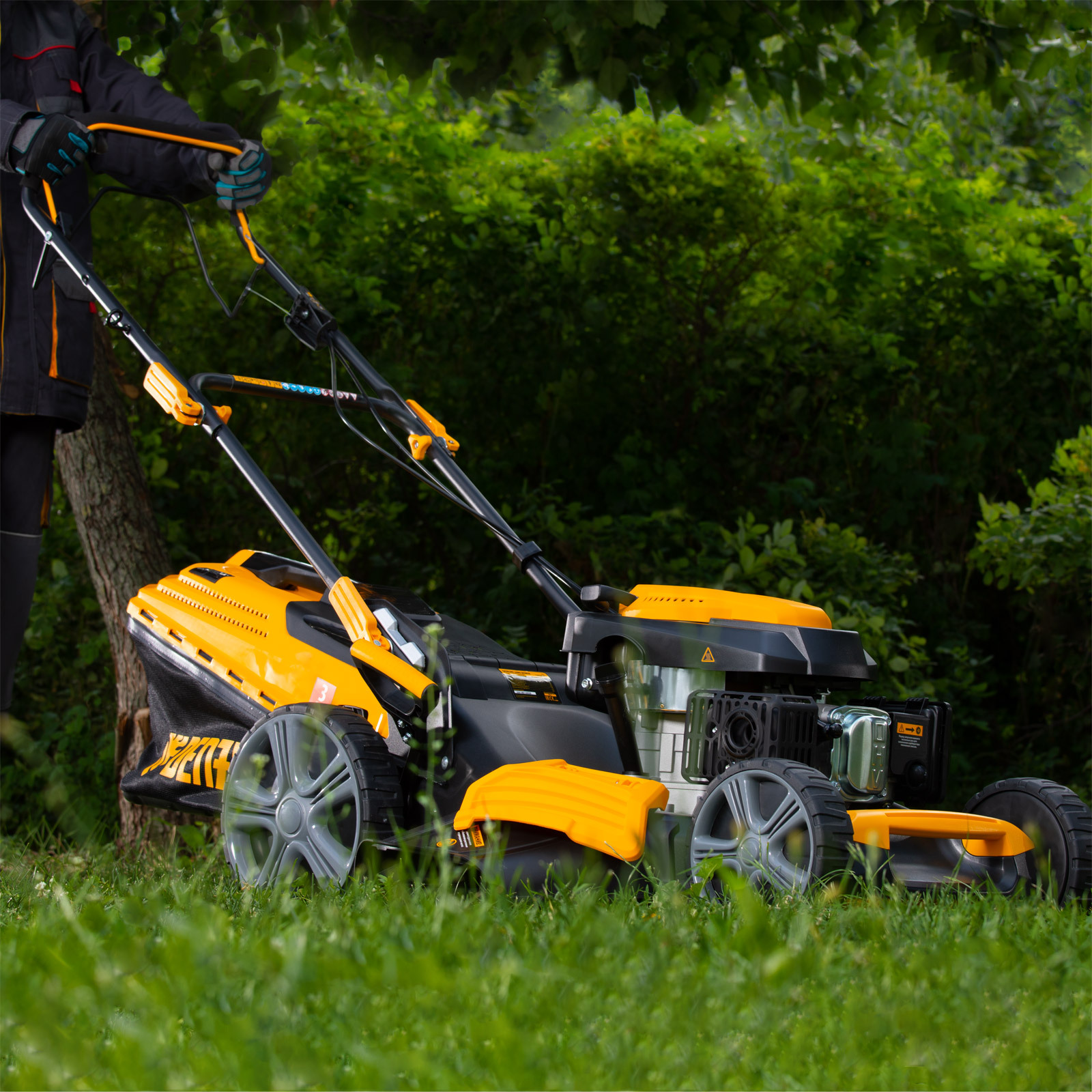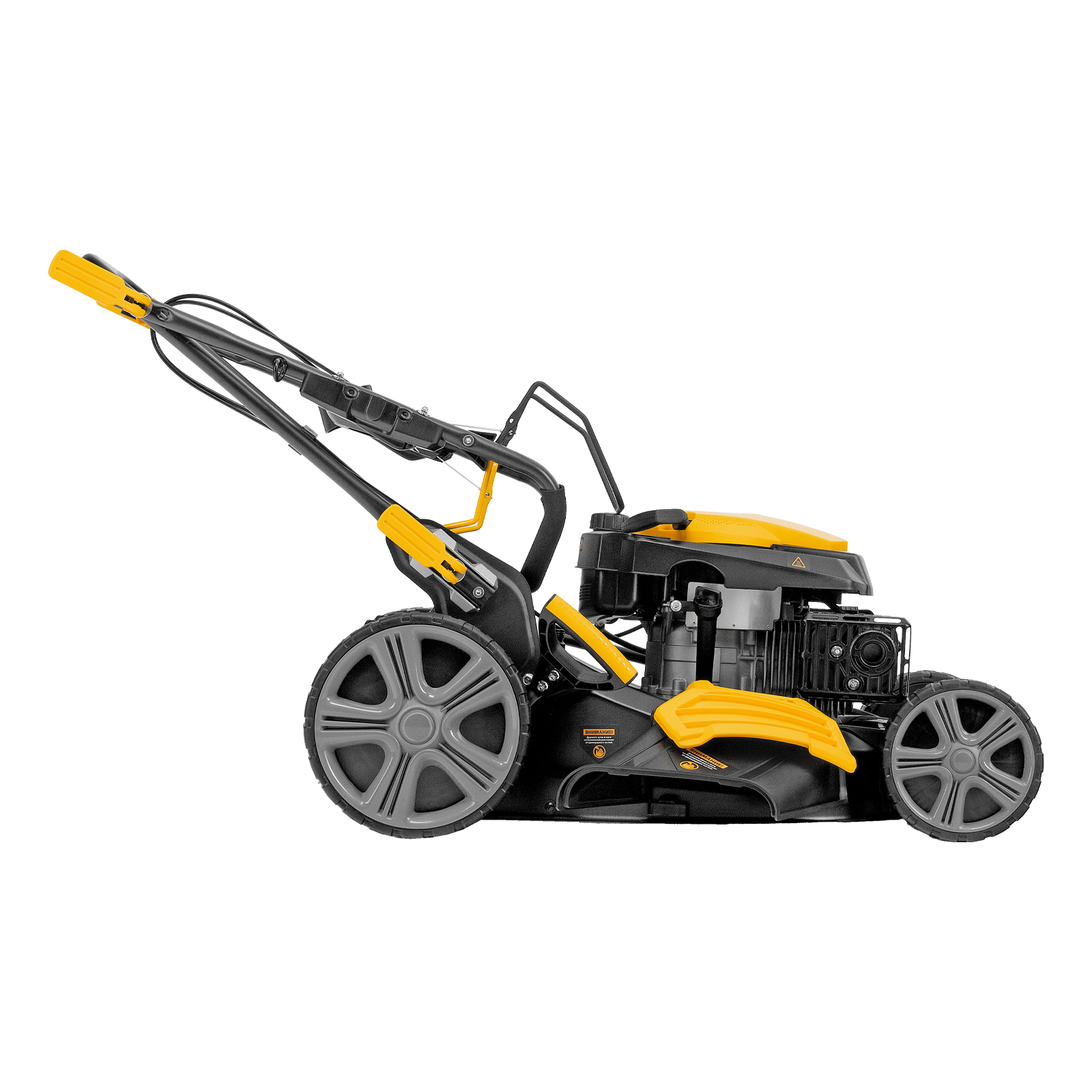 - 4 режима работы — сбор скошенной травы в травосборник, боковой или задний выброс, мульчирование (тщательное измельчение травы и распределение мульчи по приусадебному участку).