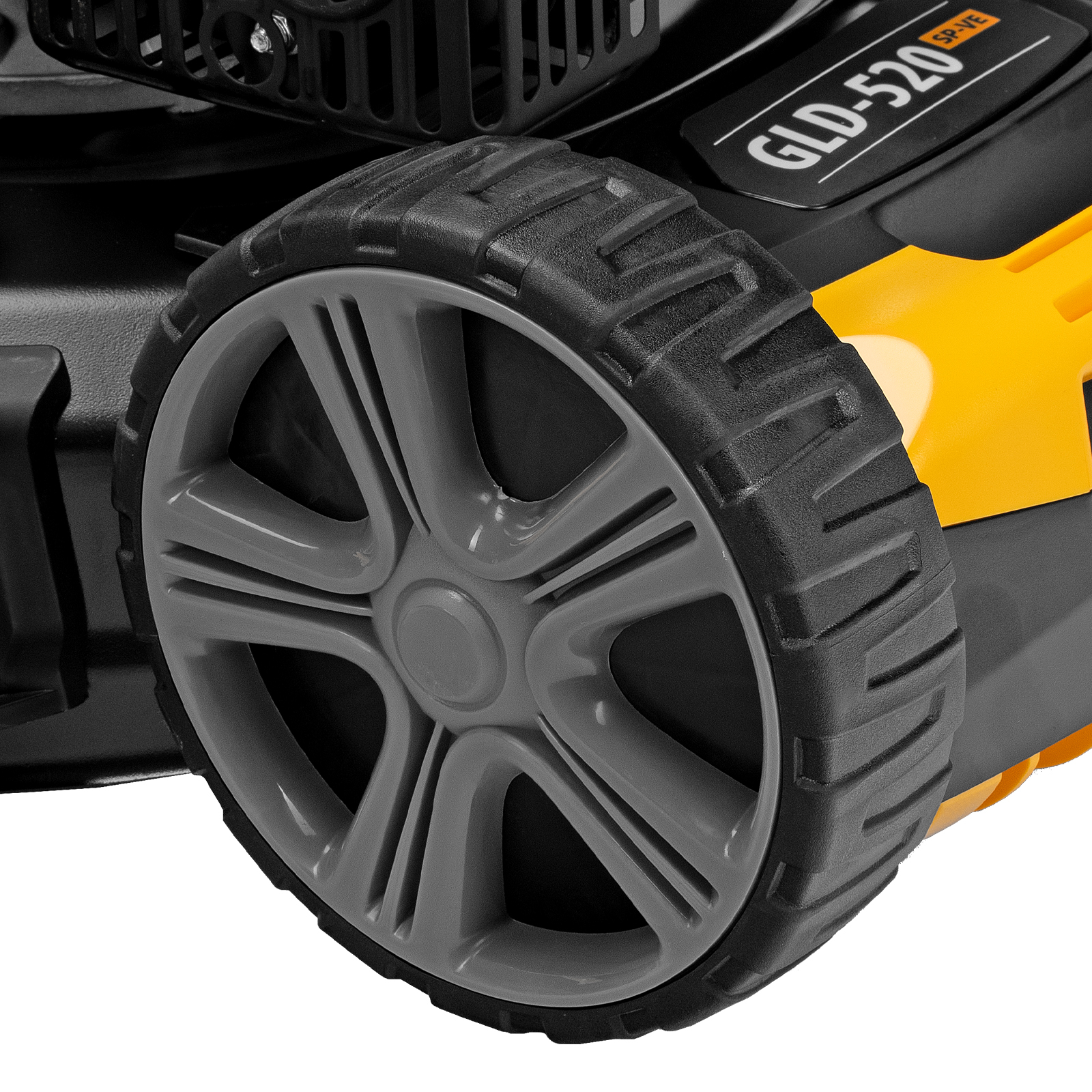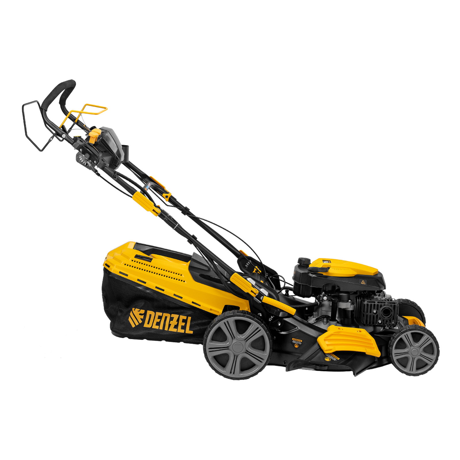 Бензиновая газонокосилка Denzel GLD-520SP-VE 58806 с приводом на колеса и вариатором оснащена двигателем объемом 196 см³ и электрическим стартом. Обеспечивает ширину скашивания 52 см за один проход и собирает траву в контейнер объемом 60 л. Идеально подходит для благоустройства дачной территории, обновления газонов и дорожек. Благодаря двигателю мощностью 6,5 л.с. справляется даже с густым бурьяном.,Ширина прохода составляет 52 см, за 1 час можно обработать участок площадью более 1800 м². Высота среза регулируется при помощи рычага в соответствии с типом газона (всего 7 уровней, от 25 до 75 мм). Можно получить идеально ровный и низко подстриженный парадный покров или площадку для спортивных игр, функциональную лужайку с травой 4-6 см или садово-парковый газон с максимально высокой растительностью.