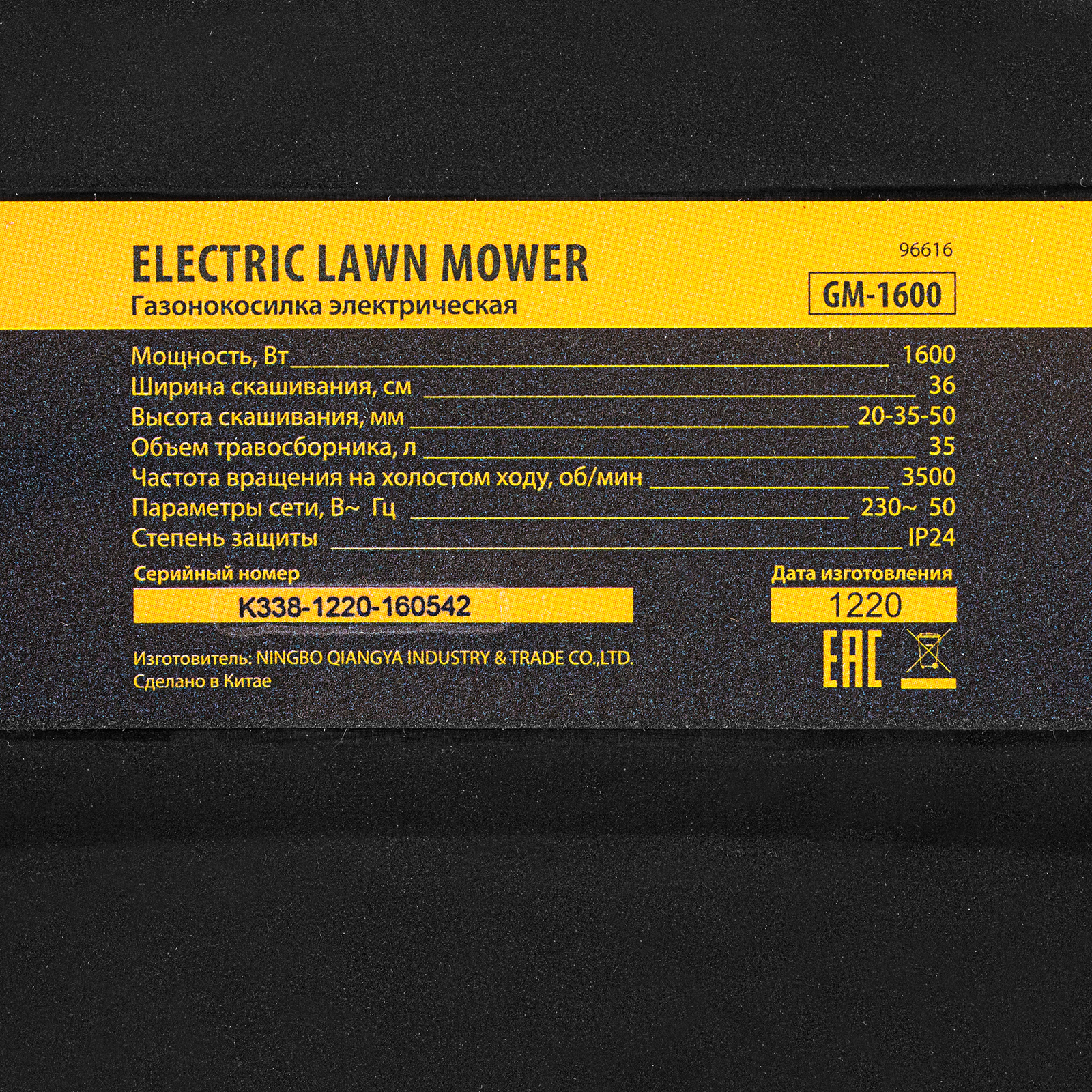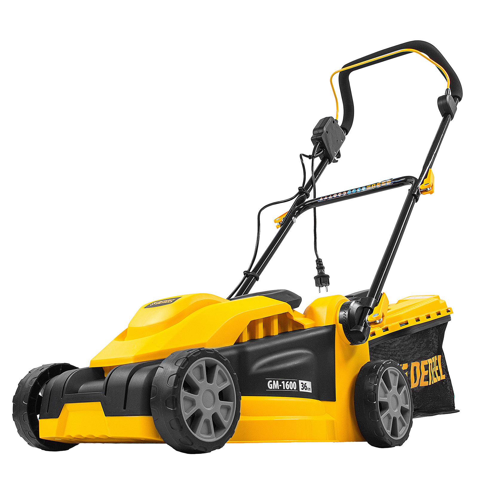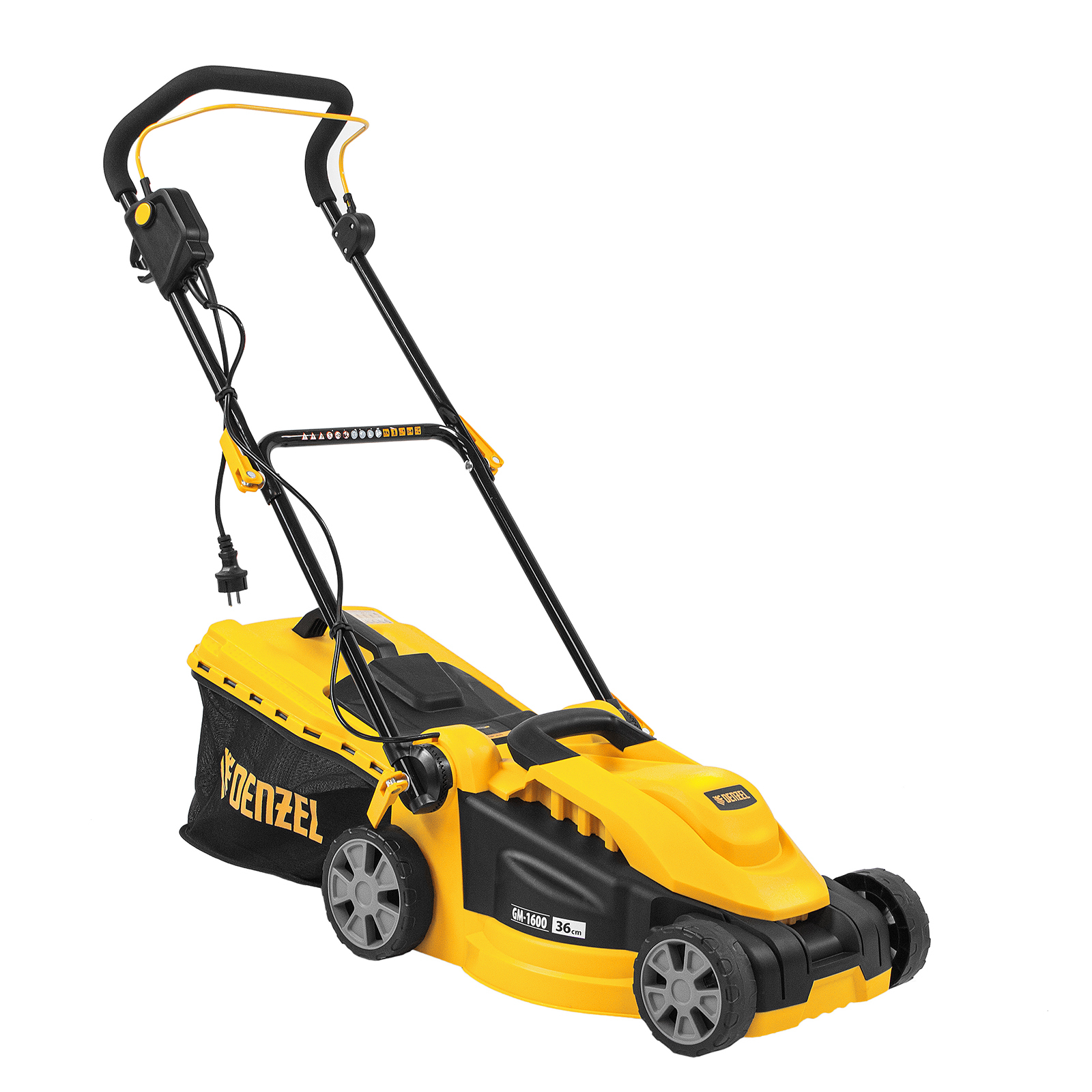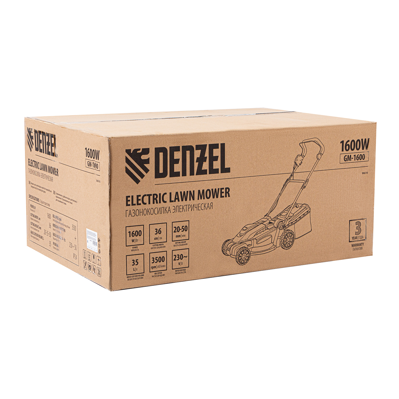 Газонокосилка электрическая GM-1600, 1600 Вт, ширина 36 см, 3 уровя, травосборник 35 л. Denzel