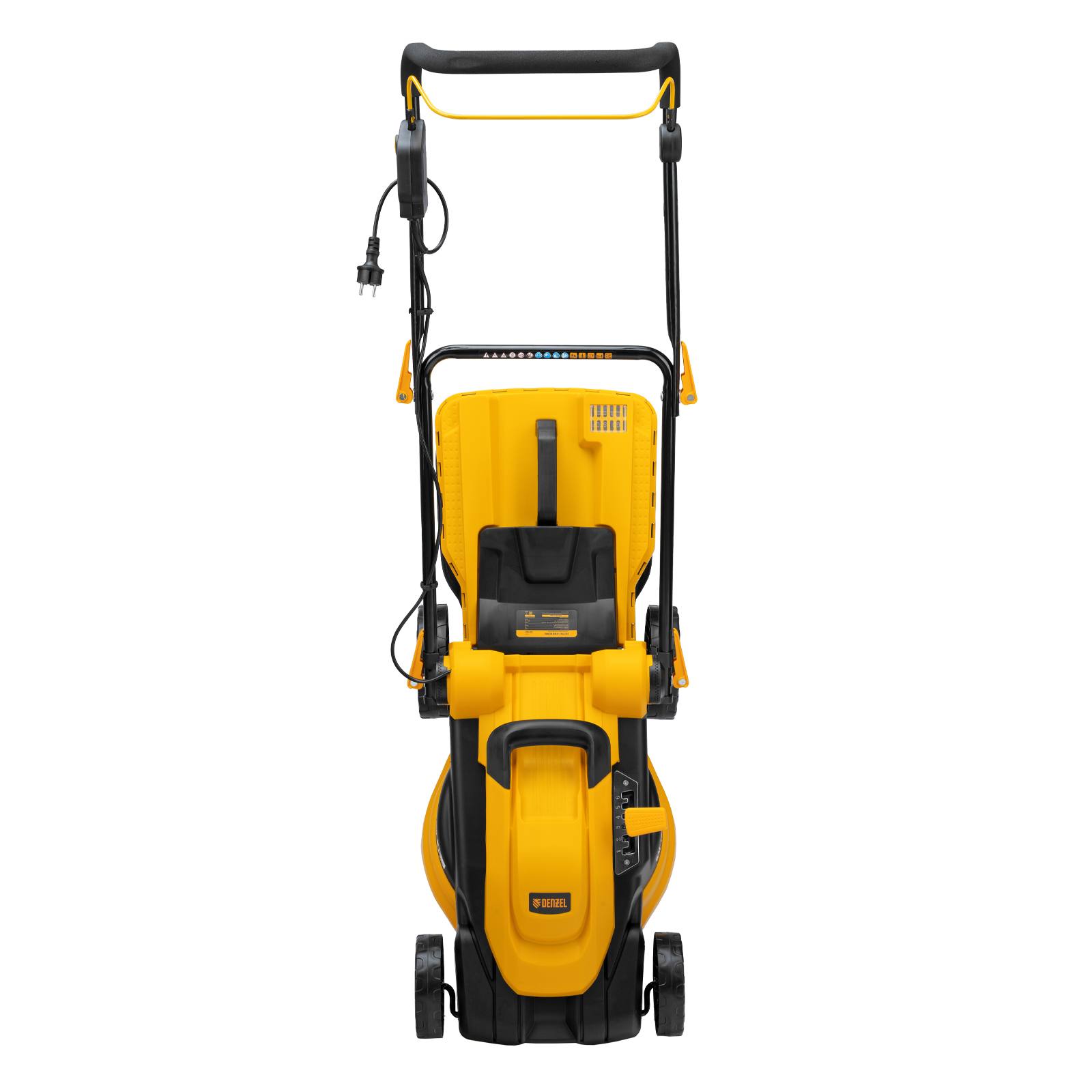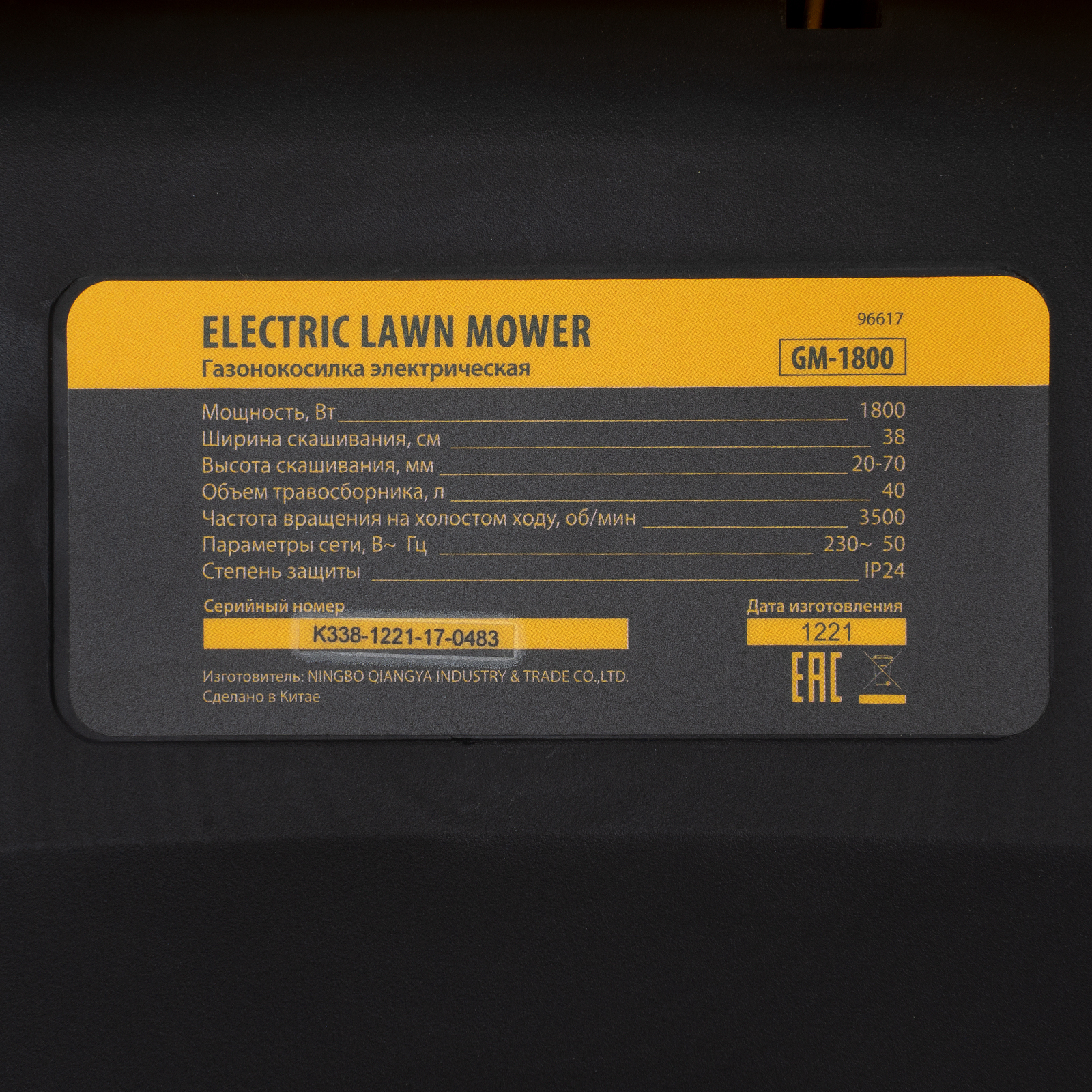 Электрическая газонокосилка Denzel GM-1800 96617 с 6 уровнями скашивания и травосборником на 40 л — маневренная и простая в управлении техника, обеспечивающая ширину скашивания 38 см. Быстро справляется с работой на площади примерно 6 соток, помогает оформлять аккуратный газон на дачном участке. Для достижения наилучшего результата предусмотрено 6 уровней скашивания травы: 20 мм, 30 мм, 40 мм, 50 мм, 60 мм и 70 мм. Ключевой особенностью является наличие функции мульчирования, которая позволяет измельчать траву в процессе скашивания для последующего использования в качестве компоста.,Косилка не требует особых навыков и сложного технического обслуживания — не нужно менять масло и свечи, заливать и сливать бензин, долго заводить и прогревать двигатель. Электродвигатель мощностью 1800 Вт работает тихо и без вредных выхлопов, он экологичен и экономичен.