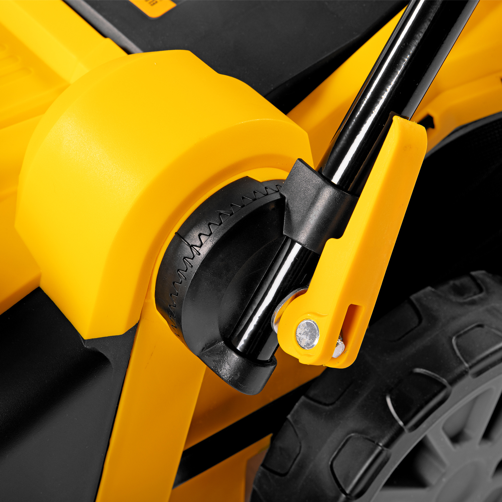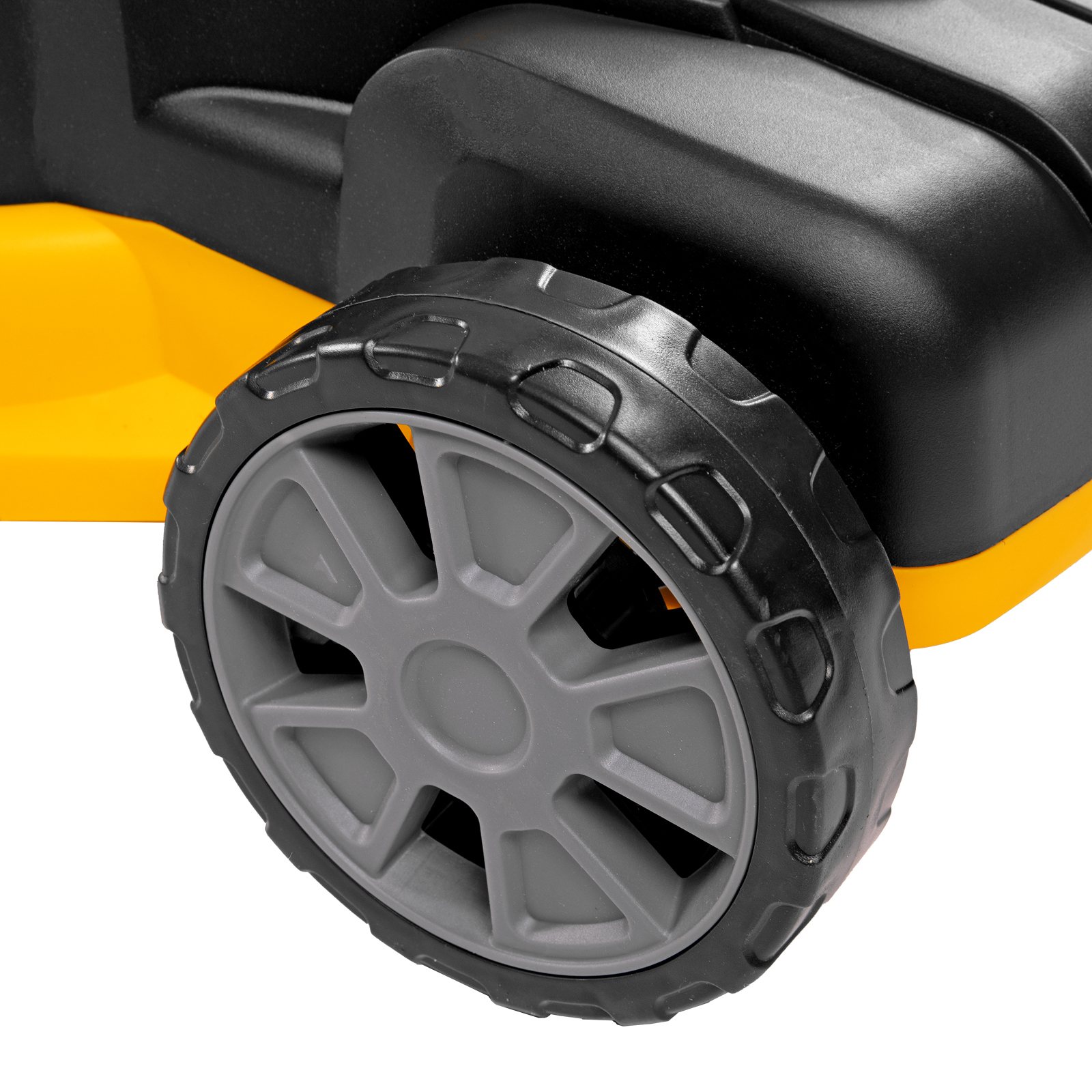 - Маневренность — широкие колеса позволяют удобно перемещать газонокосилку по участку и не приминают траву.