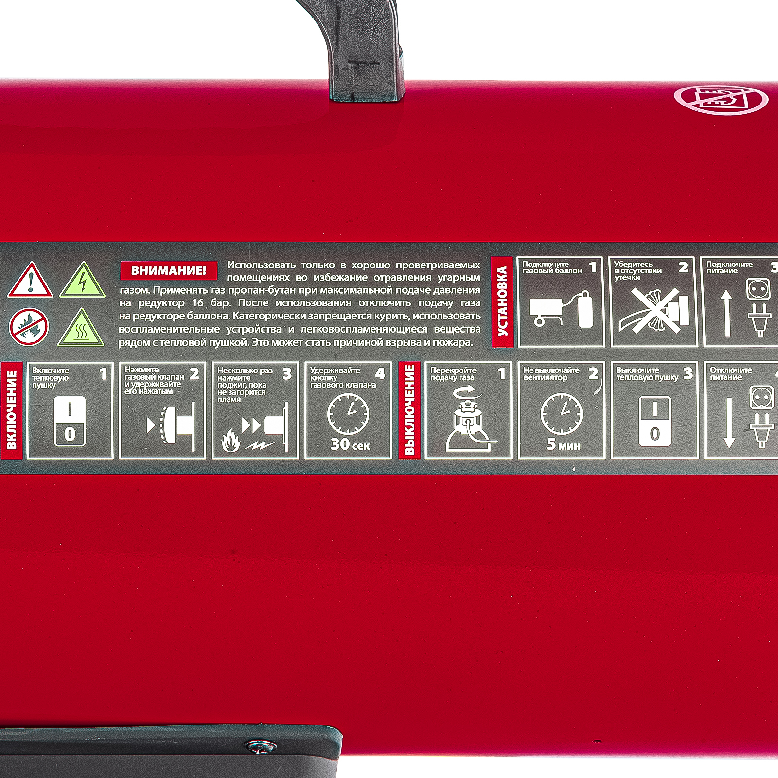 Влагозащита — выключатель питания закрыт кожухом, внутренние элементы изолированы от попадания брызг воды по стандарту IPX4.|Удобная транспортировка — тепловая пушка весит 3,4 кг, в комплект поставки входит специальная рукоятка.