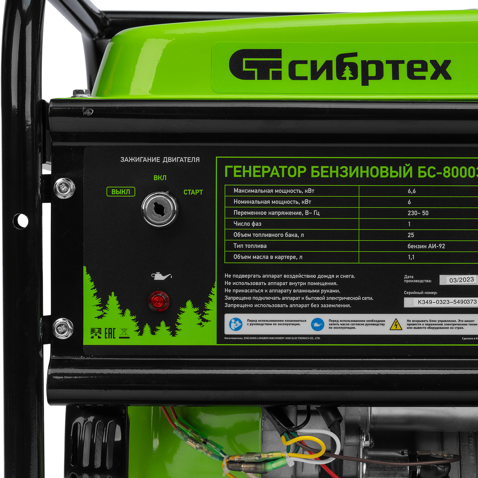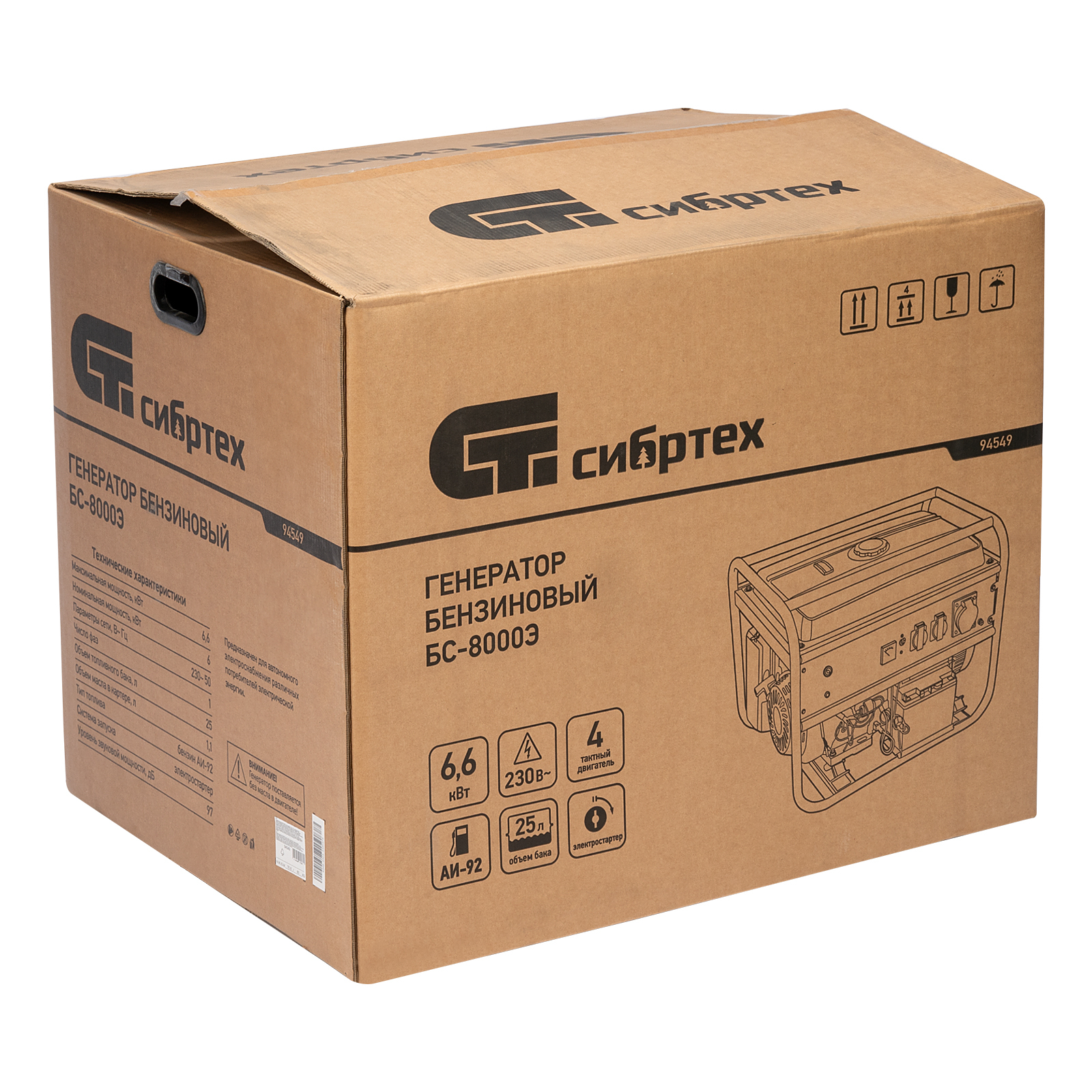 Генератор бензиновый БС-8000Э, 6,6 кВт, 230В, четырехтактный, 25 л, электростартер Сибртех