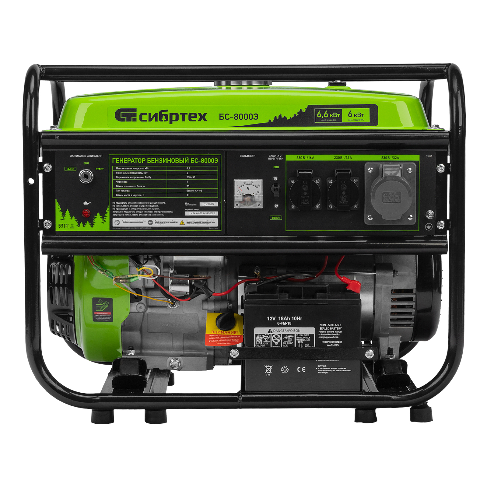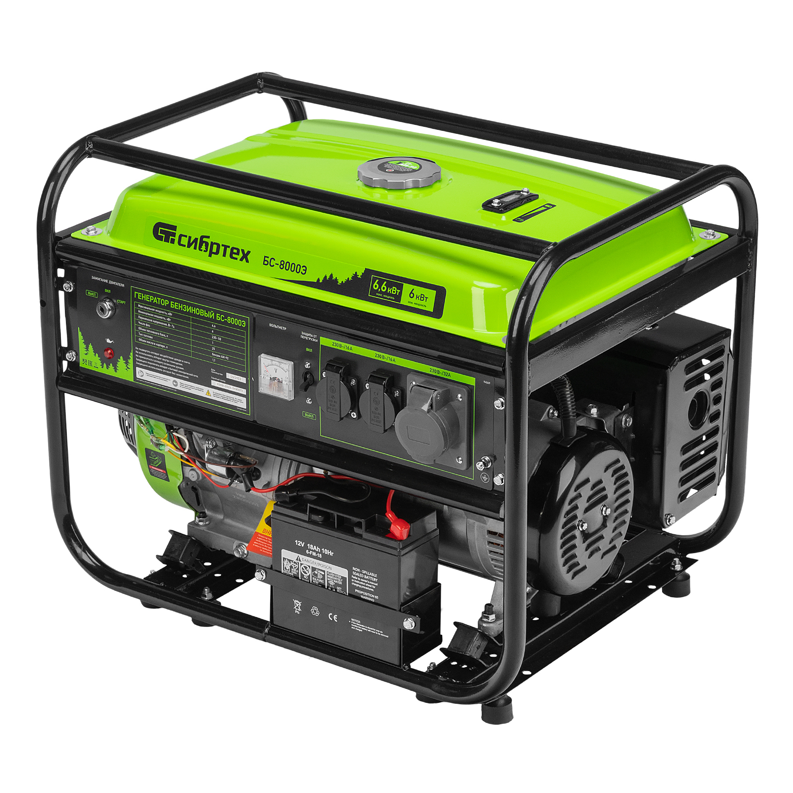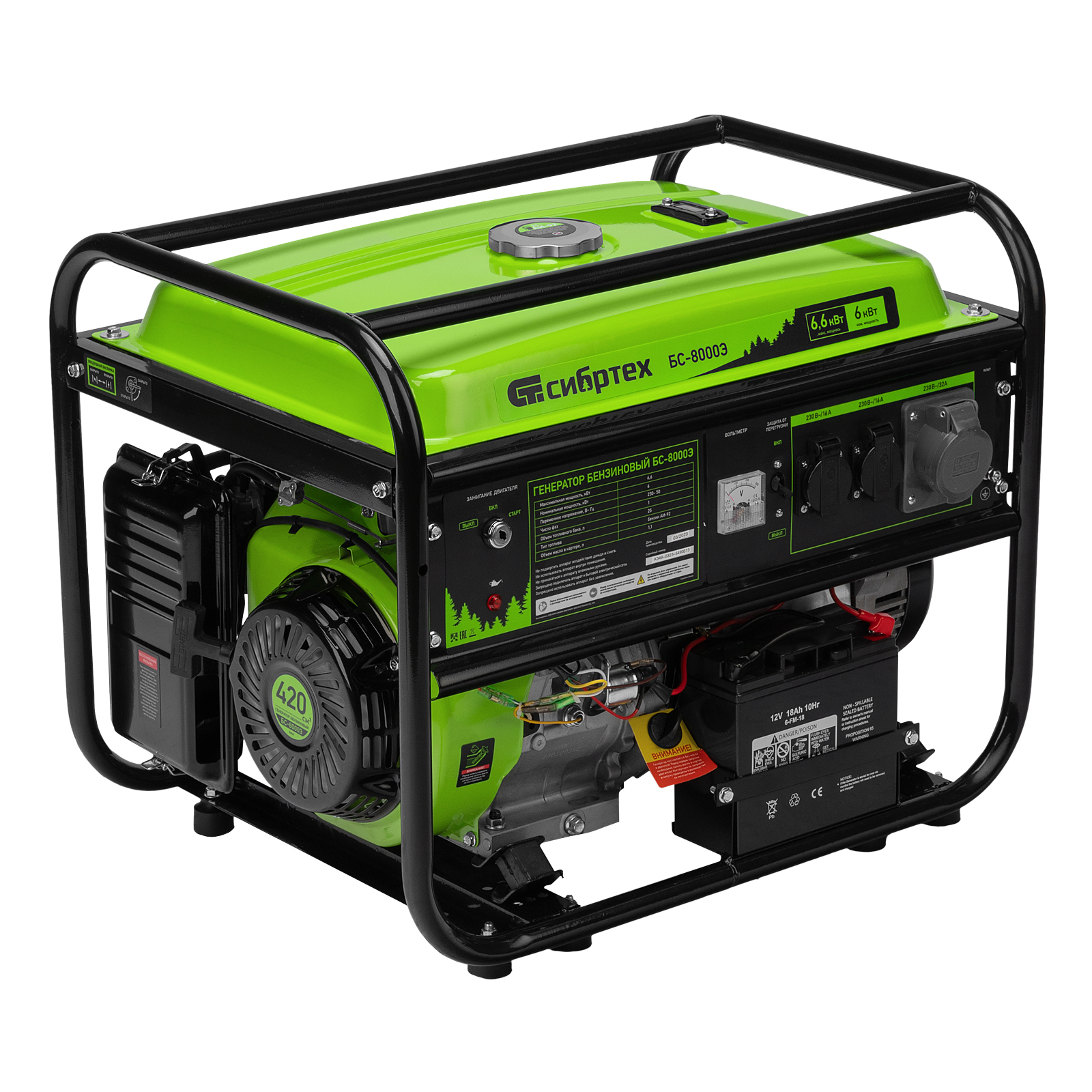 Бензиновый генератор Сибртех БС-8000Э 94549 мощностью 6,6 кВт, с 4-тактным двигателем, электростартером и баком объемом 25 л, выдает напряжение 230 В и является самым производительным в линейке. Подойдет для дачи, строительной площадки, мастерской, гаража или магазина. Благодаря мощности 6,6 кВт и наличию силовой розетки способен обеспечить бесперебойную работу нескольких потребителей одновременно, например, электрической плиты, холодильника, 5 ламп накаливания. Электростартер облегчает запуск — для начала работы достаточно просто повернуть ключ.