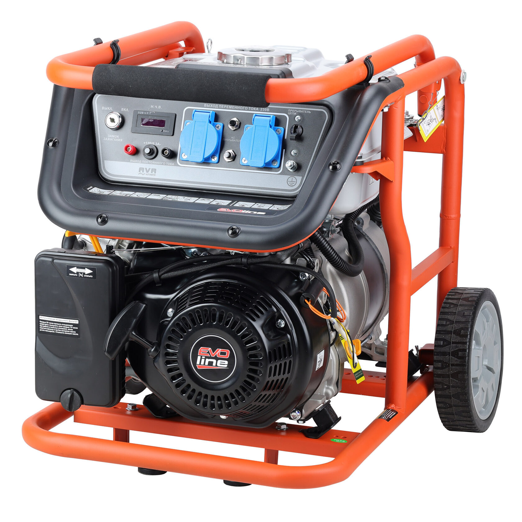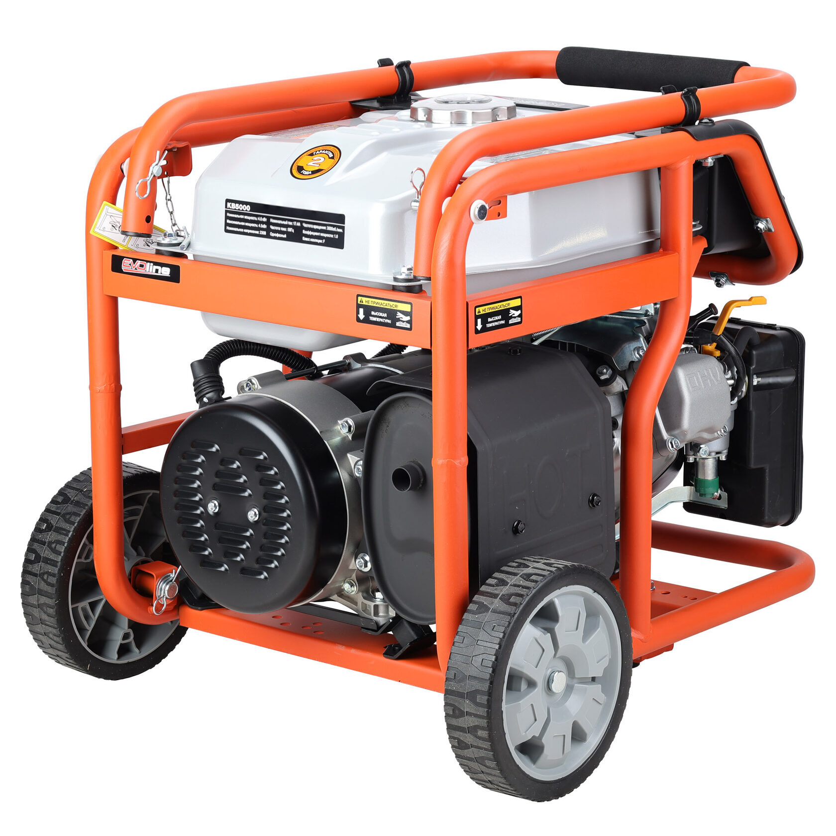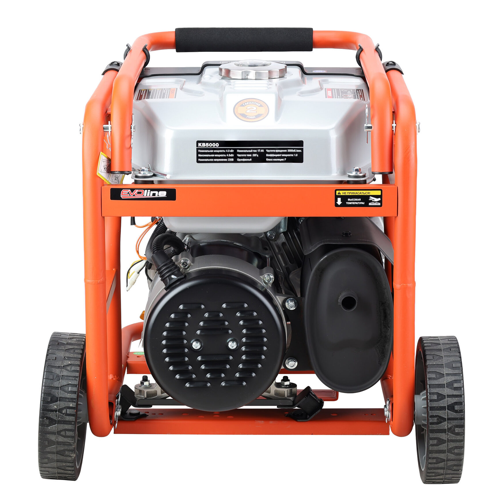 Электрогенератор EVOline KB 5000 – бензиновый однофазный (1 фазный) генератор с максимальной мощностью 4,5 кВА. Силовым агрегатом данной модели является надежный четырехтактный двигатель ZONGSHEN GB 270. Рама выполнена из высококачественной стали, которая служит не только для защиты двигателя, но и для удобной транспортировки электростанции. Объем топливного бака составляет 32 литра, что дает примерно 14 часов непрерывной работы в зависимости от нагрузки. Уровень шума при работе генератора составляет 74,5 дБ. Данная модель идеально подходит как для дома, так и для малого бизнеса. Оснащена транспортировочным комплектом с колесами, счетчиком мото-часов и 2-мя розетками, имеет размер (590 х 440 х 500 мм) и вес (55 кг). Гарантия составляет 2 года.