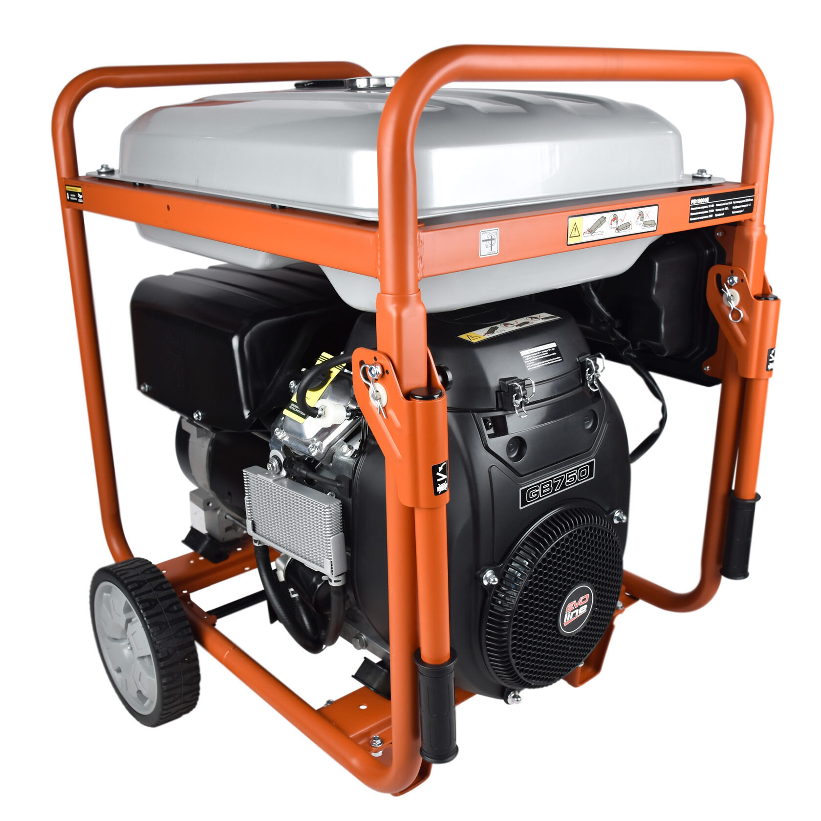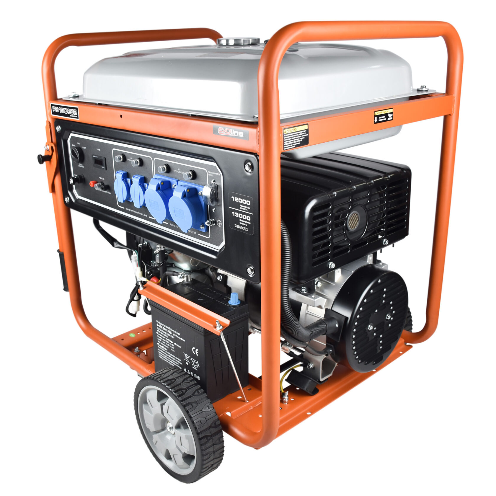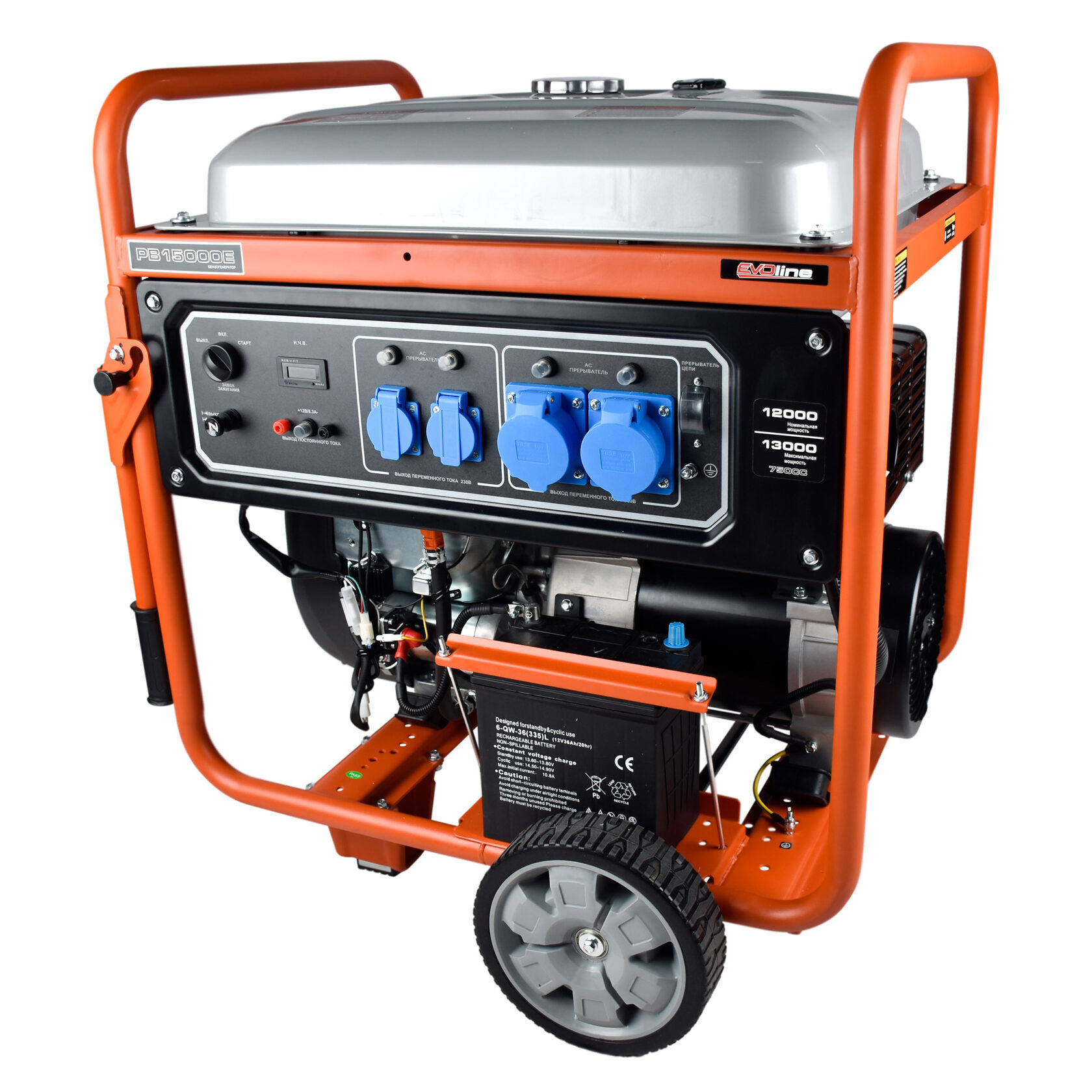 Однофазный бензогенератор EVOline PB 15000 E с двигателем GB 750 и регулятором напряжения AVR. Для комфортного запуска установлен электростартер. Бак, объёмом 55 литров обеспечивает долгую непрерывную работу. Генератор бензиновый EVOline PB 15000 E оборудован двумя розетками 16А и двумя силовые розетками 32А.Комплект для транспортировки с колесами облегчает транспортировку генератора.