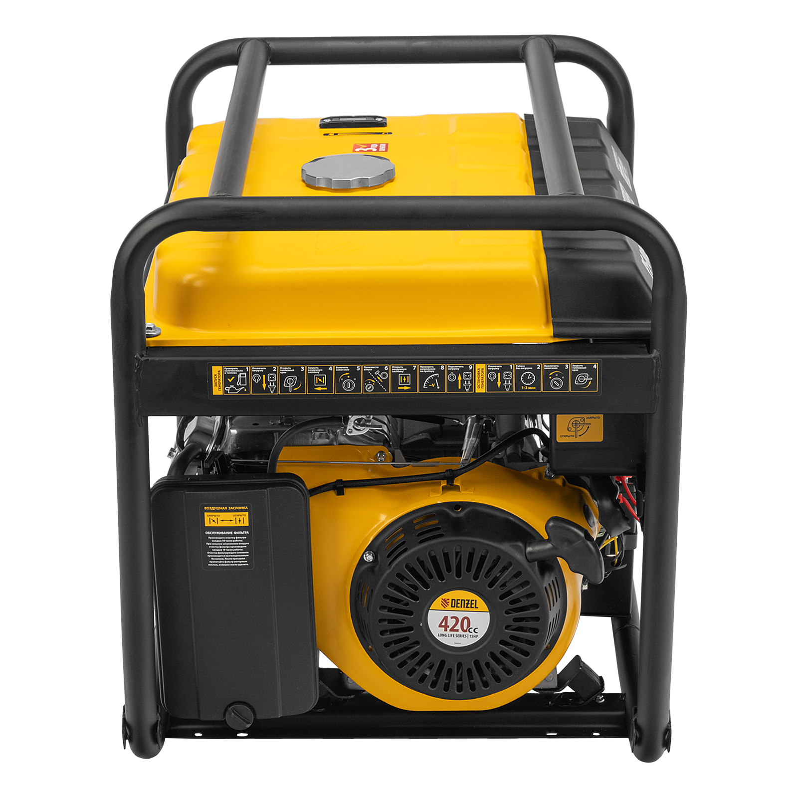 - Долговечность — двигатель повышенной мощности Denzel Long Life объемом 420 см3 обеспечивает стабильную работу генератора в течение длительного времени.