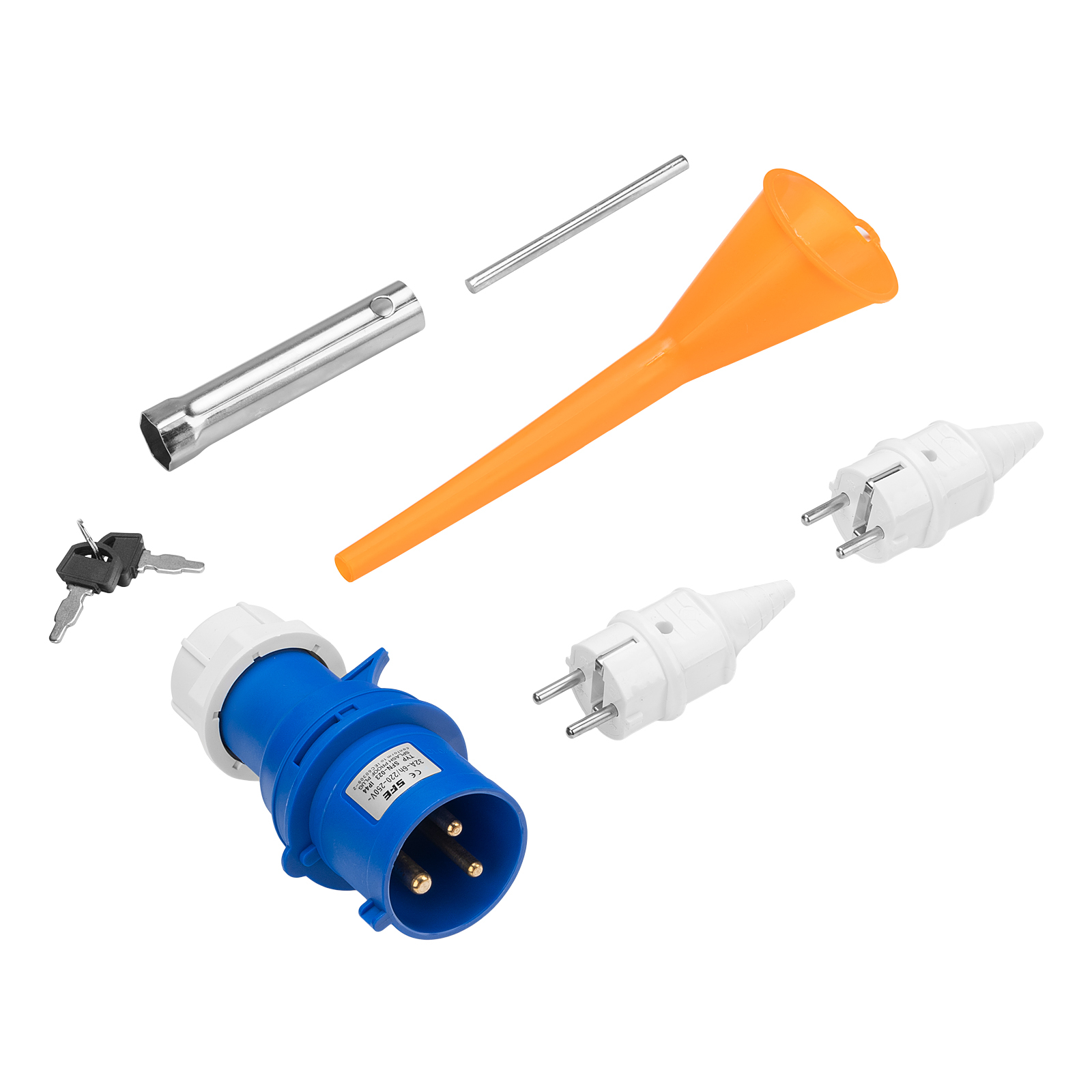 Генератор - 1 штКлюч свечной - 1 штКлюч зажигания - 2 штВилка 230В/16А - 2 штВилка 230В/32А - 1 штРуководство по эксплуатации с гарантийным талоном - 1 штБатарея аккумуляторная - 1 шт
